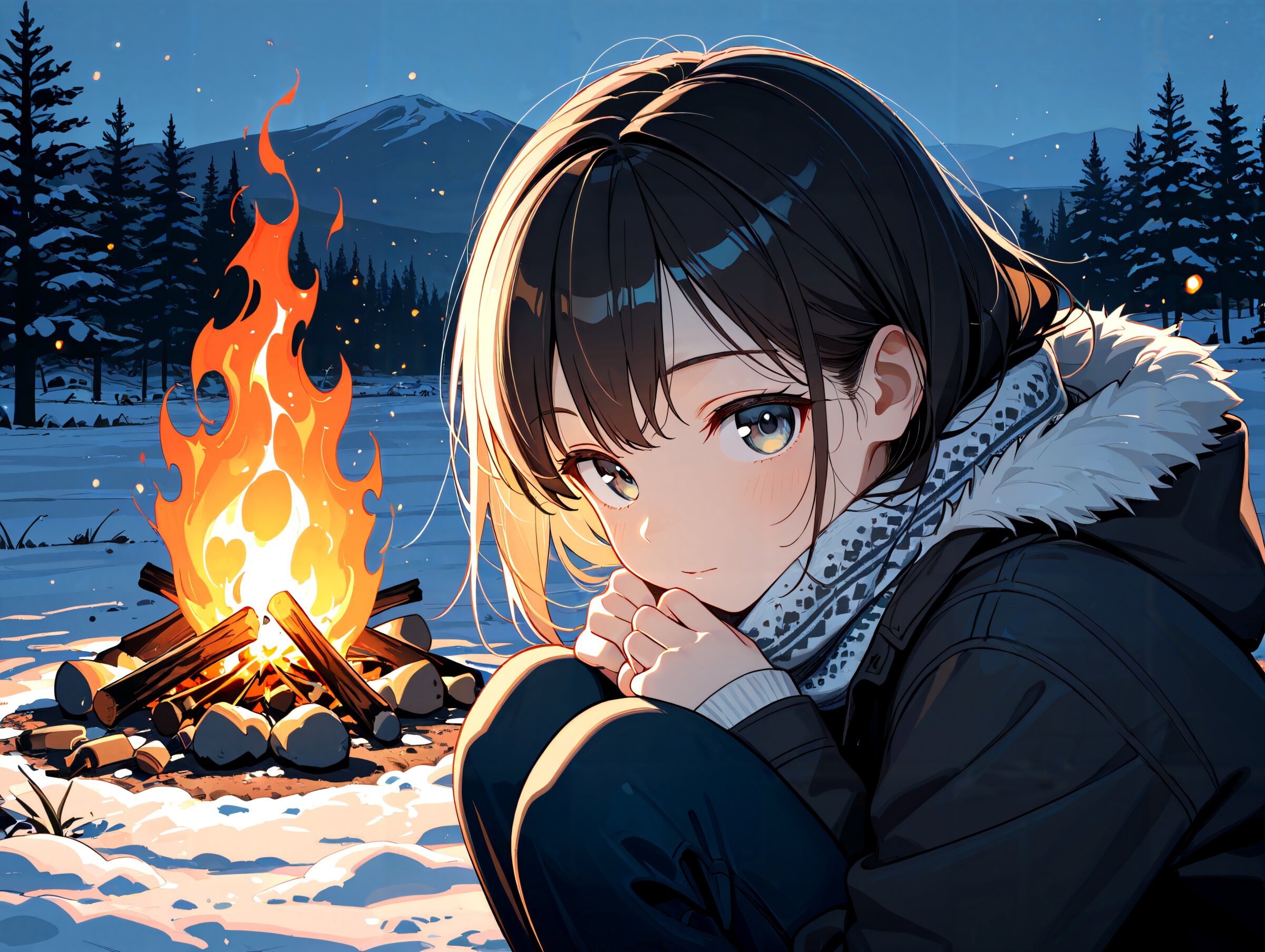 masterpiece,best quality,amazing quality,very aesthetic,high detailed skin,alluring high resolution,intricate detail,8k, cinematic lighting, winter wear,forest, fire,campfire, 1girl,face focus,close at viewer, from side,squatting,