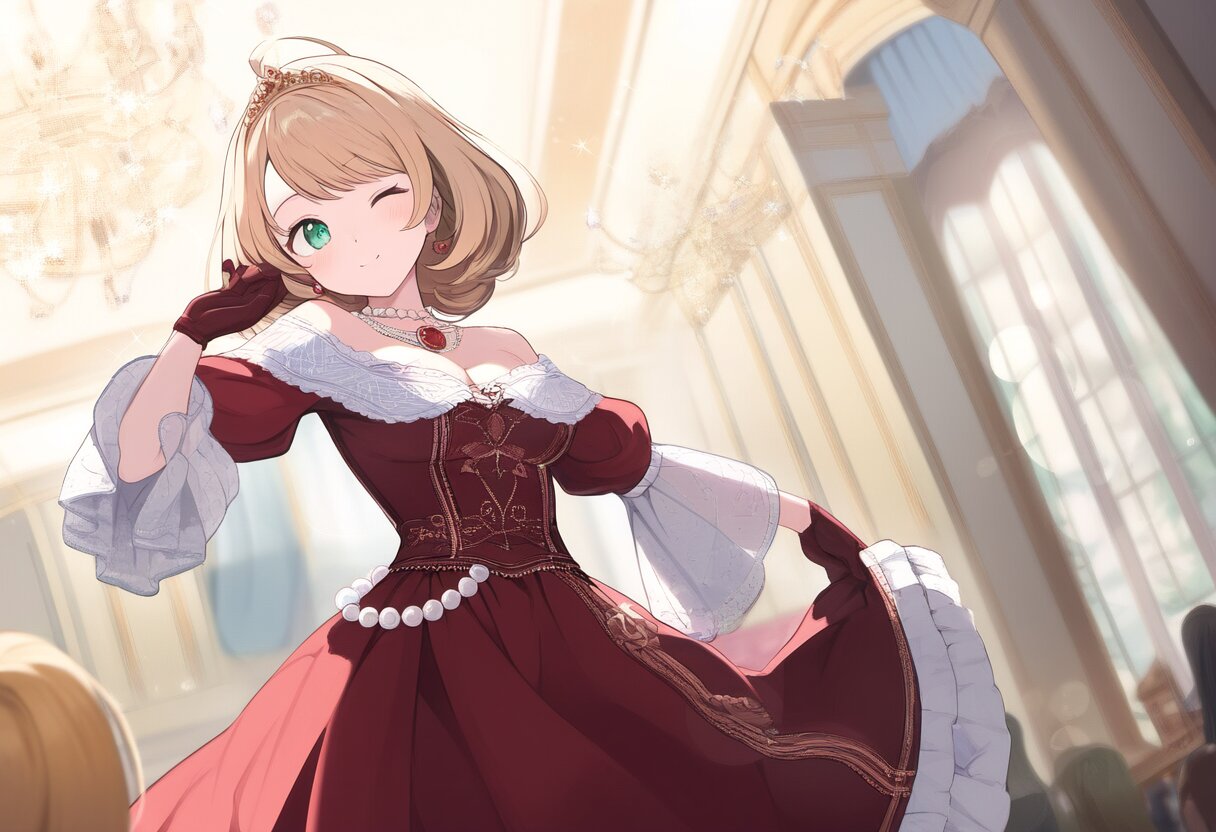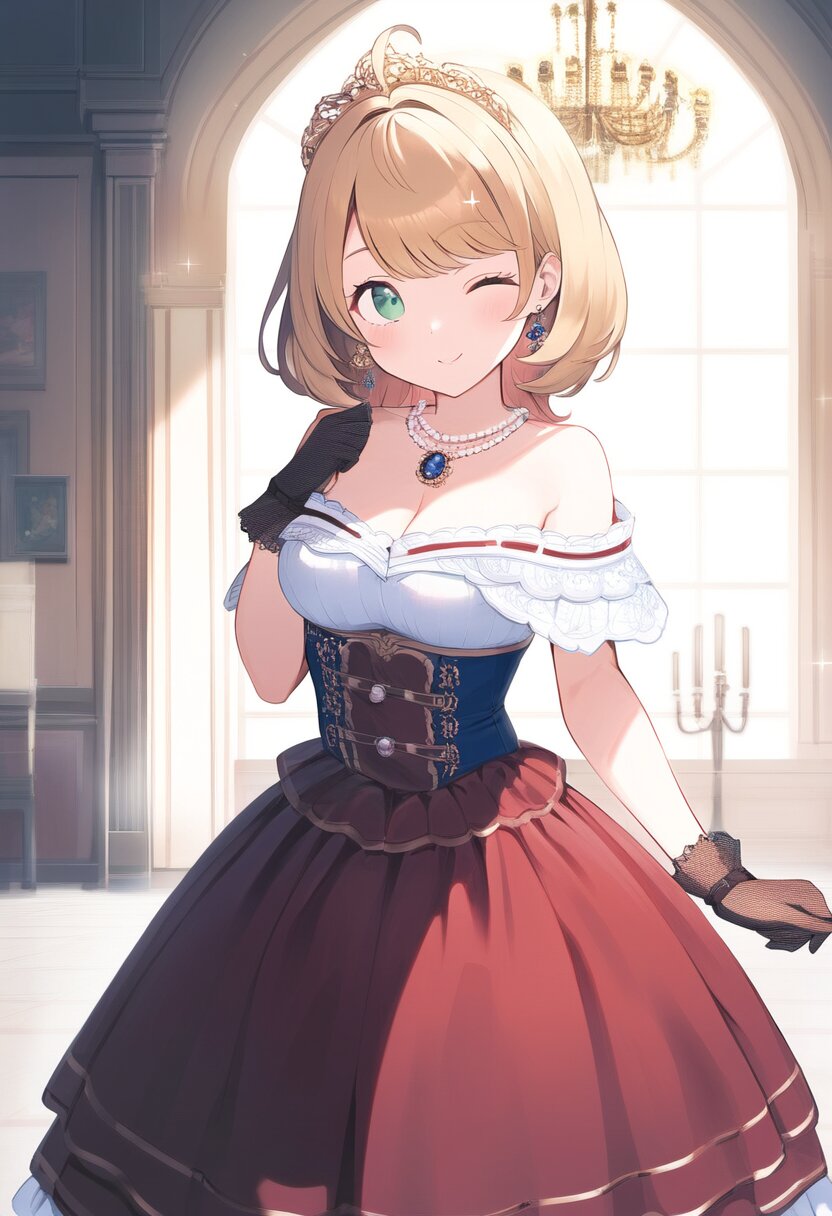 rating:general, best quality, amazing quality, great quality, very aesthetic, aesthetic, absurdres,girl,short stature,medium breasts,slender,green eyes,blonde hair,medium hair,{{straight hair}},asymmetry bangs, swept bangs,ahoge,long sideburns,one eye closed,breast cleavage,off shoulder,((Red:1.5) and (Gold:1.2) theme), Luxuriously decorated princess dress, intricately designed, deep red velvet ball gown with rich gold embroidery, multi-layered red and gold frills, iridescent gold mesh panels on the bodice, flowing red skirt with intricate golden lace trim, gold sequin waistband, dynamic pose mid-curtsy, essential items: gold tiara adorned with rubies, elegant pearl necklace, red and gold chandelier earrings, red silk gloves, gold brooch with ruby inlay, grand palace ballroom with magnificent chandeliers, strapless,polished marble floors,and elegantly dressed guests in the background,sparkle,, best quality, amazing quality, very aesthetic, absurdres