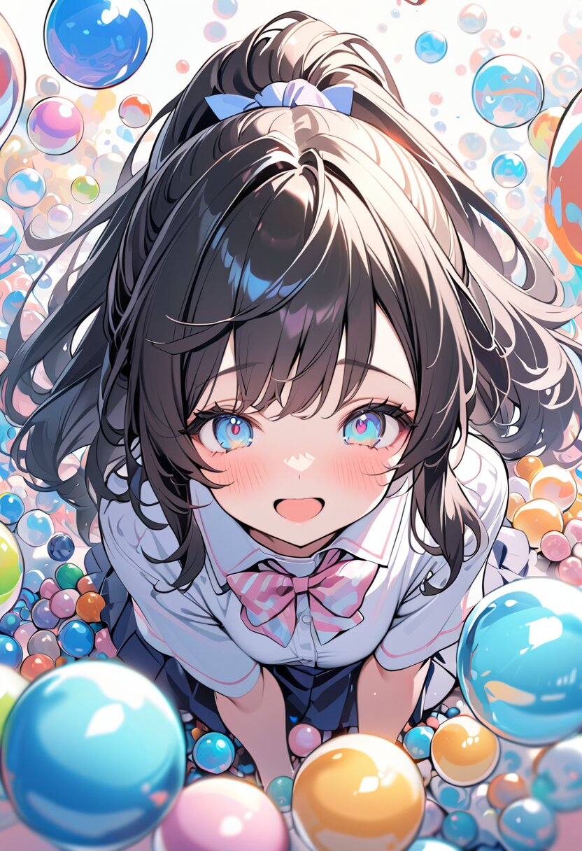 ((masterpiece)), (best quality), (beautiful detailed eyes), (ultra-detailed), (finely detail), (highres), colorful, pastel color, 1 cute girl, cute slanted eyes, happy, ponytail, Summer, school uniform, (glass Marble), kawaii illustration, surrounded by marbles, black hair, ,