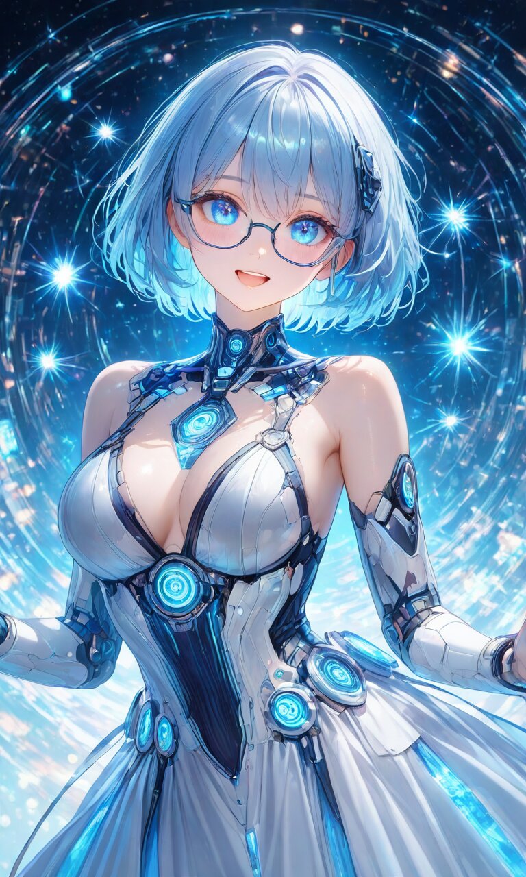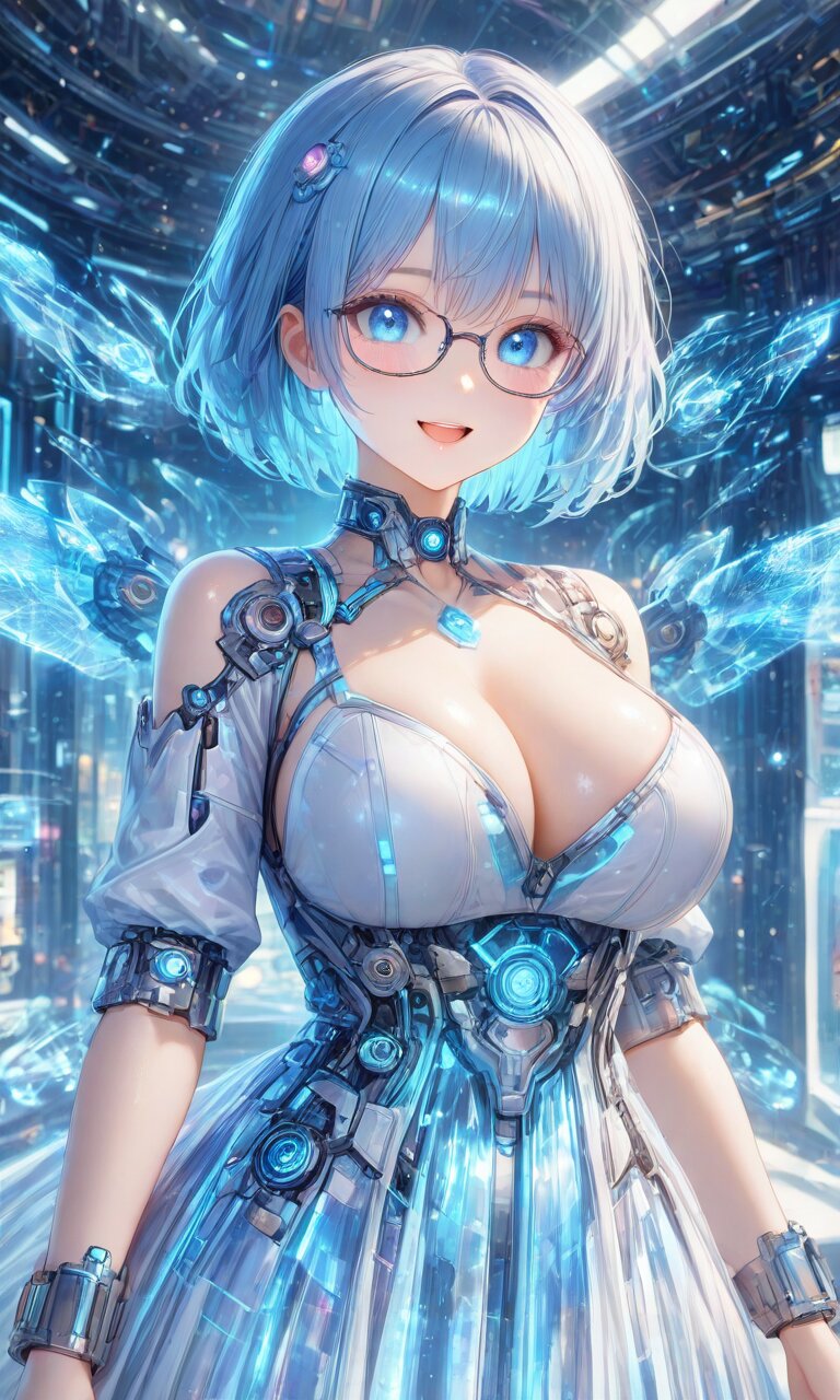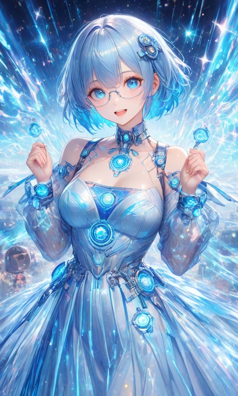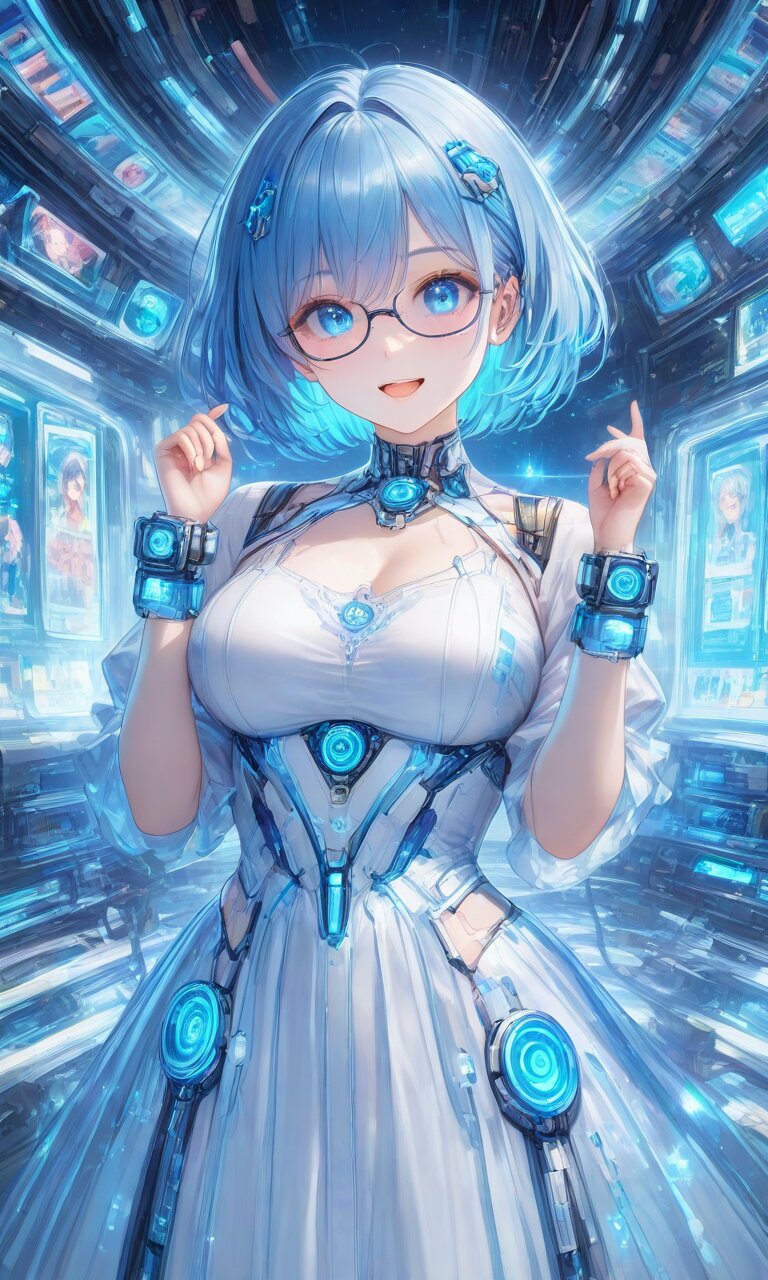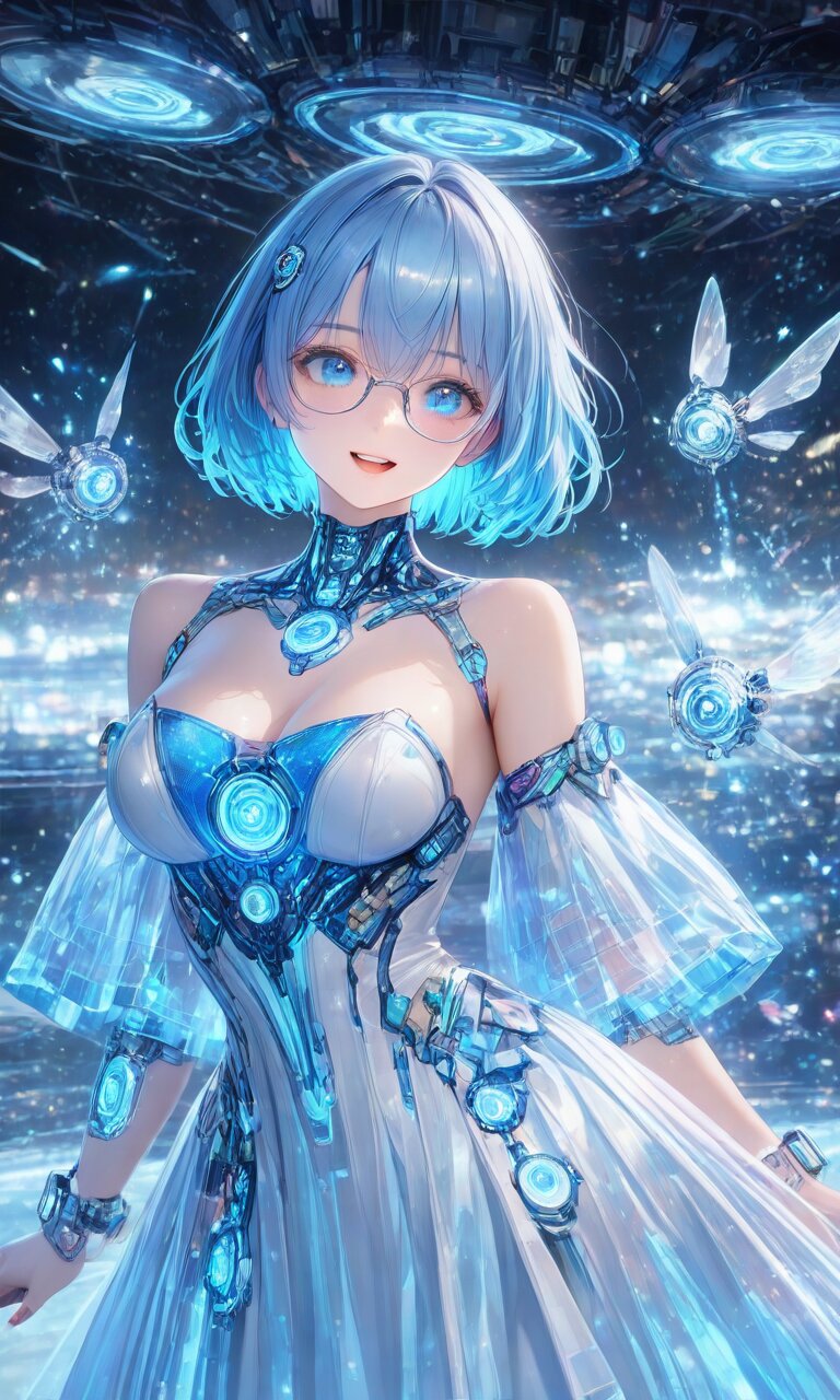 high score, great score, absurdres, source_anime, 2d, semi-realistic, unity engine smile, open mouth, ultra detailed lips, ultra detailed face and hair, kawaii, adorable, cute, (theme is A cyberspace in future), (background is A cyberspace where countless light and light particles fly around) cowboy shot, loving smile, (neon blue and white futuristic sparkling cyber long dress with extremely deep V neckline, cut out detail), digital device, (light blue hair), short cut hair, slim body, healthy body, clear blue eyes, glasses, ((4k,8k,Ultra HD)),((Masterpiece :1.2)),((Best quality :1.2)),((Detailed :1.5)),((Detailed background :1.5)) medium breasts, wide hip,