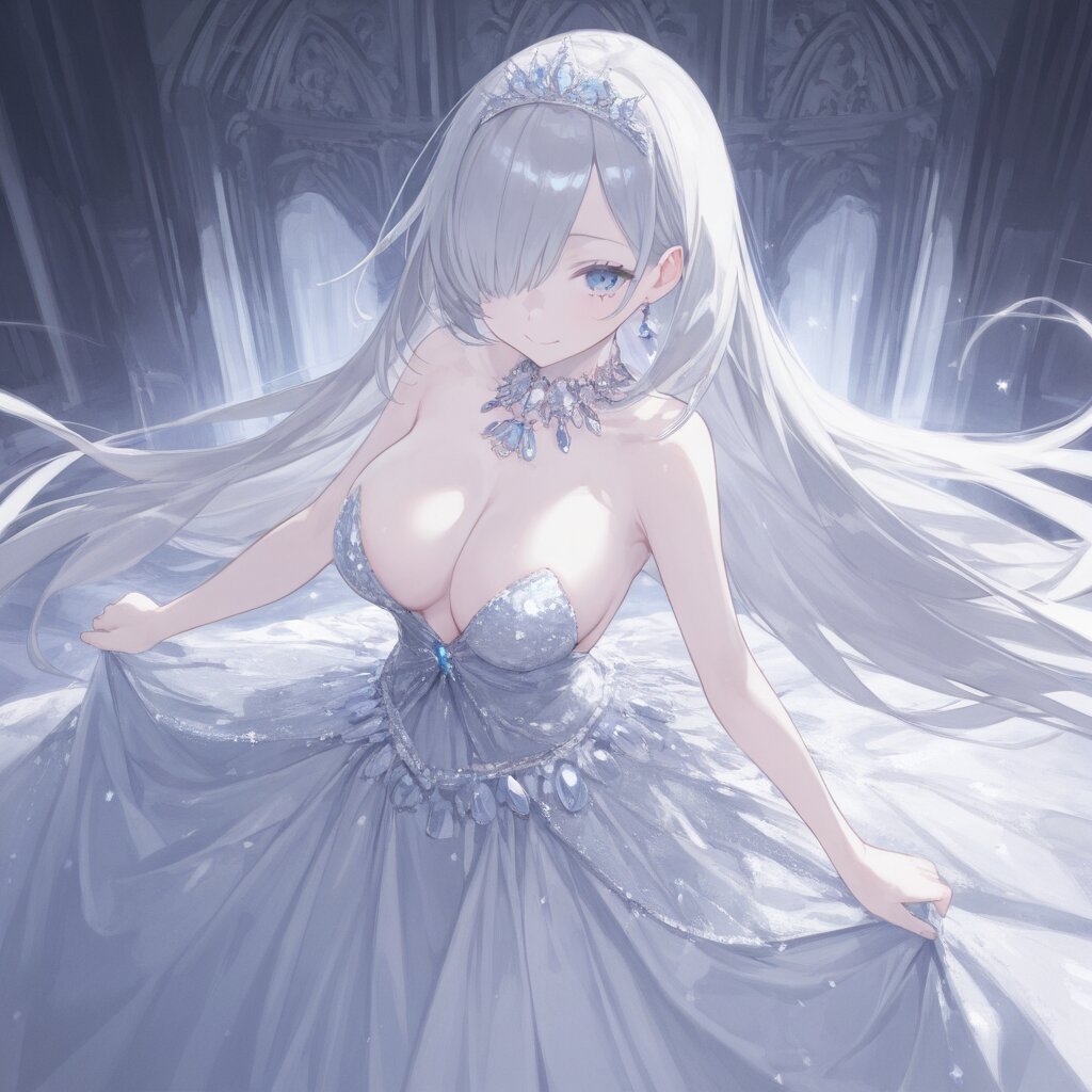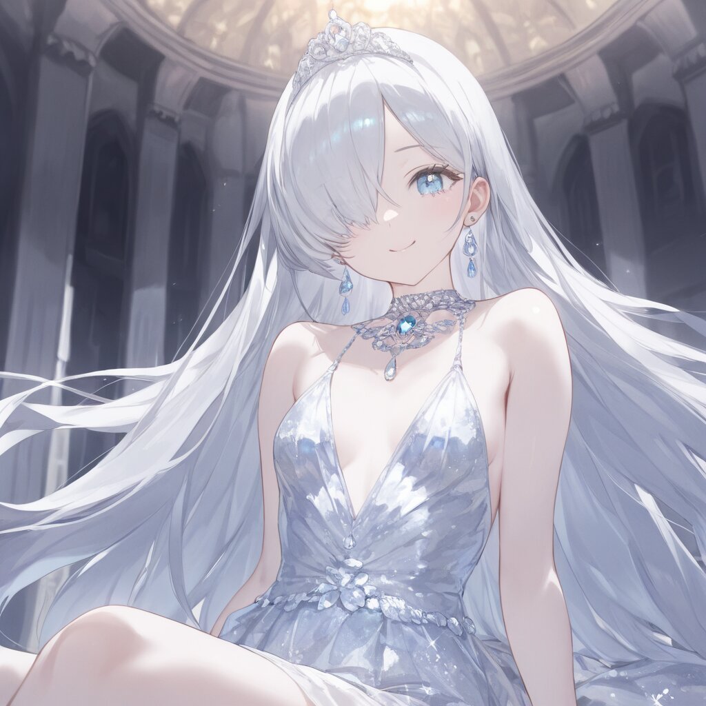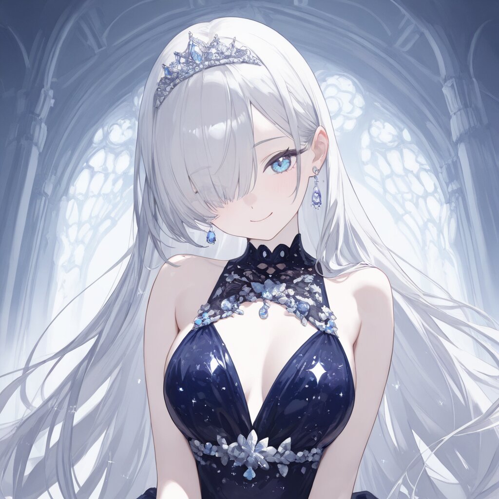 (best quality:1.2), (solo:1.2), girl, hair over one eye, very long hair, deep blue eyes, eyes like jewels, smile, closed mouth, sparkling dress, earrings, tiara, (pale skin:0.8), false eyelashes, palaces background