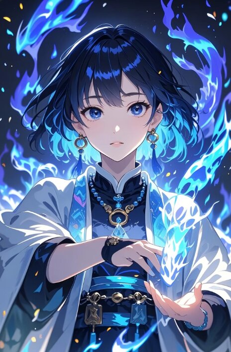 1girl, black hair, short hair, blue inner hair, one eye is hidden by bangs, expressionless, wearing a blue and white archmage robe, hoop earrings, looking at viewer, there's a blue fire burning behind me, looking at the blue flame in his right hand, anime illustration,