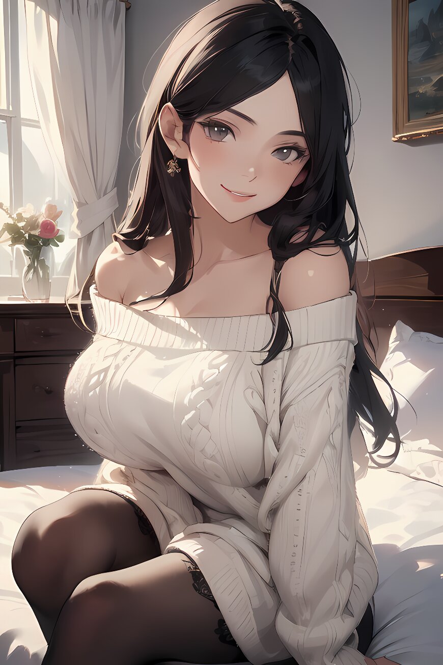 1 lady, long hair , black hair, straight hair, (big breasts) off shoulder, white sweater, black pantyhose, sitting on bed, seductive smile, ,Art Style 2.0