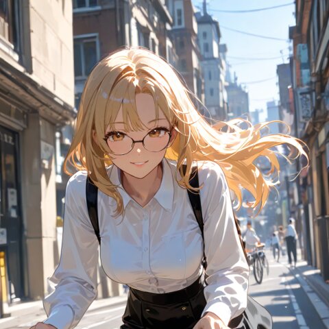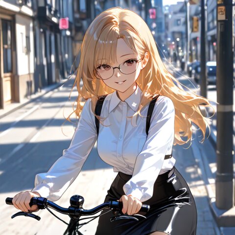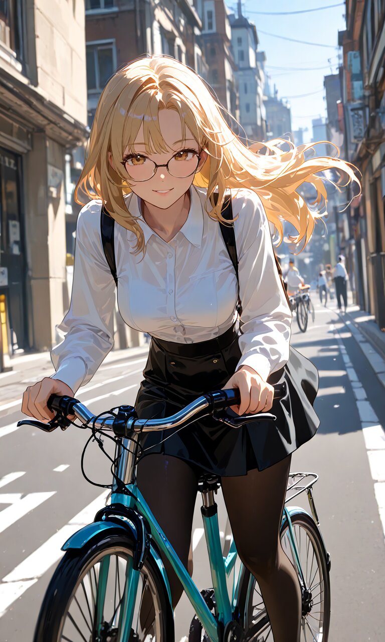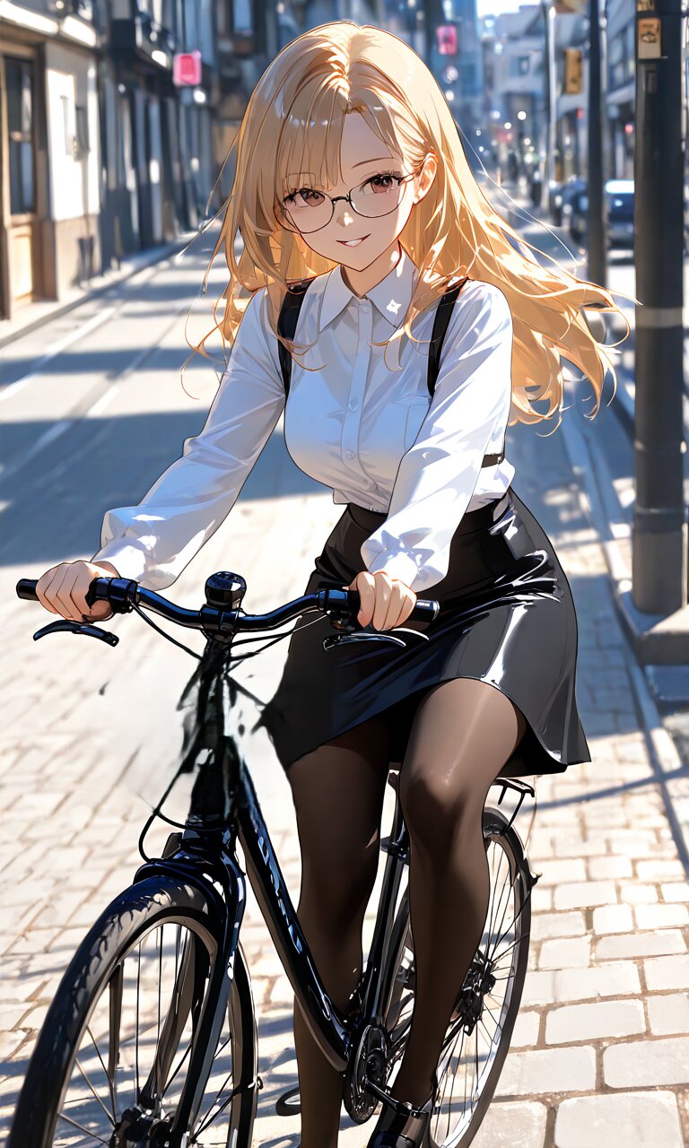1 lady, long hair, blonde hair, glasses, (black tight skirt, black pantyhose, white shirt,), ((riding bicycle)), street, smile
