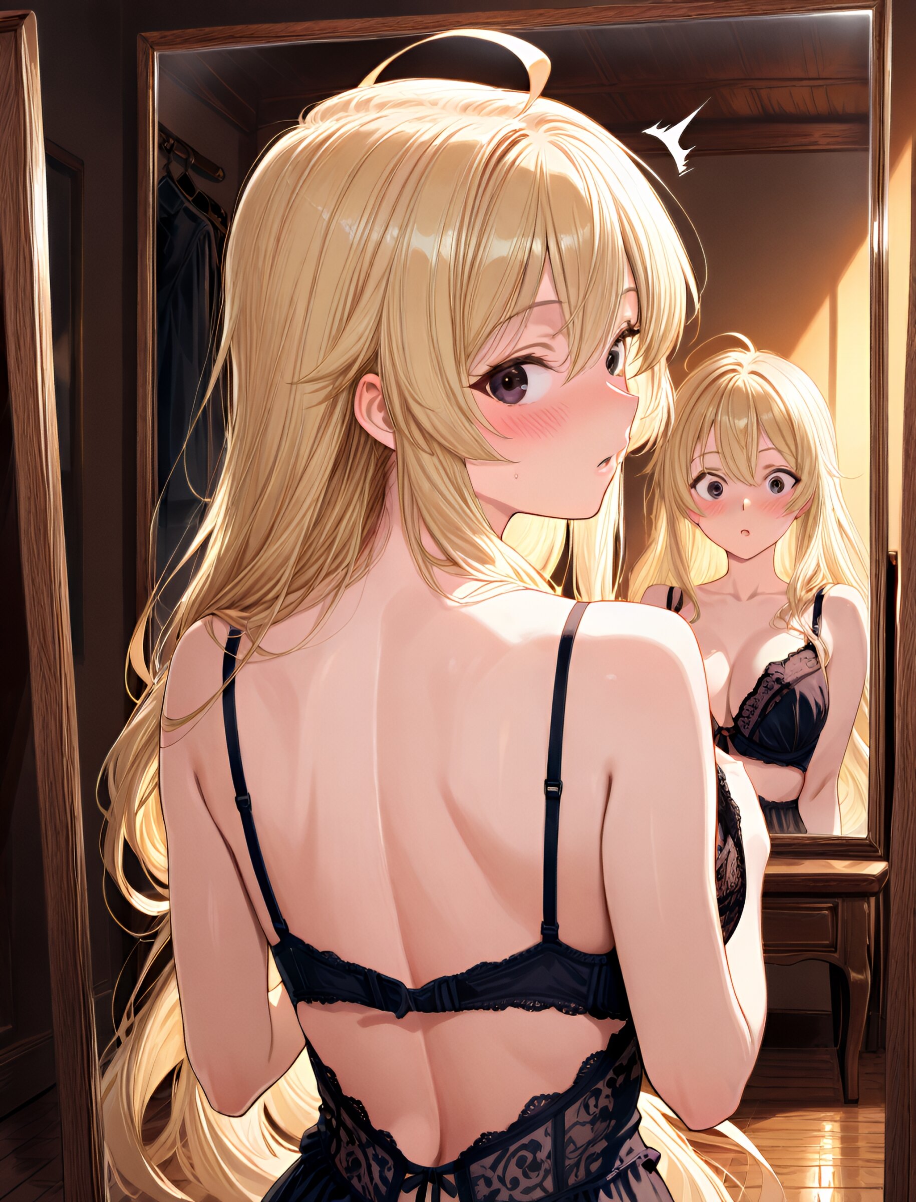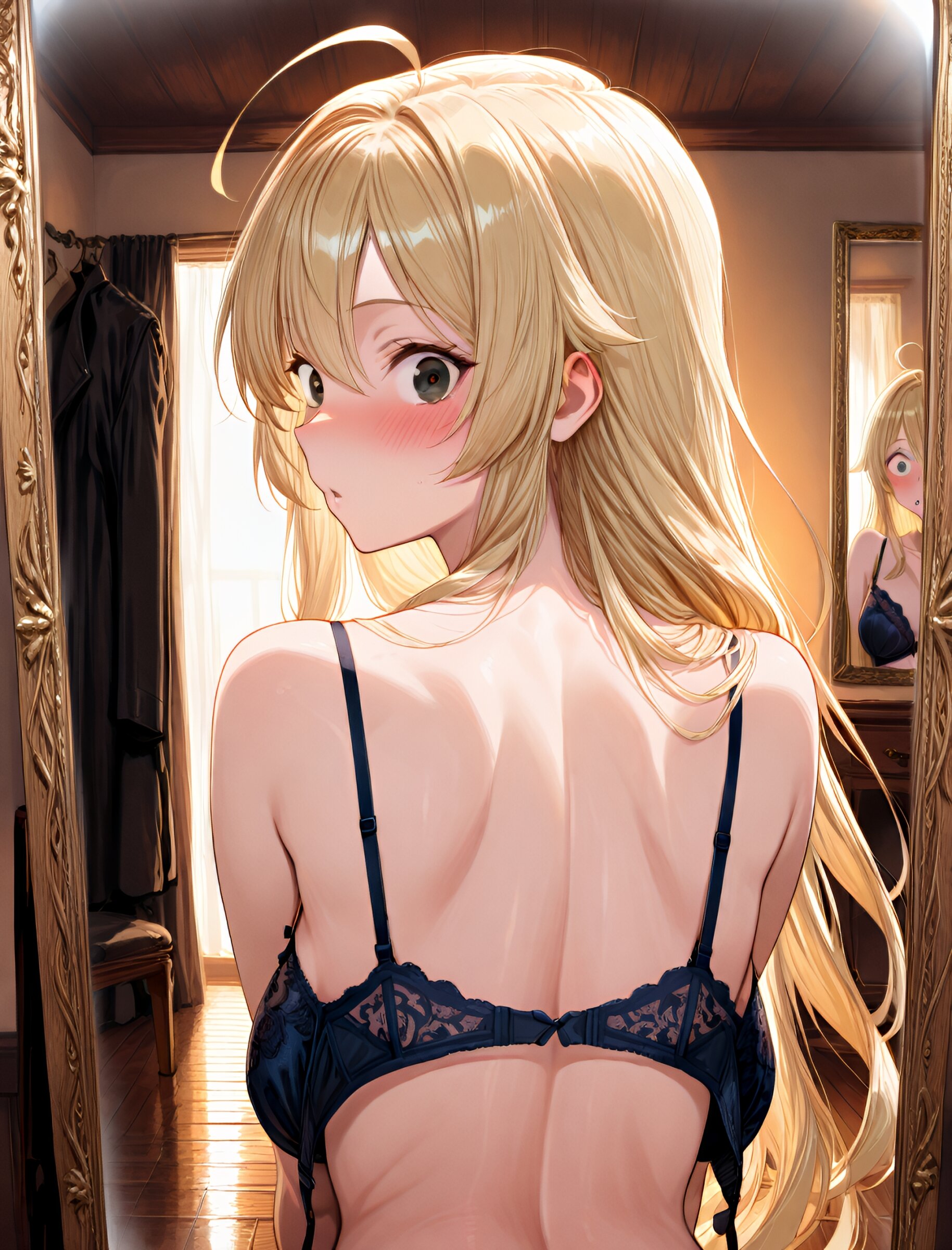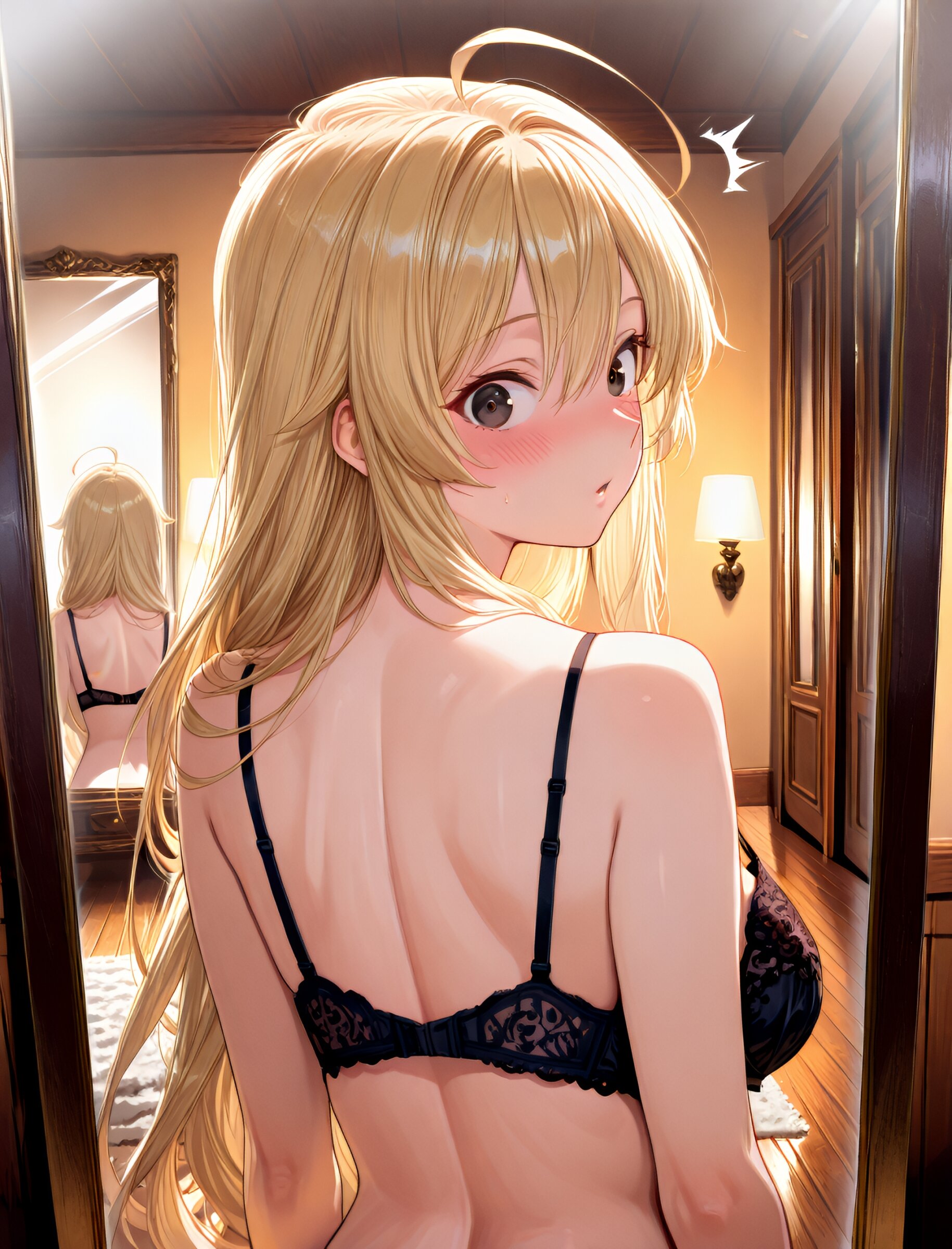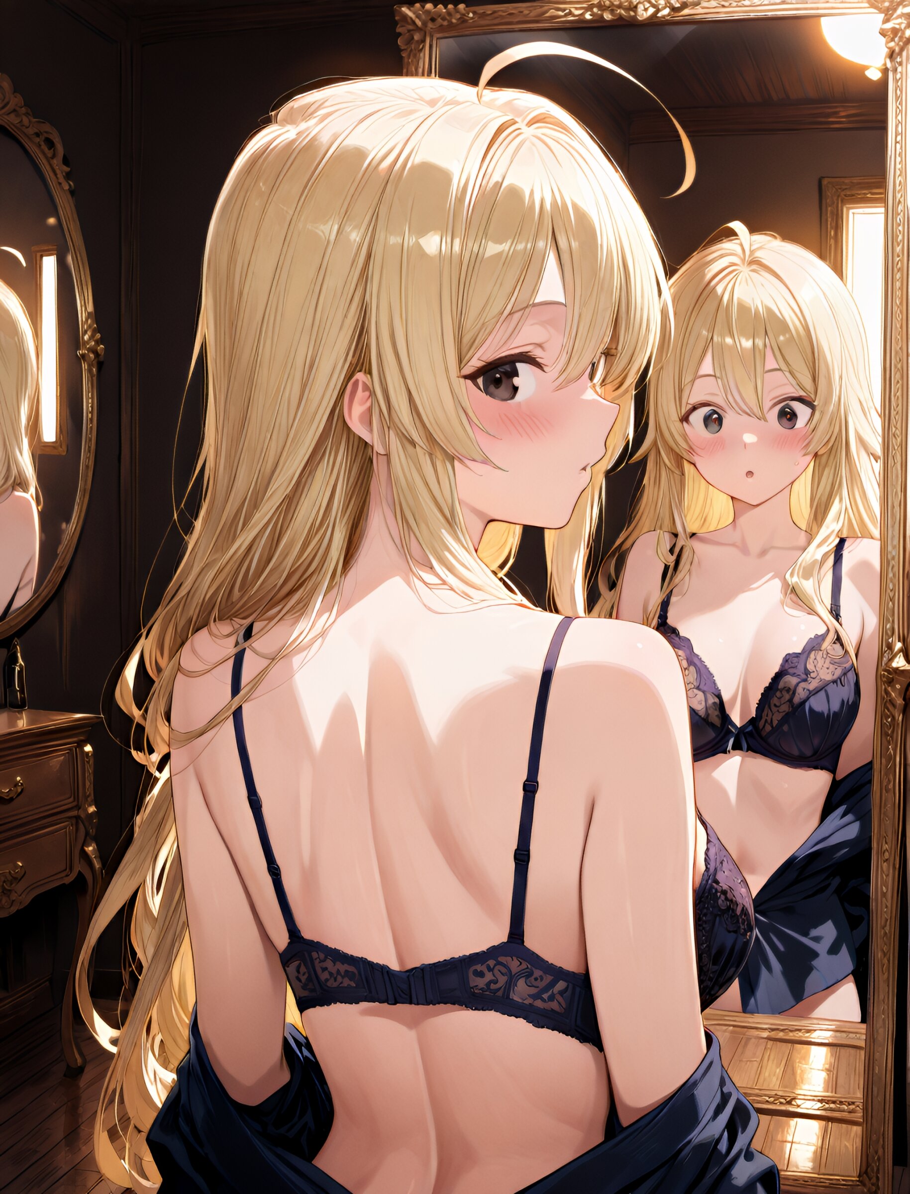 (upper body:1.5), solo, back view, looking at viewer through mirror reflection blonde hair, long flowing hair, dark copper eyes, ahoge:1.3, surprised expression, soft blush lingerie, unhooked bra, partially exposed back luxurious dressing room, warm lighting, , wooden floor masterpiece, best quality, ultra-detailed, 8k resolution, very aesthetic <lora:noobai_ep11_stabilizer_v0.11_fp16:0.7> <lora:StS-Illustrious-Detail-Slider-v1.0:2> <lora:sdxl-hairdetailer_02:2> <lora:xl_more_art-full_v1:1.3>