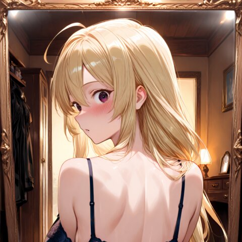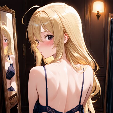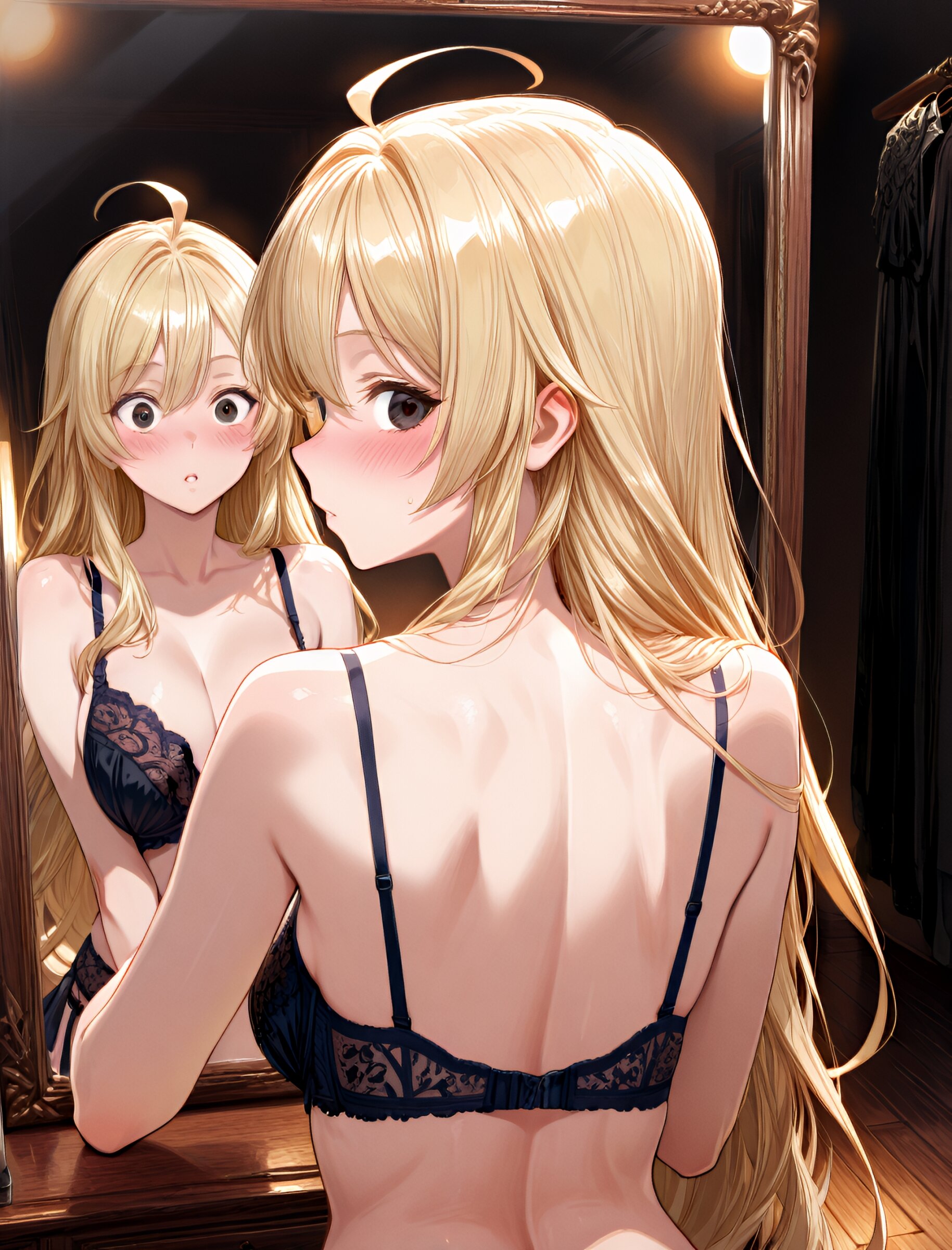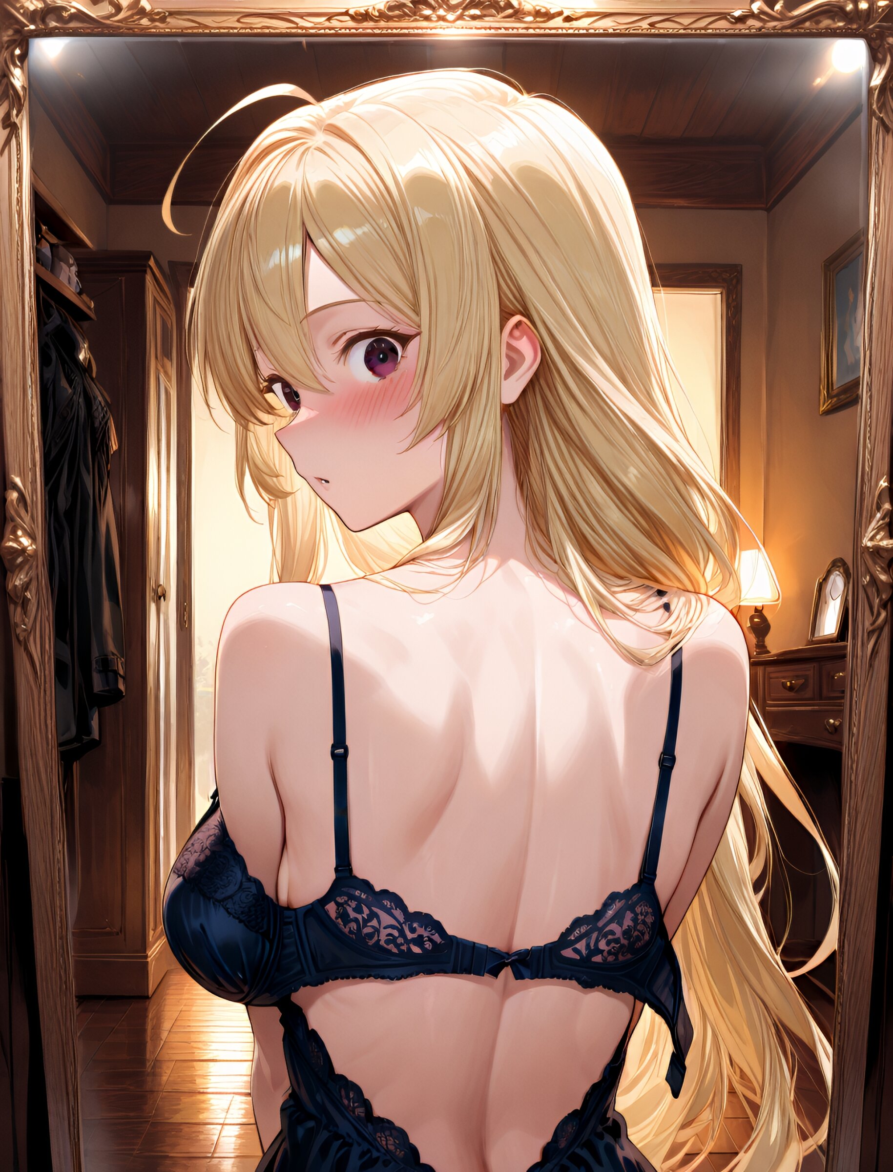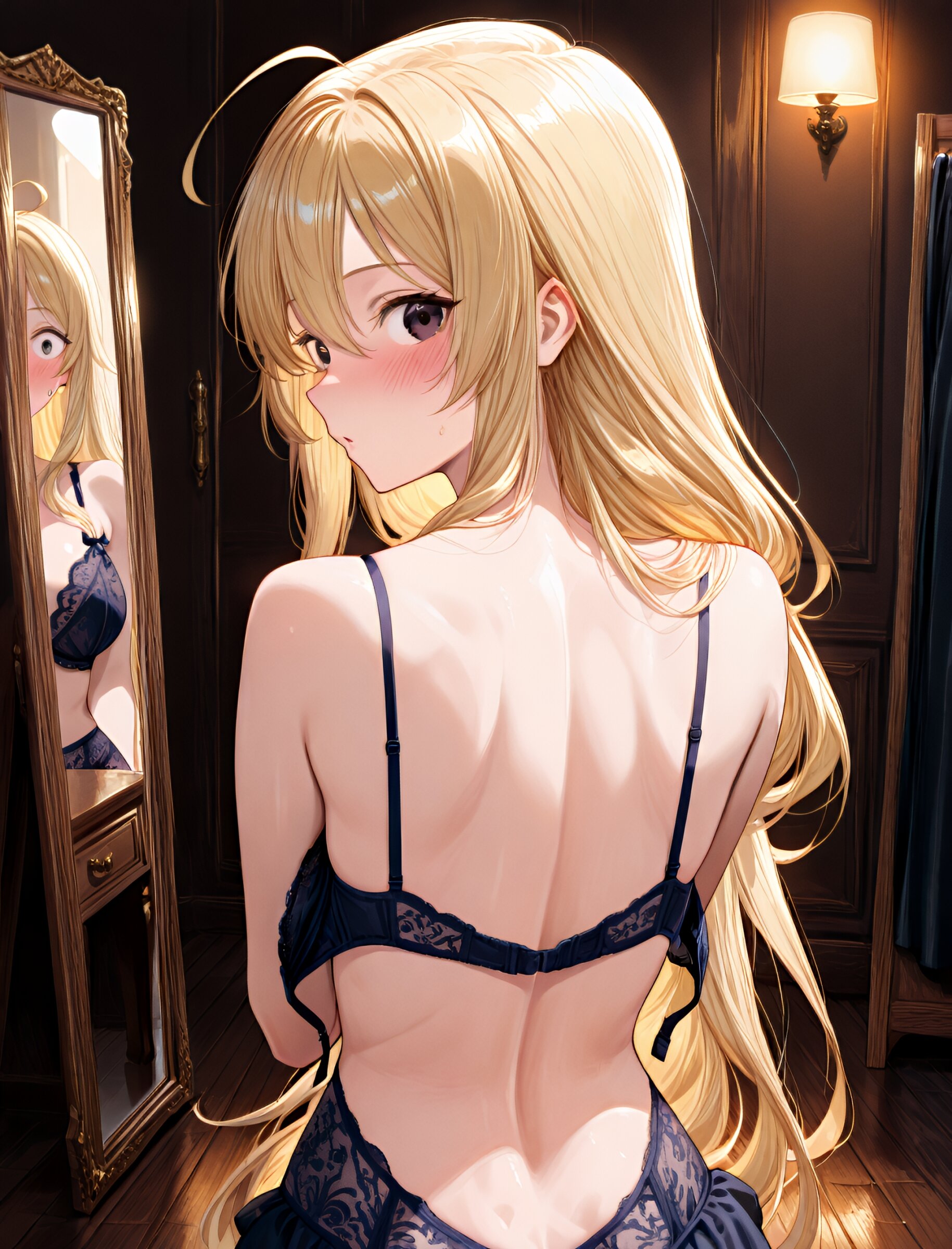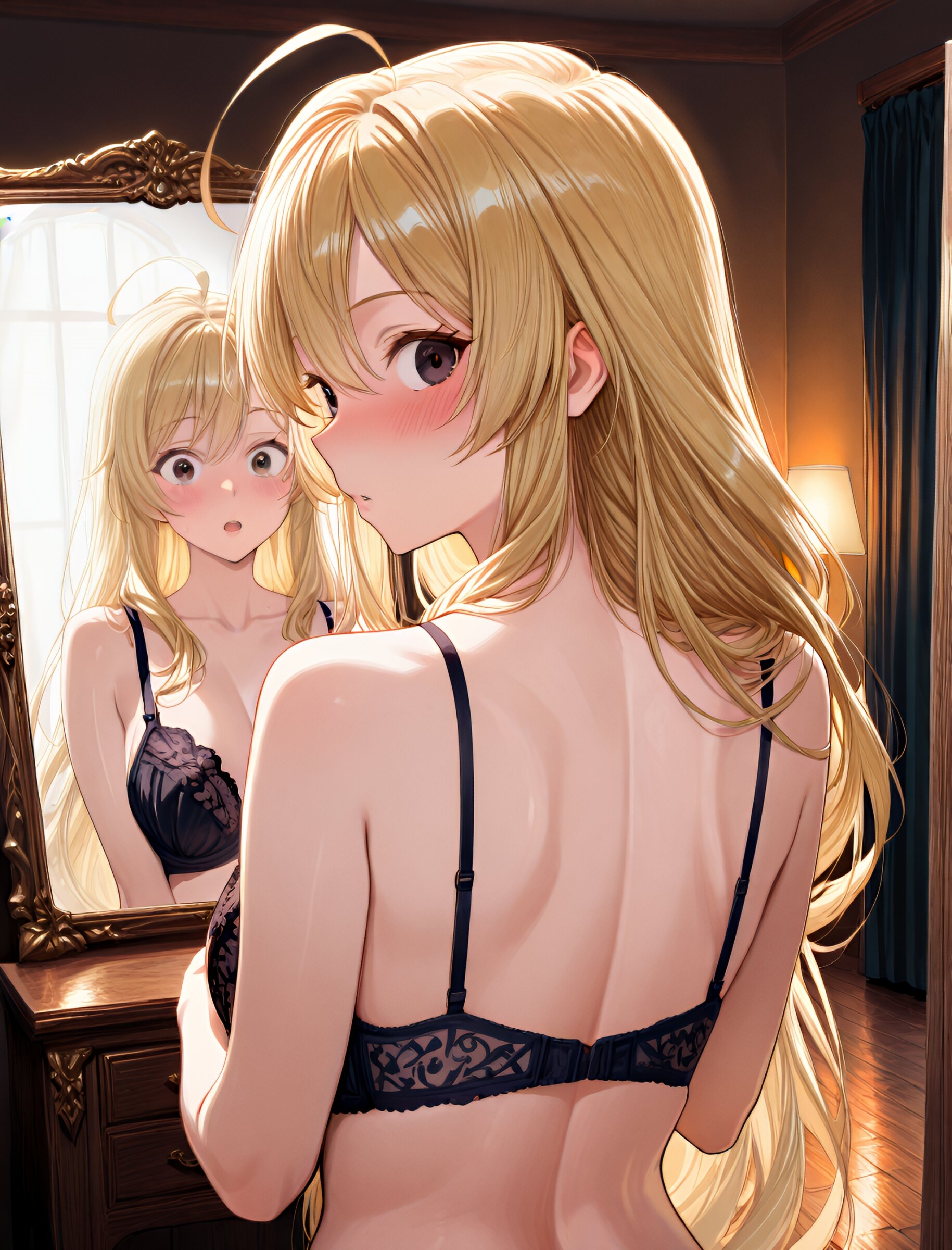 (upper body:1.5), solo, back view, looking at viewer through mirror reflection blonde hair, long flowing hair, dark copper eyes, ahoge:1.3, surprised expression, soft blush lingerie, unhooked bra, partially exposed back luxurious dressing room, warm lighting, , wooden floor masterpiece, best quality, ultra-detailed, 8k resolution, very aesthetic <lora:noobai_ep11_stabilizer_v0.11_fp16:0.7> <lora:StS-Illustrious-Detail-Slider-v1.0:2> <lora:sdxl-hairdetailer_02:2> <lora:xl_more_art-full_v1:1.3>