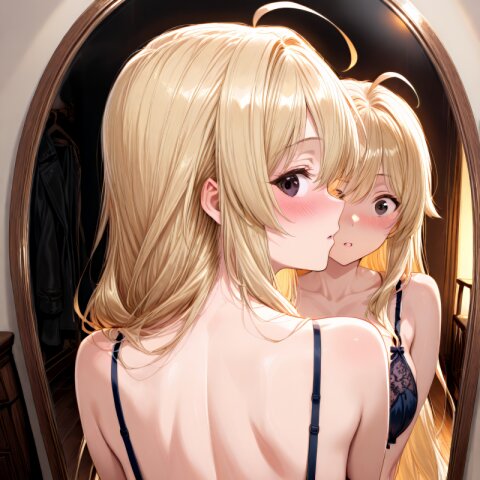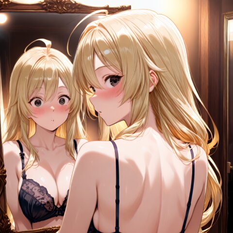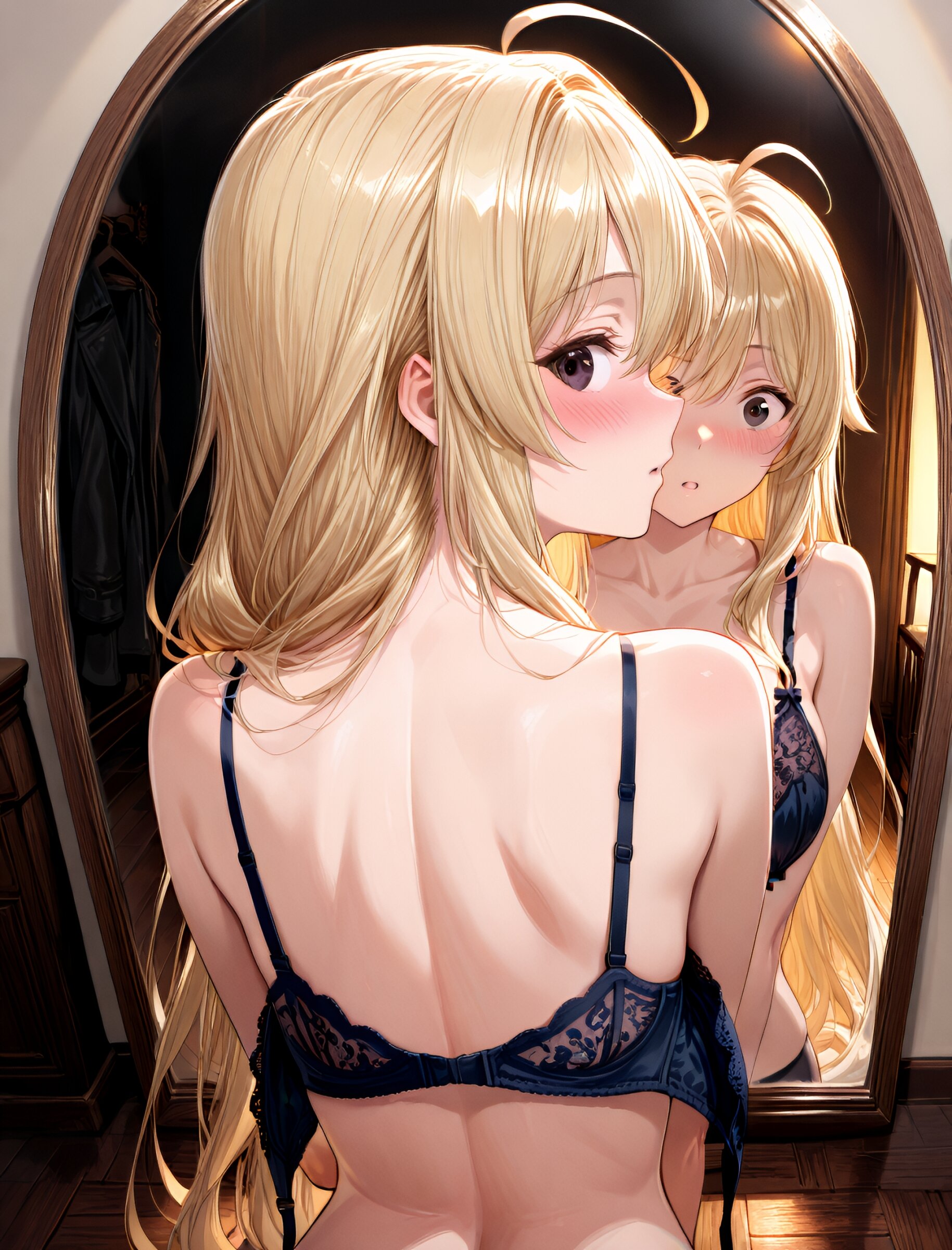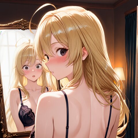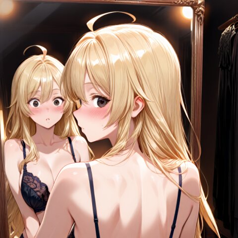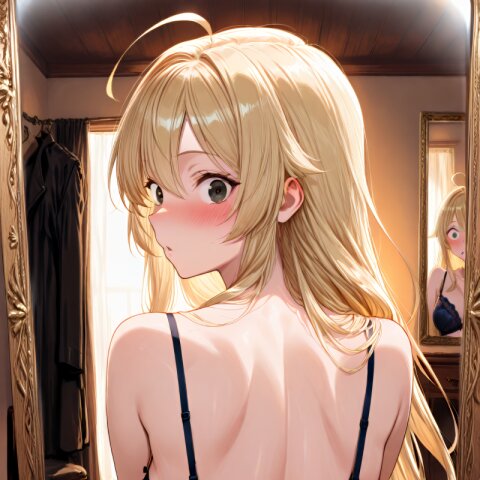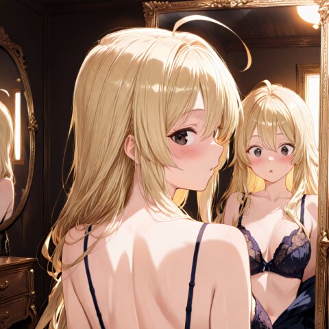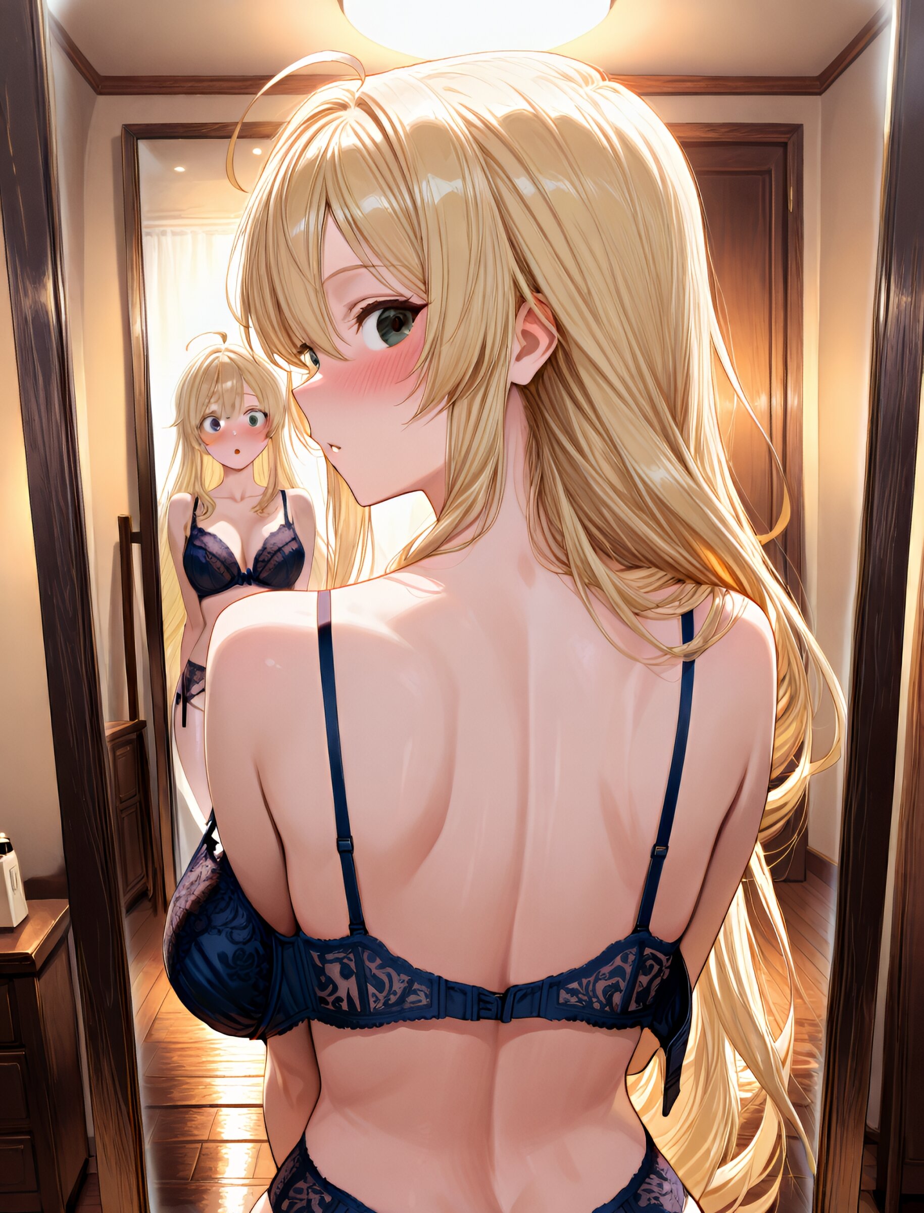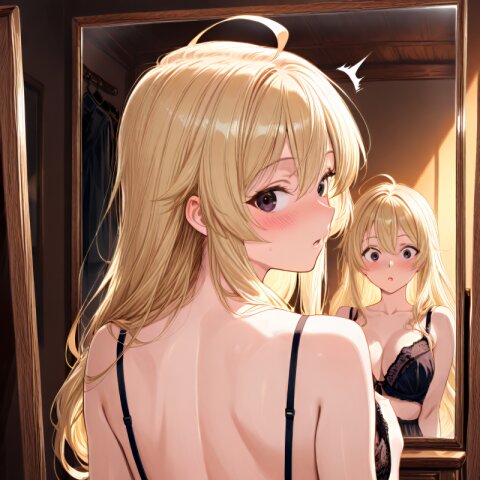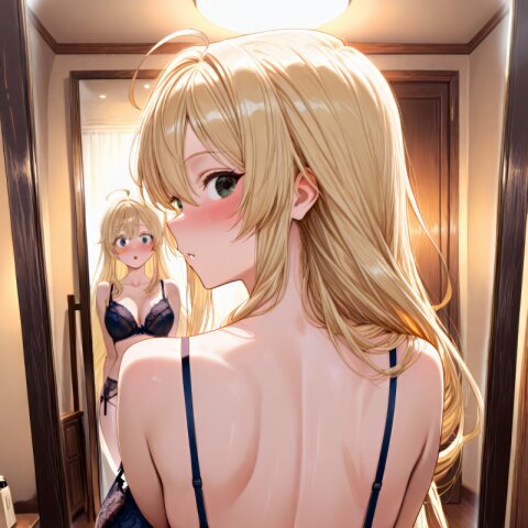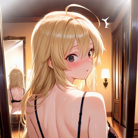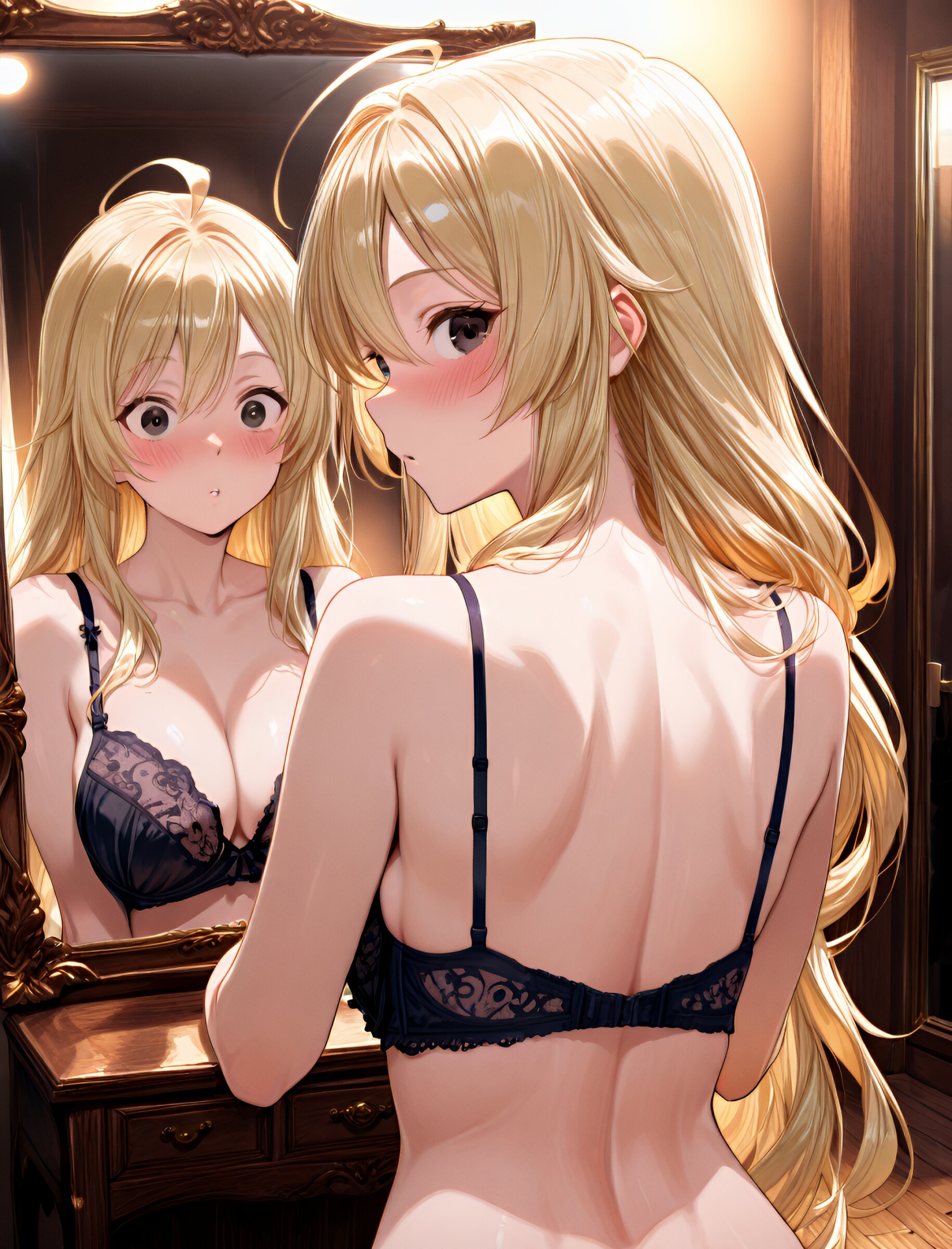 (upper body:1.5), solo, back view, looking at viewer through mirror reflection blonde hair, long flowing hair, dark copper eyes, ahoge:1.3, surprised expression, soft blush lingerie, unhooked bra, partially exposed back luxurious dressing room, warm lighting, , wooden floor masterpiece, best quality, ultra-detailed, 8k resolution, very aesthetic <lora:noobai_ep11_stabilizer_v0.11_fp16:0.7> <lora:StS-Illustrious-Detail-Slider-v1.0:2> <lora:sdxl-hairdetailer_02:2> <lora:xl_more_art-full_v1:1.3>