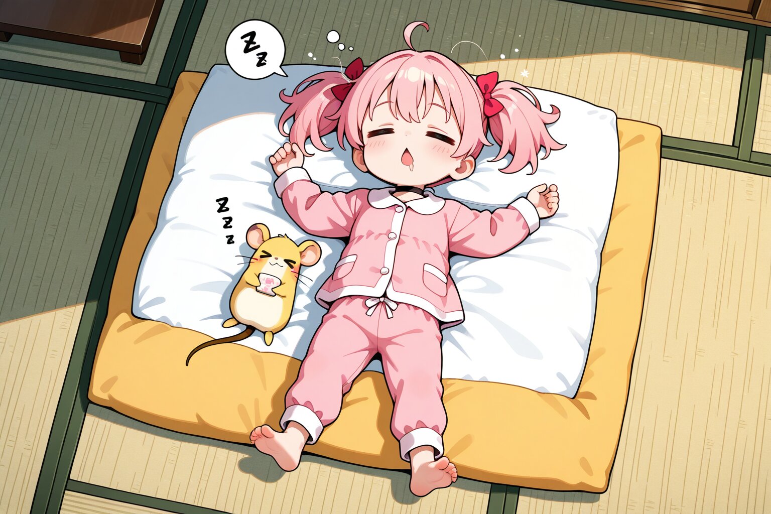 1 little girl, solo, full body, from above, masterpiece, best quality, amazing quality, very aesthetic, pink hair, twintails, =_=, smile, cheerful, happy, chestnut mouth, sleeping, squeans, spoken zzz, zzz, saliva, choker, pink pajamas, lying spread-eagle, messy sleeper, snoring, hamsters, > <, in japanese room, tatami,