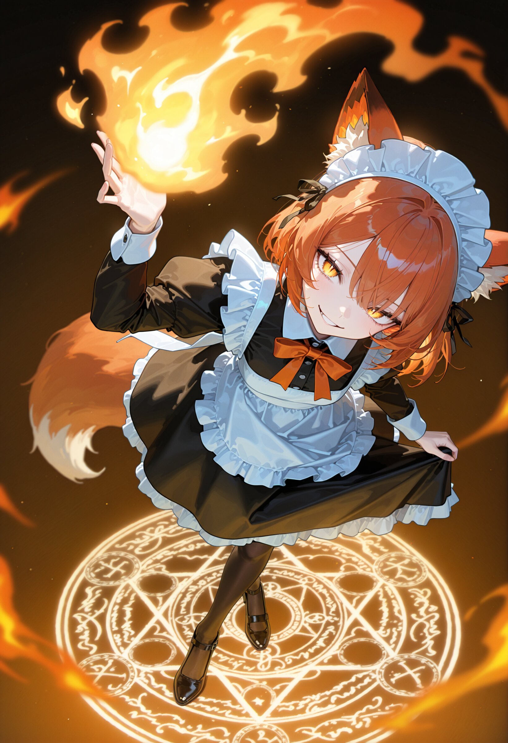 (close up:1.2) (from above,looking up:1.2) (absurdres absolutely resolution:1.2),texture, official art, ultra detailed, unity 8k wallpaper, dark theme, (simple darkorange background:1.2), 1girl, (ultra-detailed), solo, maid, pale skin, pale darkorange hair, (beautiful slit pupils, naughty face:1.0), long sleeves classic maid uniform, long skirt, maid headdress, maid apron, luminous effect lens flare lotion shiny-glistening cute girl solo full body, standing, crossed legs, skirt lift, graceful courtesy, bowing (fox ears, fox tail, hitodama, blue pyrokinesis:1.1), (ultra detailed floating glowing magic circle:1.2), (high saturation) depth of field, bokeh, super fine concept art, hard surface, 8K, unreal engine, masterpiece, best quality, amazing quality, very aesthetic, absurdres, you can add scenery, (volumetric lighting), To make the background more distinctive. professional art lots of details, , overexposure, shiny-glistening, (watercolor style:0.0), (pastel color style:0.0) <lora:noline (1):-0.5> <lora:sdxl2-flat2-512b:0.2> <lora:facelightup_xl_v10:0.5>