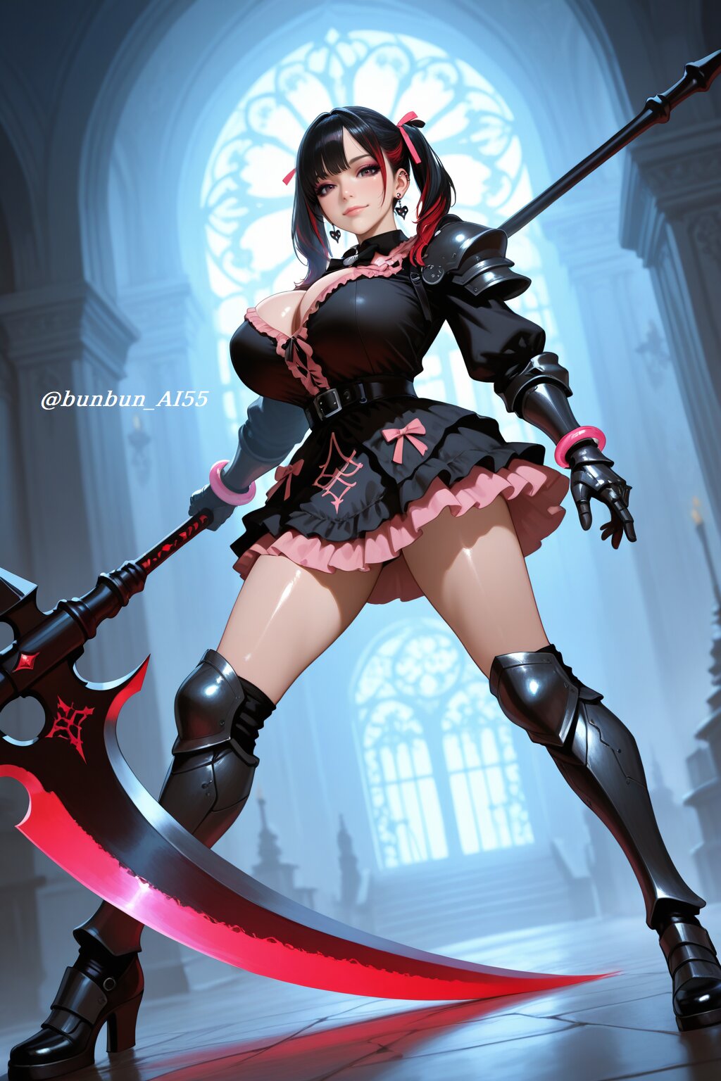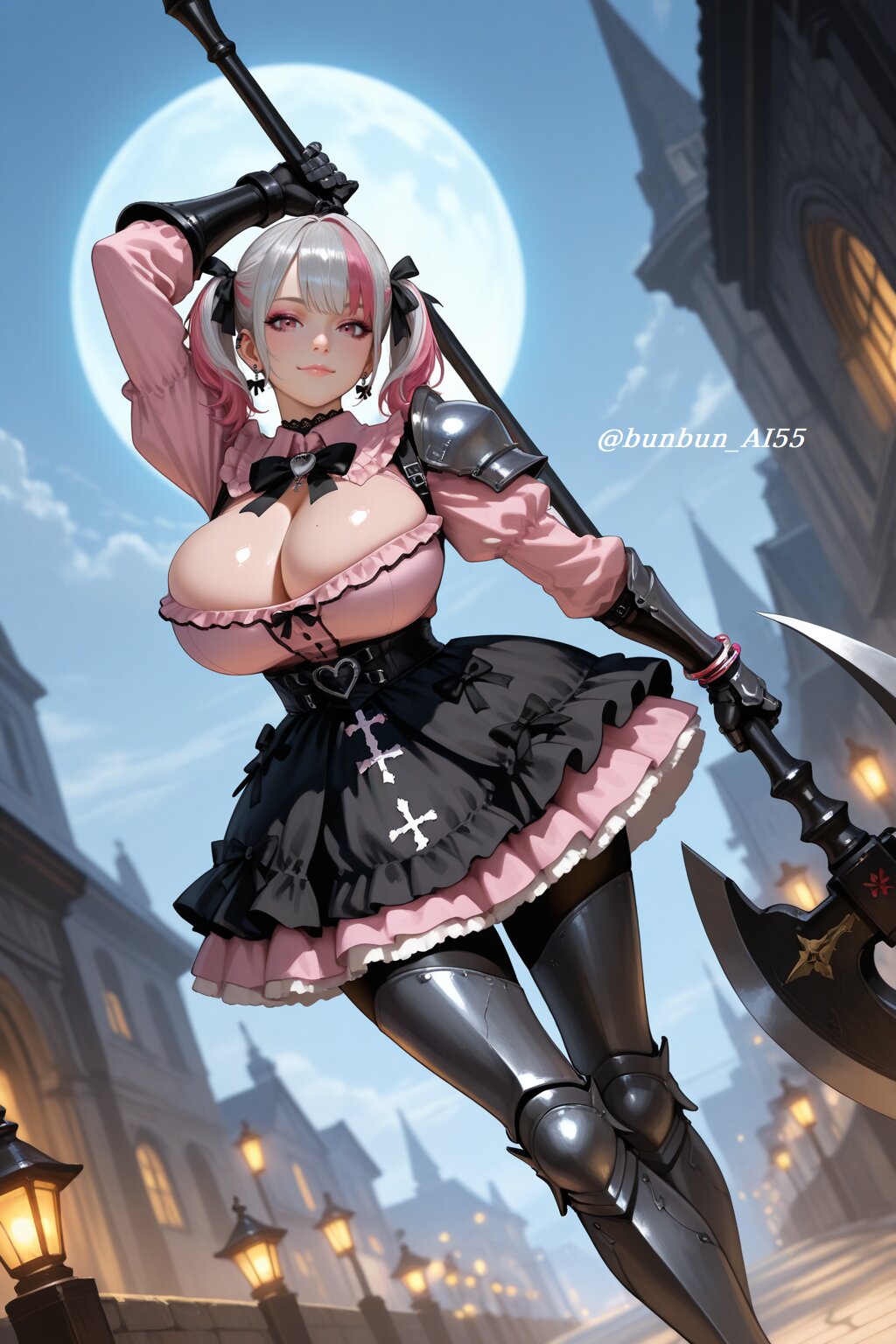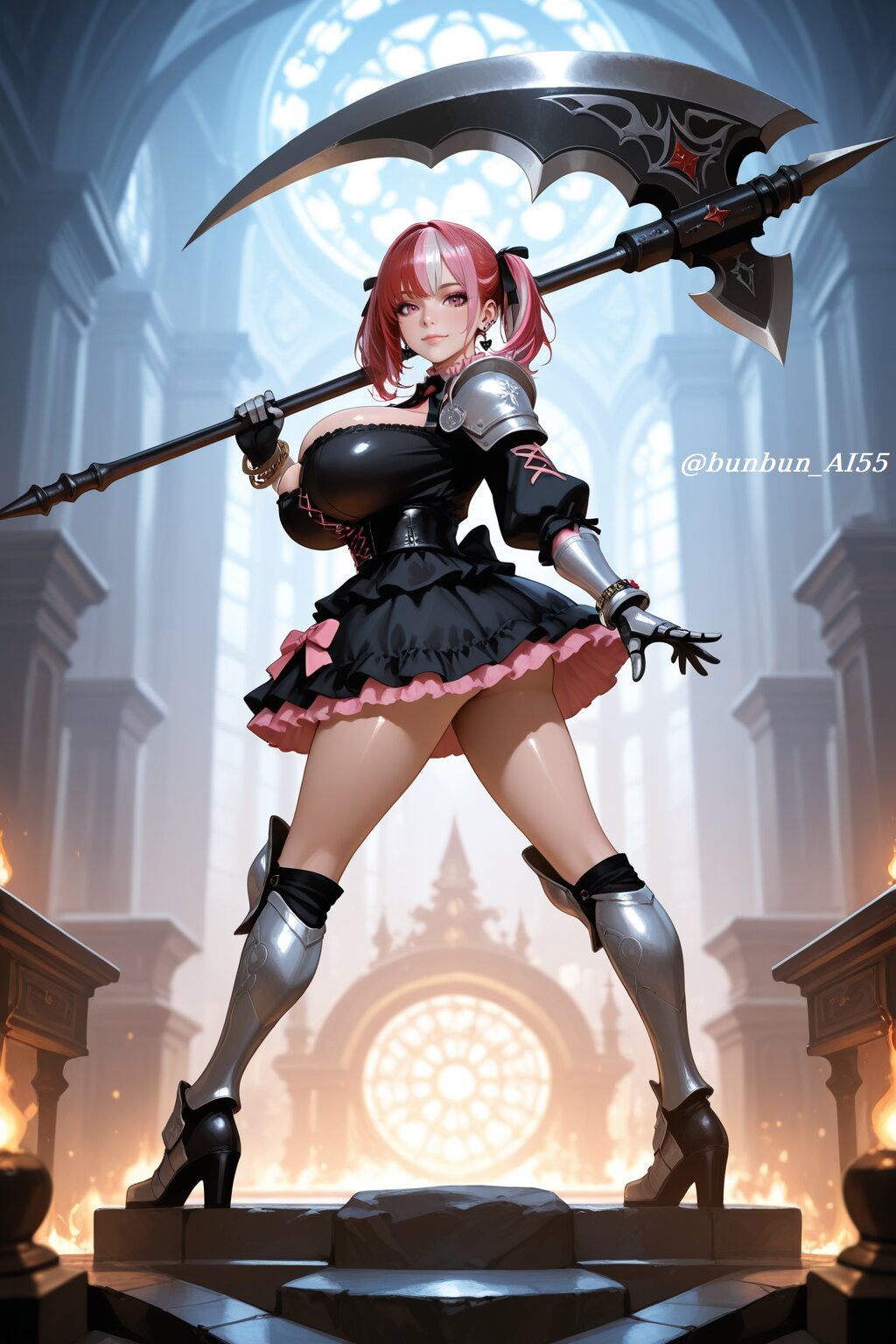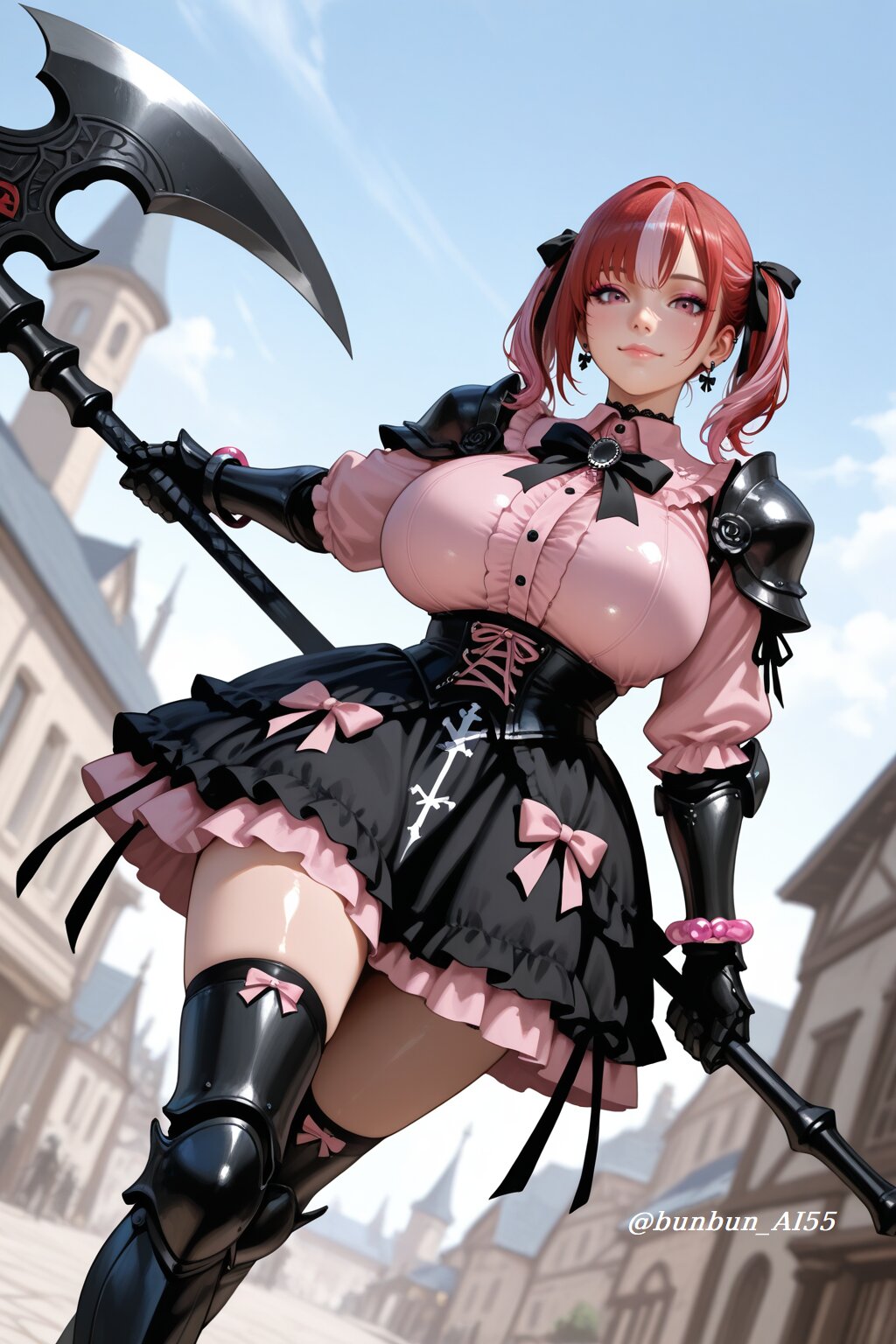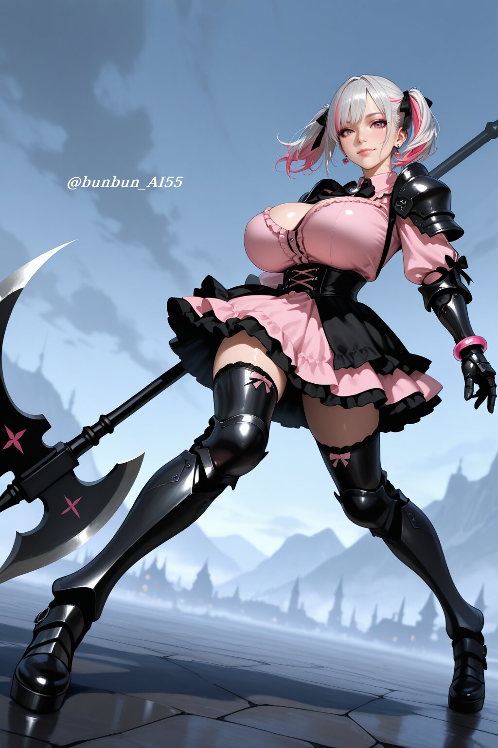 HDR, 8K,masterpiece, best_quality, amazing quality, very aesthetic, absurdres, newest, detailed eyes, realistic body, (realistic, hyperrealistic), highres, ultra realistic, BREAK perfect lighting, professional lighting, (fantasy art style), (1girl, beautiful girl, 18year old), (kawaii, jirai kei), (detailed face, jirai kei makeup), (looking at viewer, light smile), (jewelry, piercing, earrings, bracelet), red and black multicolored hair, short twintails, hair ribbon, (huge breasts, pointy breasts), long legs, (perfect hands), (shiny skin), (gothic lolita:1.2, wearing a pink gothic lolita maid costume), (shoulder armor, armored gloves, armored boots), (dynamic pose:1.2), (holding gigantic halberd:1.2), (detailed background, fantasy background), (from side, straight-on), (bust-up shot, medium shot),
