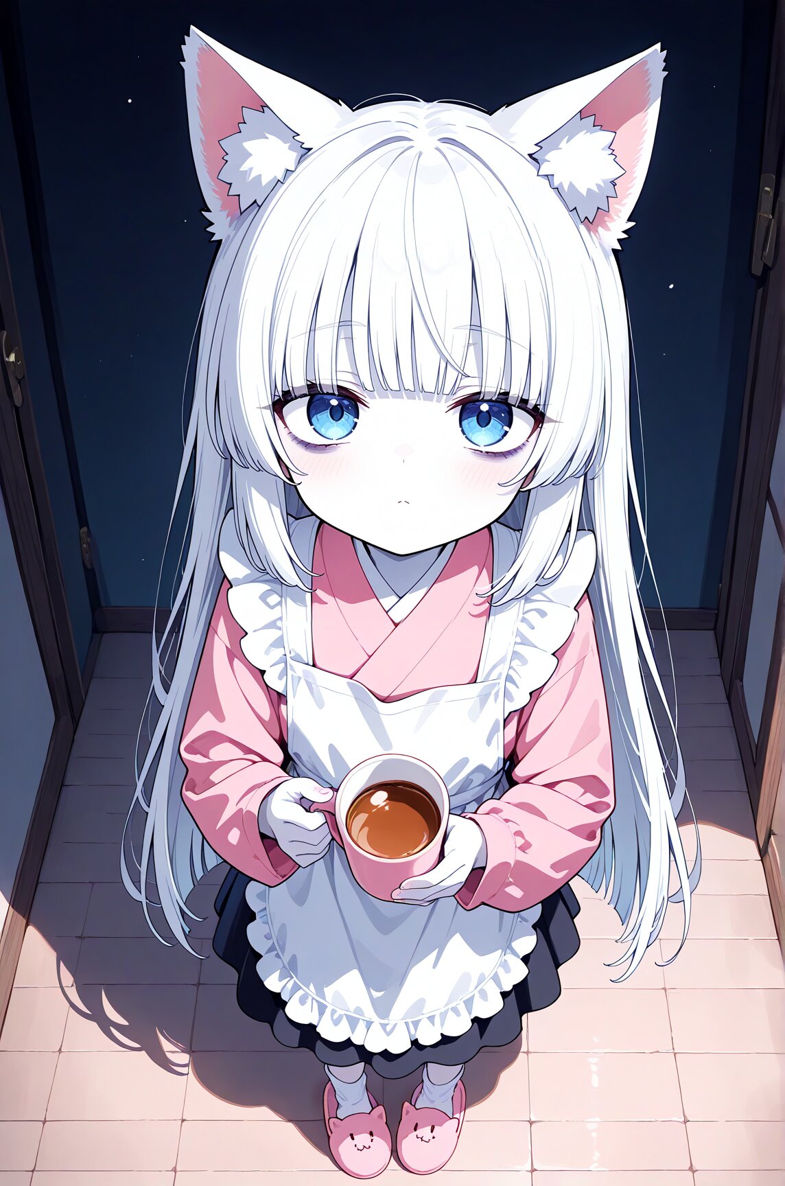 Pink bright environment,girl wearing apron and holding something,cartoon girl wearing maid outfit holding cup and rabbit in left hand. 1 girl,white skin,round face,round chin,loli face,slippers,knee socks,solo,cat ears,long hair,apron,white hair,long hair,long straight,long bangs,hime cut,silky hair,smooth hair,slippery white hair,beautiful hair,big eyes,blue eyes,slanted eyes,clear eyes,iris,long eye corners,dignified eyes,drooping eyelids,shading in eye gradient,dots under eyes,moe slippers,, masterpiece, best quality, newest, very awa