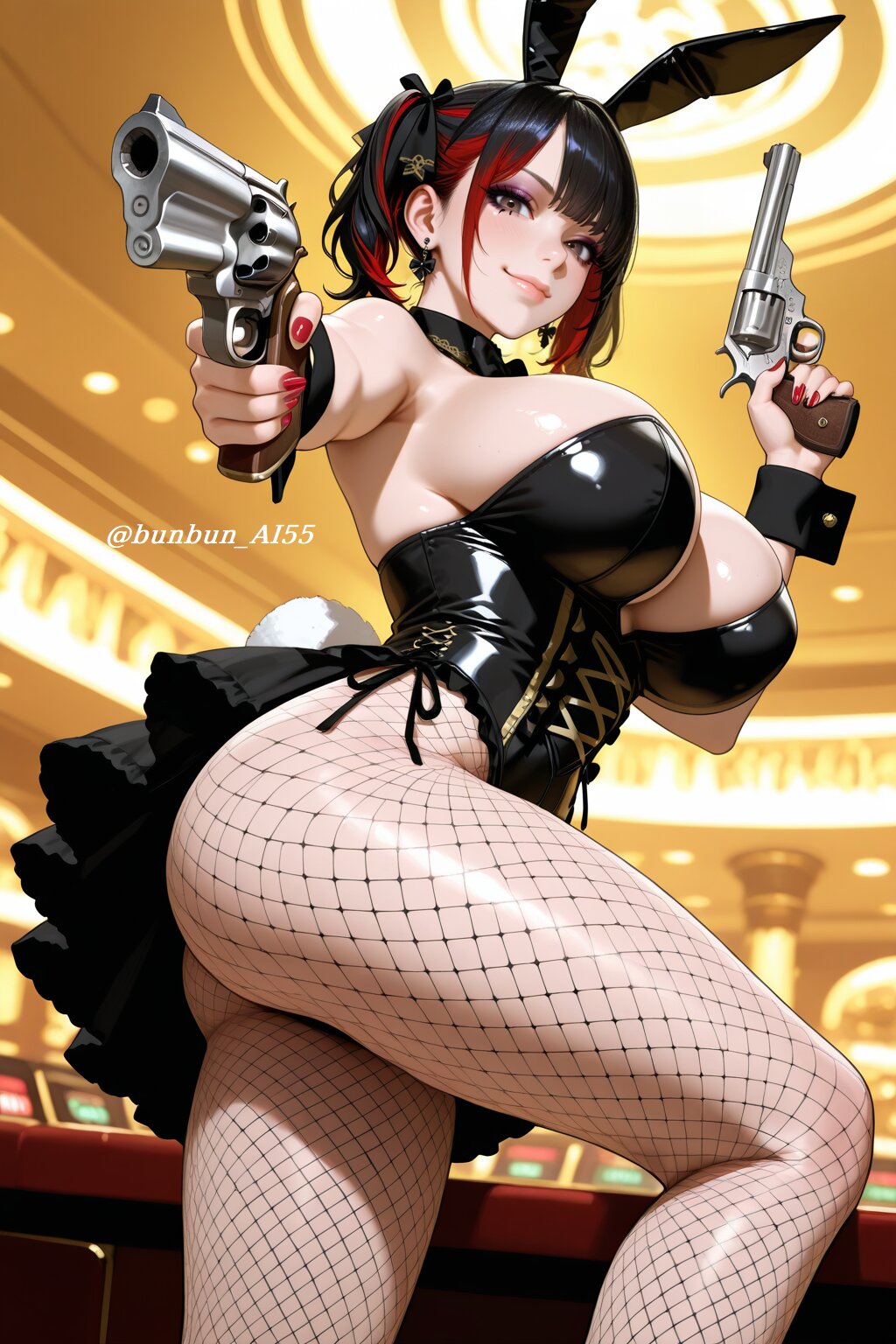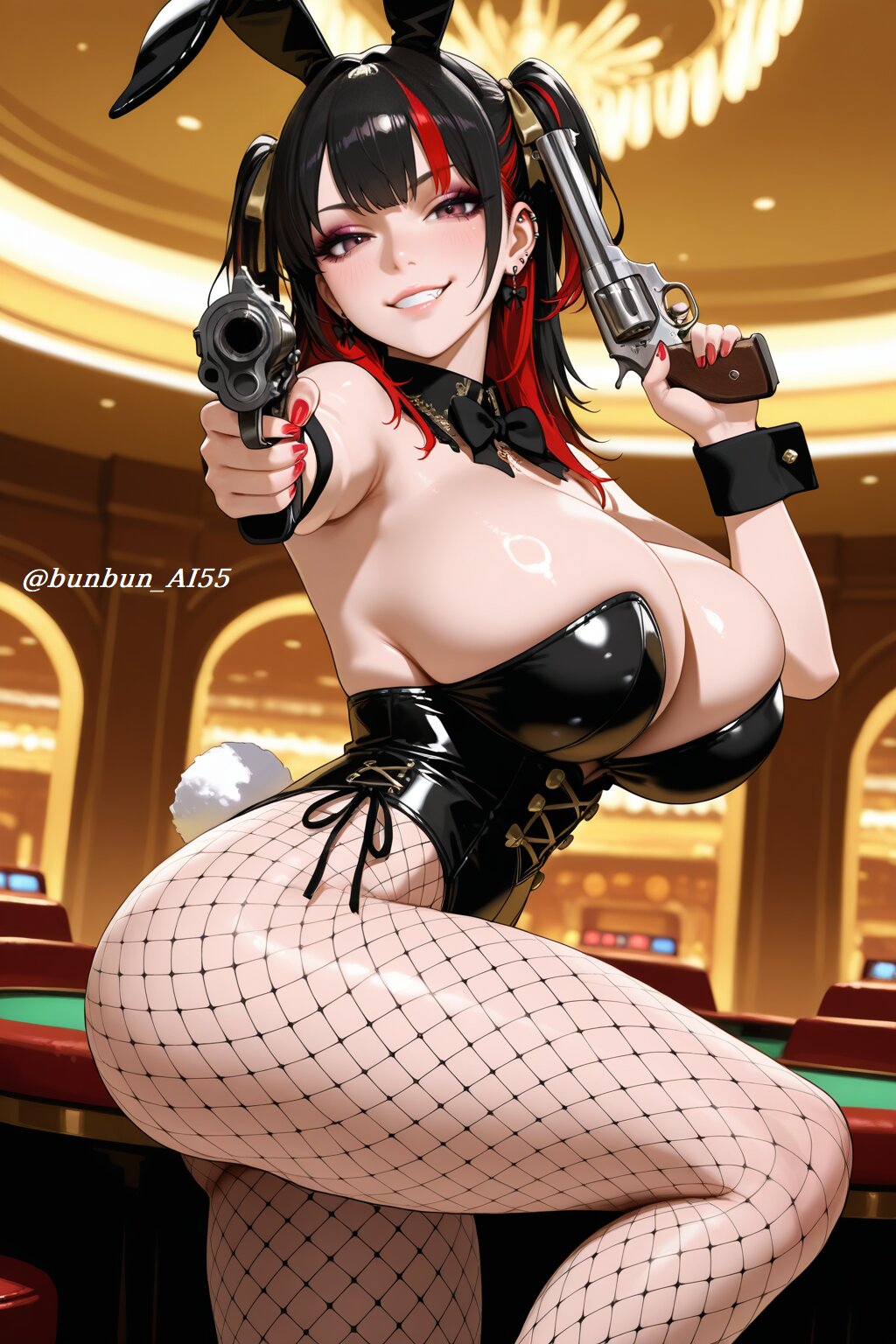 HDR, 8K,masterpiece, best_quality, amazing quality, very aesthetic, absurdres, newest, detailed eyes, realistic body, (realistic, hyperrealistic), highres, ultra realistic, BREAK perfect lighting, professional lighting, (1girl, beautiful girl, 18year old), (kawaii, jirai kei), (detailed face, jirai kei makeup), (looking at viewer, naughty face), (jewelry, piercing, earrings, bracelet), red and black multicolored hair, short twintails, hair ribbon, (huge breasts, pointy breasts), long legs, (perfect hands), (shiny skin), (gothic lolita:1.2, wearing a gold gothic lolita playboy bunny), (bowtie, wrist cuffs), (fishnet pantyhose) (dynamic pose:1.2), (holding large revolver:1.2, dual wielding, aiming at viewer, fighting action), (detailed background, casino), (from side, straight-on), ((bust-up shot, medium shot, dutch angle)),