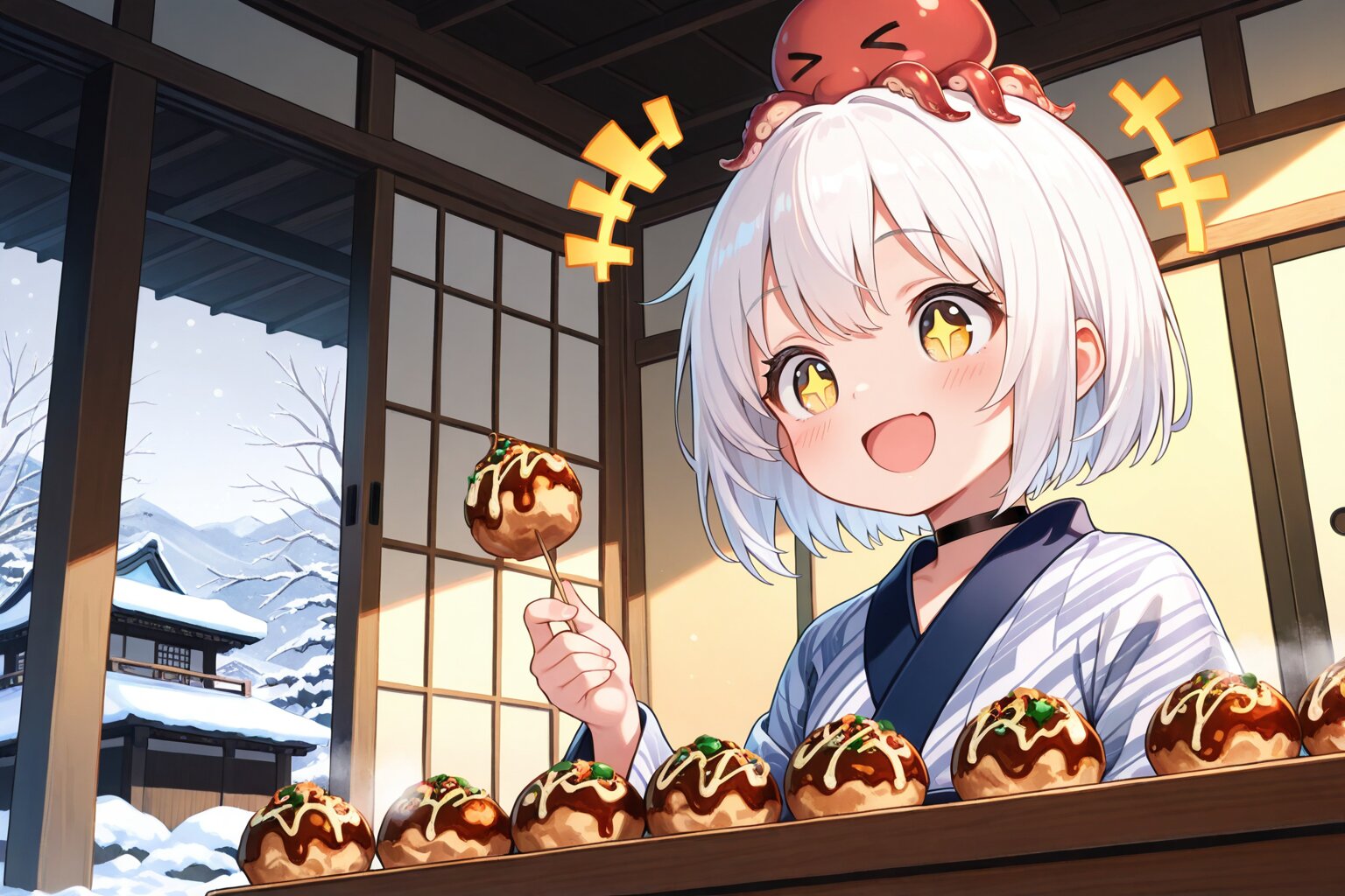 1 little girl, solo, upper body, diagonal angle, masterpiece, best quality, amazing quality, very aesthetic, white hair, short hair, yellow eyes, +_+, open mouth, smile, cheerful, +++, notice lines, choker, yukata, takoyaki, octopus on her head, > <, in japanese room, snow,