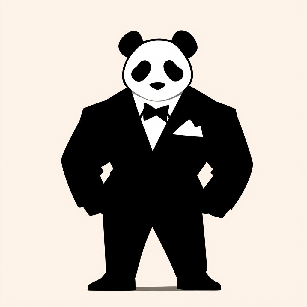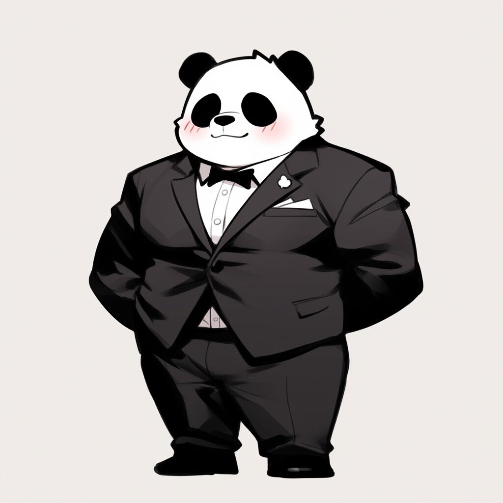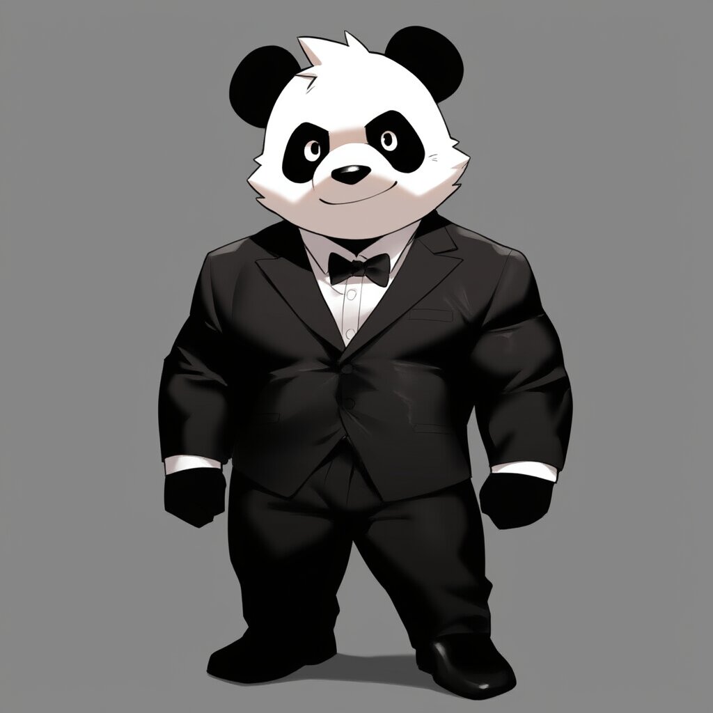 rating:general, best quality, amazing quality, great quality, very aesthetic, aesthetic, absurdres,chibi-style,rounded shapes,{panda},muscular,tuxedo,looking at viewer,full body,, rating:general, best quality, very aesthetic, absurdres