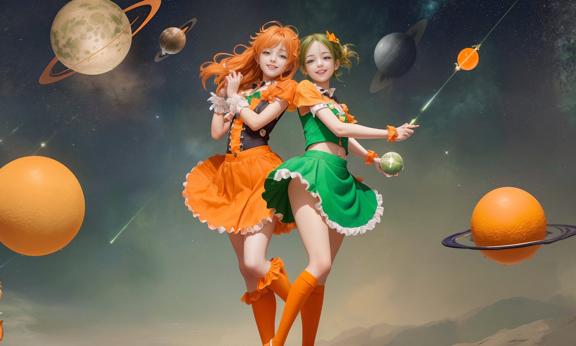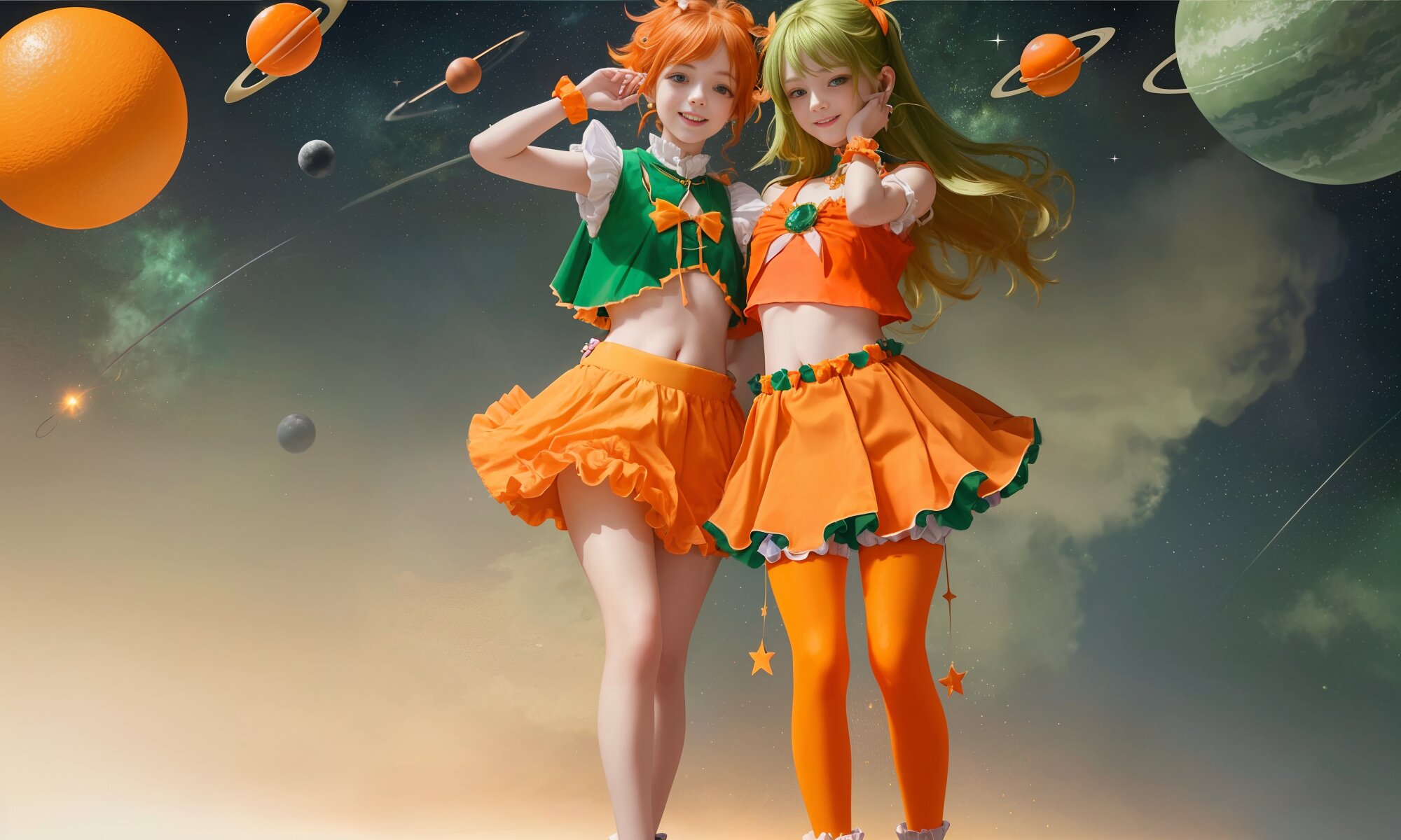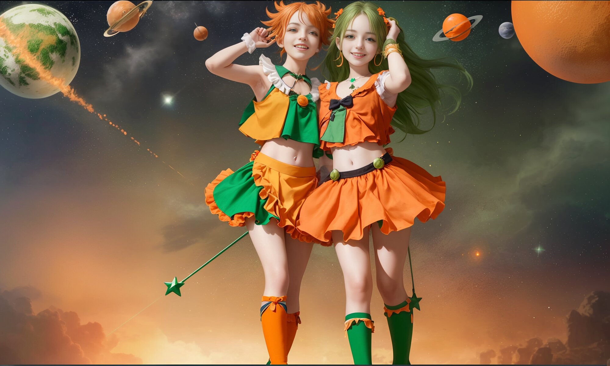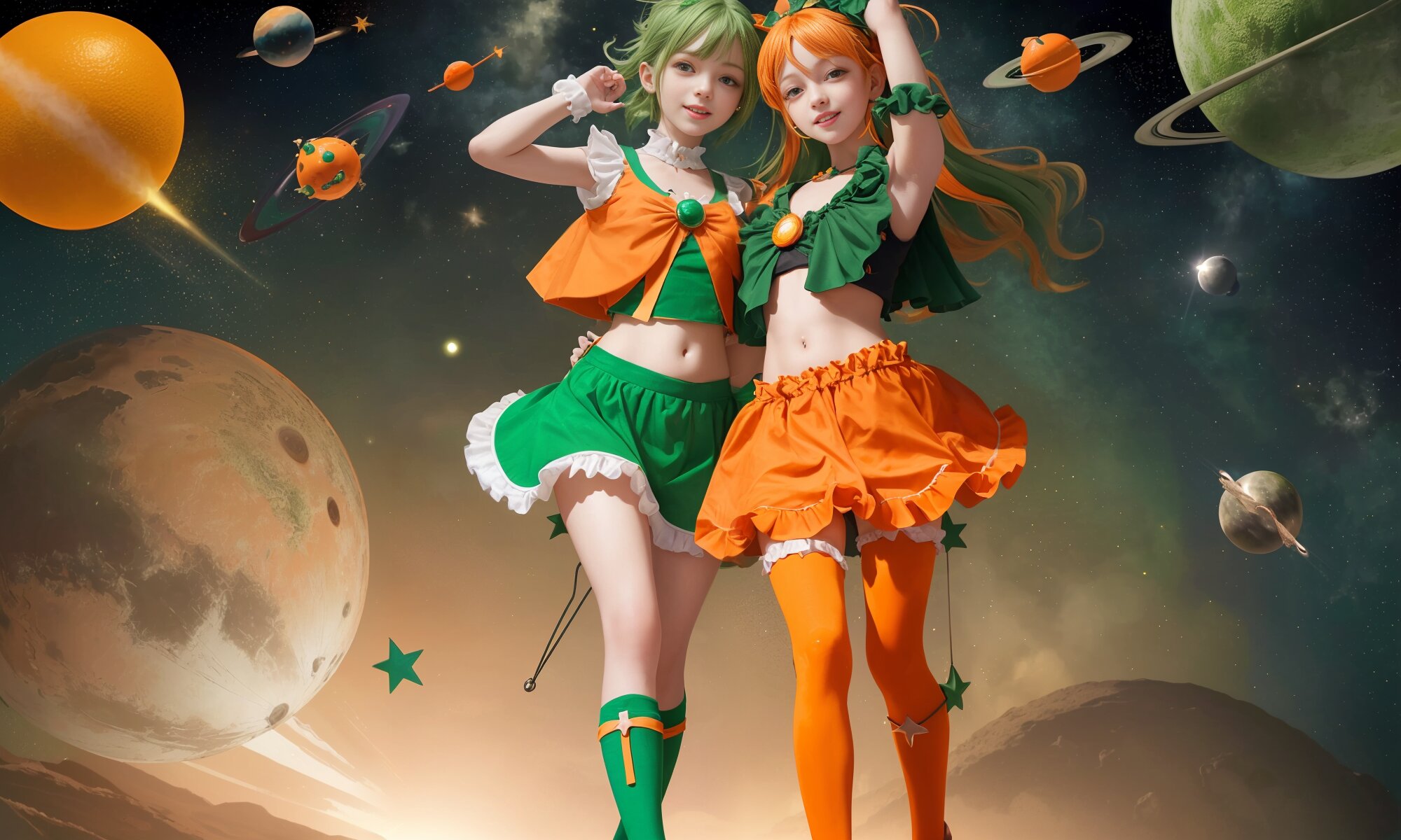 (smiling little 2 witches floating in space shooting_stars planets), (whole body), (orange and green colored hair with star_shaped hairpin), (black eyes), (flat chest) (thin thighs), (orange and green colored magical girl outfit, ruffle mini skirt:1.3), (magical brooch:1.1), gloves, hair bow, hair ornament, (ultra-detailed) (8k portrait) (masterpiece) (high quality) (photo realistic)