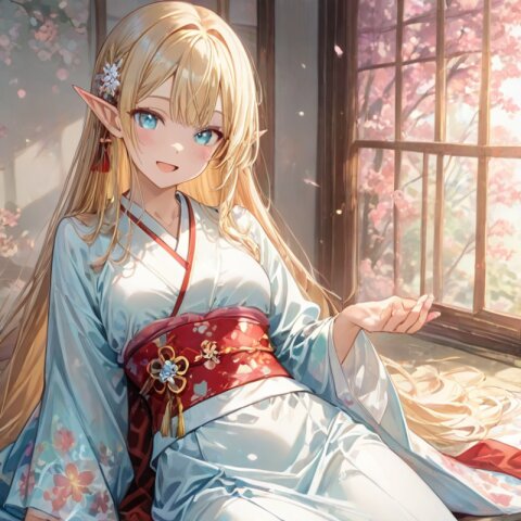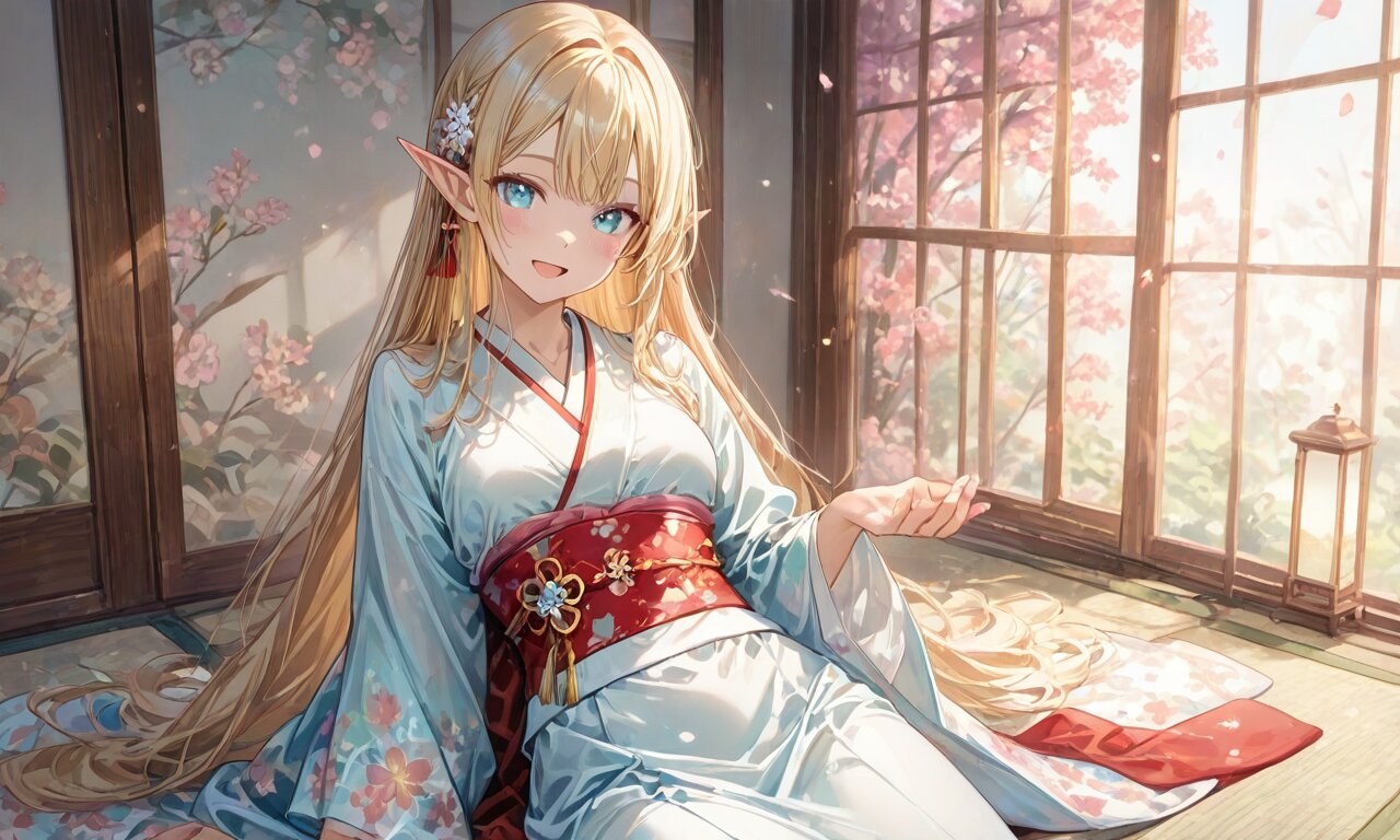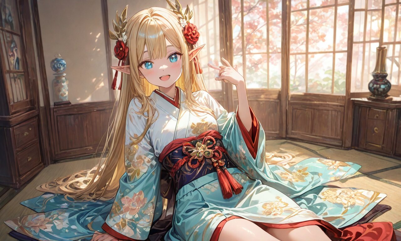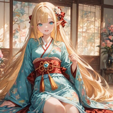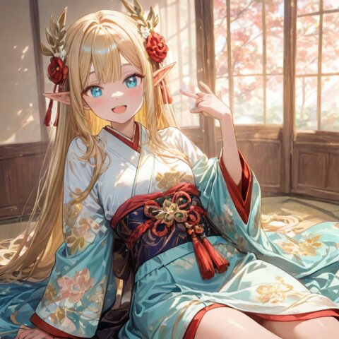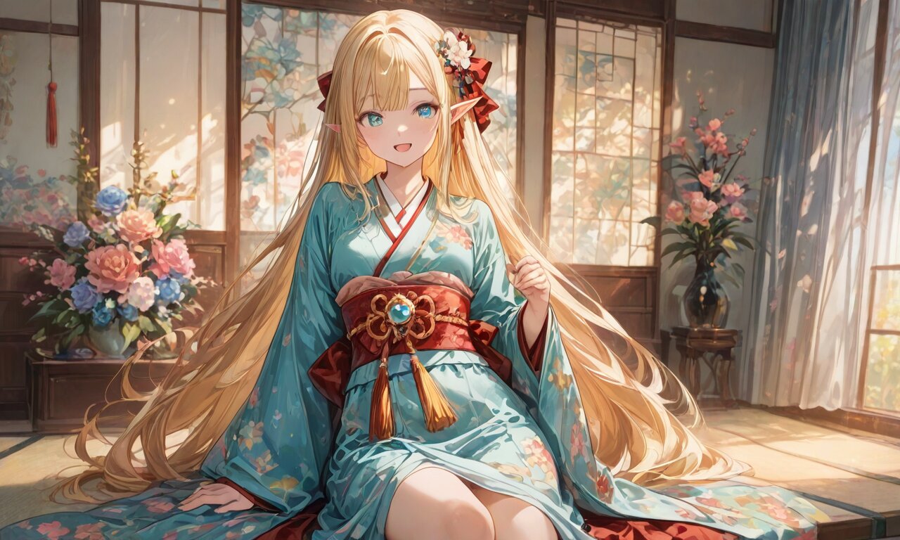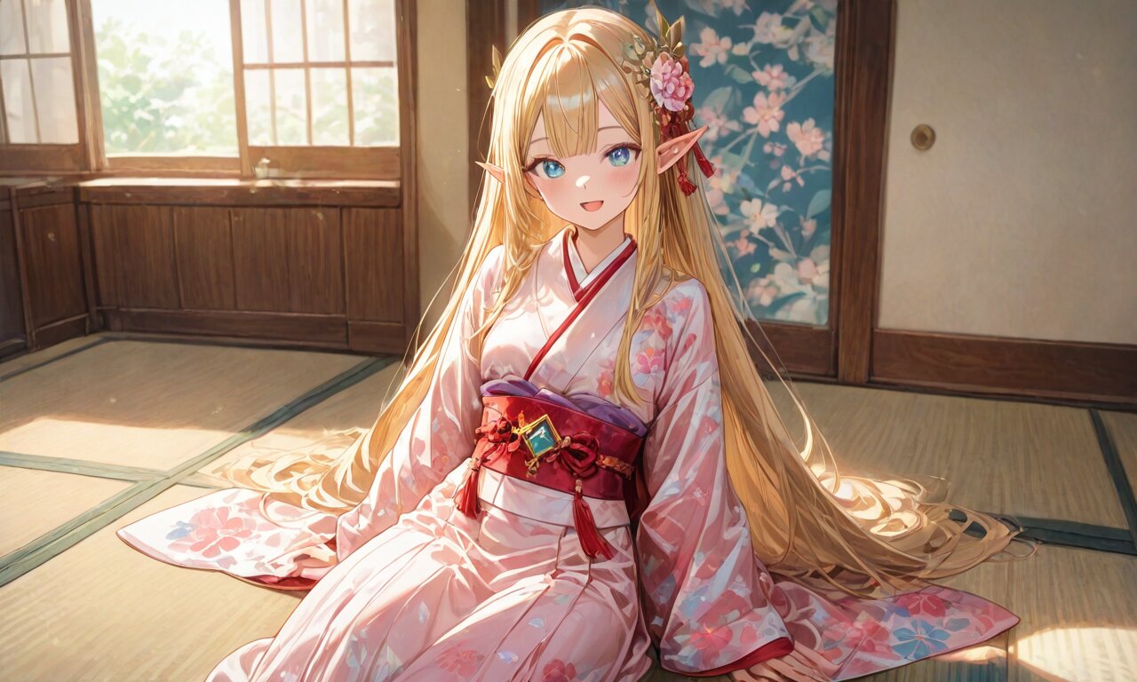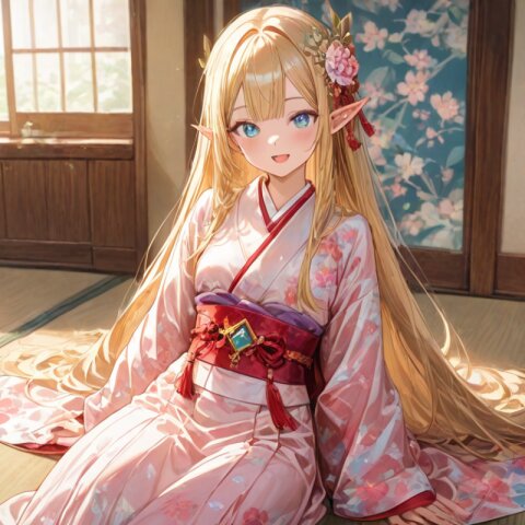 score_9, score_8_up, score_7_up, source_anime, bold lines, pastel colors, fine detail, Pure image, 2d, anime style, anime coloring, anime heroine, sharp focus, indoors, tatami room, Hinadan and Hina dolls, (sitting leaning back and gaze at me with open mouth big smile face), 1girl, solo, cowboy shot, (She is wearing a Elegant, beautiful furisode), kawaii, adorable, cute, elf girl, (apatite eyes with CGI effect), (deep blonde hair:1.2, sleek, smooth, Straight Hair), ((4k,8k,Ultra HD)),((Masterpiece :1.2)),((Best quality :1.2)),((Detailed :1.5)),((Detailed background :1.5)), ,