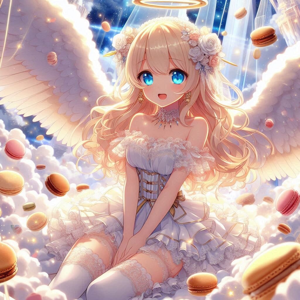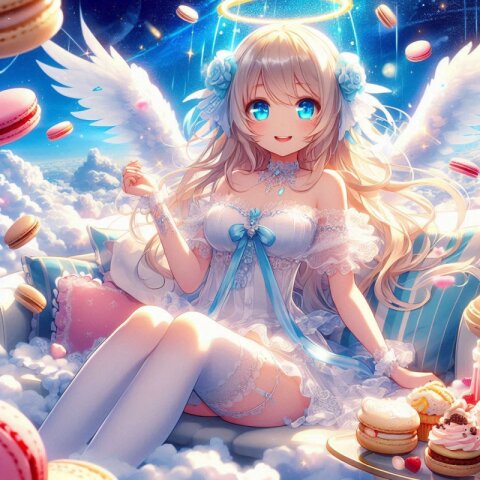 映画のポスターの様なイラスト。映画のラストシーンの様なダイナミックな構図と情景。オフィシャルアート。 日本のアニメの画風のセミリアルな萌えヒロイン。グラマラスで金髪碧眼の天使少女。ここは遙か上空の雲の世界。彼女は光と光の粒子で出来た天使の衣装を着て、フワフワの雲で出来たソファに座っている。彼女の周囲には無数のマカロンが浮かんでいる。彼女は沢山のお菓子に囲まれて満面の笑顔で私を見つめている。