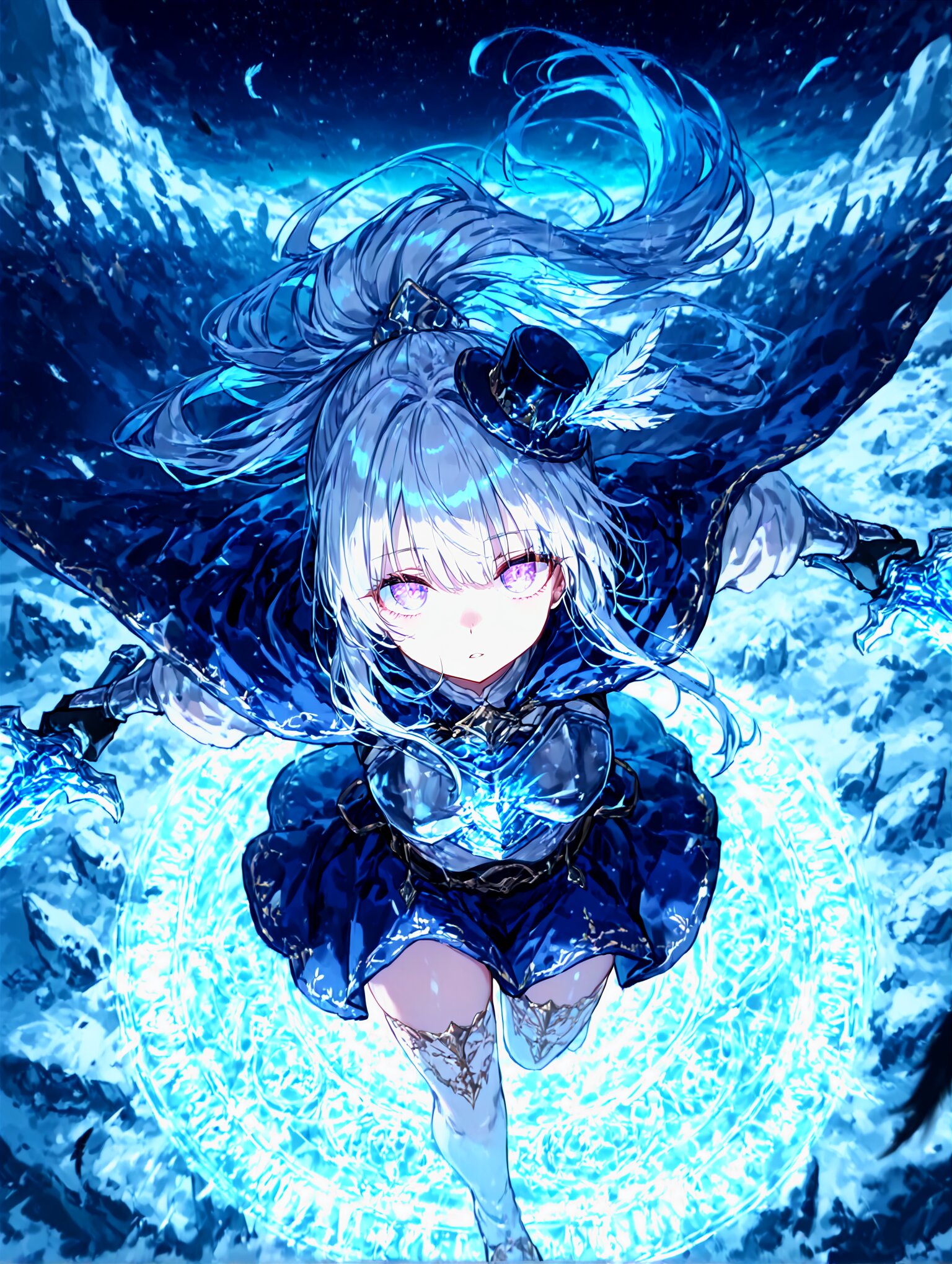 amazing quality,best quality,ultra-detailed,ultra-detailed-eyes, beautiful detailed background, (pale color:0.8), blue theme, night sky, solo,1girl, cinematic light,, parted lips,Expressionless, (big eyes:1.1),half-closed eyes, tareme, (glowing eyes:0.8), pale purple eyes,purple eyes, (silver hair:1.1), (dark blue hair colored inner hair:0.8), long hair,very long hair, ponytail, eyebrows visible through hair, mini hat, (star hair ornament,:0.7), darkblue accent cape,darkblue skirt, embroidery silver breastplate, thighhighs, dash,sprinting, action,motion linesmotion blur, ,holding weapon,dual wielding,twin swords,Underhand grip, fighting spirit,luminous, (ice magic,:0.8),(magic circle:0.7),ice wing,feathers, outdoors,wilderness white desert, from above, looking up, perspective, (looking at viewer,:0.8) , <lora:noline-16oa:-1.2> <lora:sdxl2-flat2-512b:0.5>