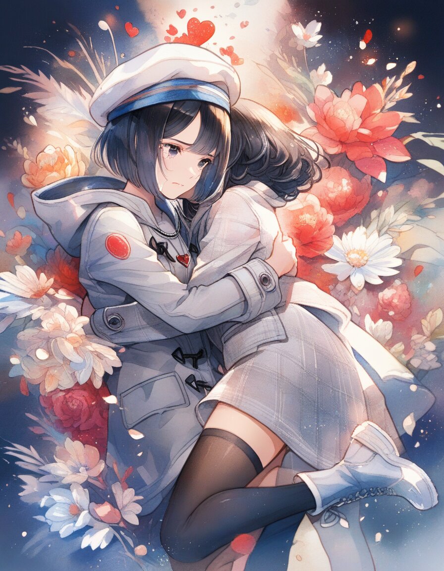 masterpiece, ultra detailed, 2women, black bob, black eyes, grey dress, indigo duffel coat, white beret, red heart necklace, stockings, short boots, crying, meeting her close friend and hugging, watercolor
