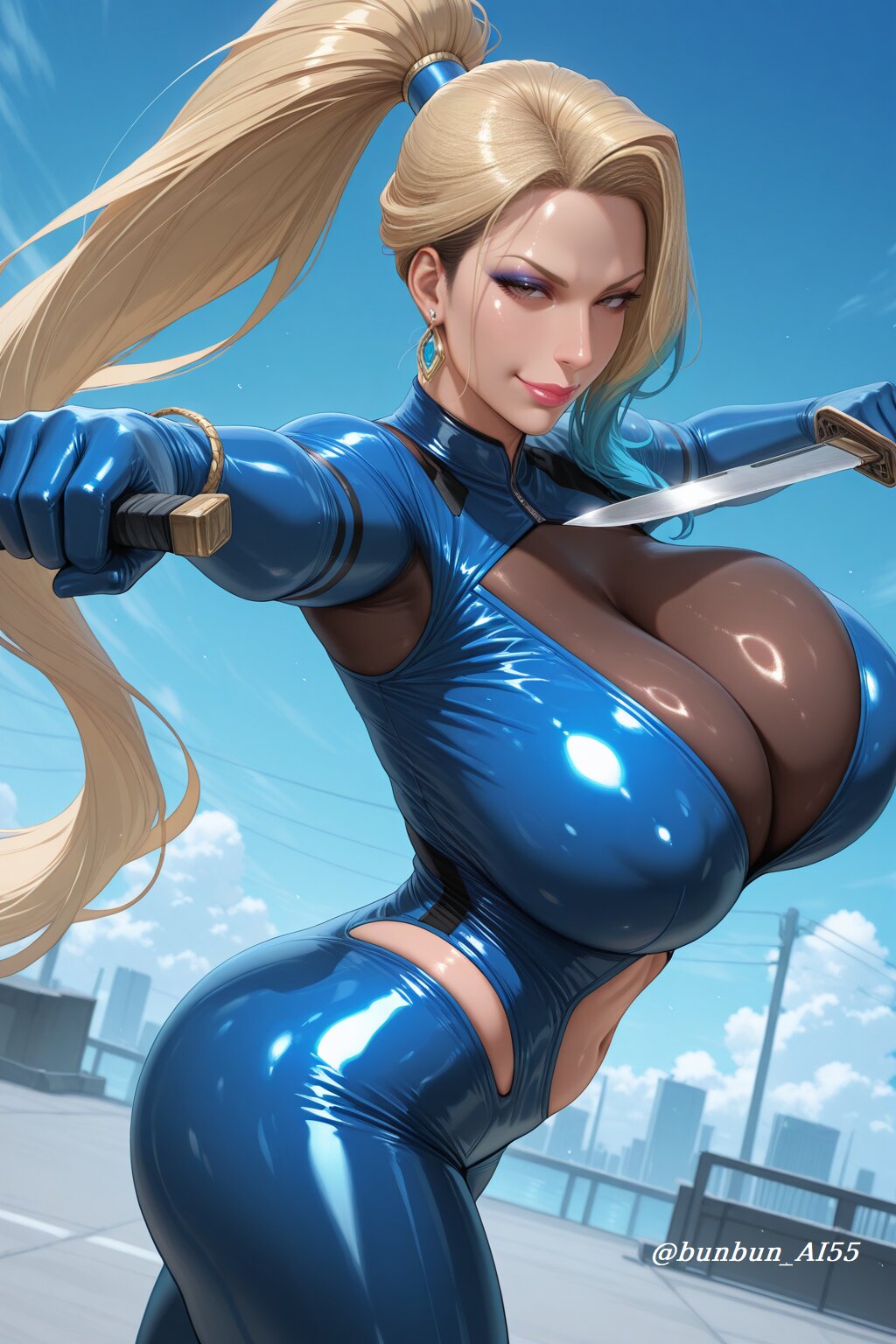HDR, 8K,masterpiece, best_quality, amazing quality, very aesthetic, absurdres, newest, detailed eyes, realistic eyes, realistic body,(realistic, photorealistic), highres, ultra realistic, BREAK perfect lighting, professional lighting, (1girl, beautiful woman, 35year old), (adult, milf), (slim face, small face, detailed face, high nose, makeup, tsurime), (looking at viewer, naughty face), (jewelry, piercing, earrings, bracelet), (blonde and brown multicolored hair, very long ponytail), (huge breasts, pointy breasts), long legs, curvy, (perfect hands), (shiny skin), (wearing a cutout bodysuit over bodystocking:1.2), (white and blue multicolored cutout bodysuit, bodystocking), (latex gloves), (latex, glossy, luster, shiny), (dynamic pose:1.2), (holding long knife:1.2, dual wielding), (detailed background, cyberpunk background, outdoor), (from side, straight-on), ((bust-up shot, medium shot, dutch angle)),