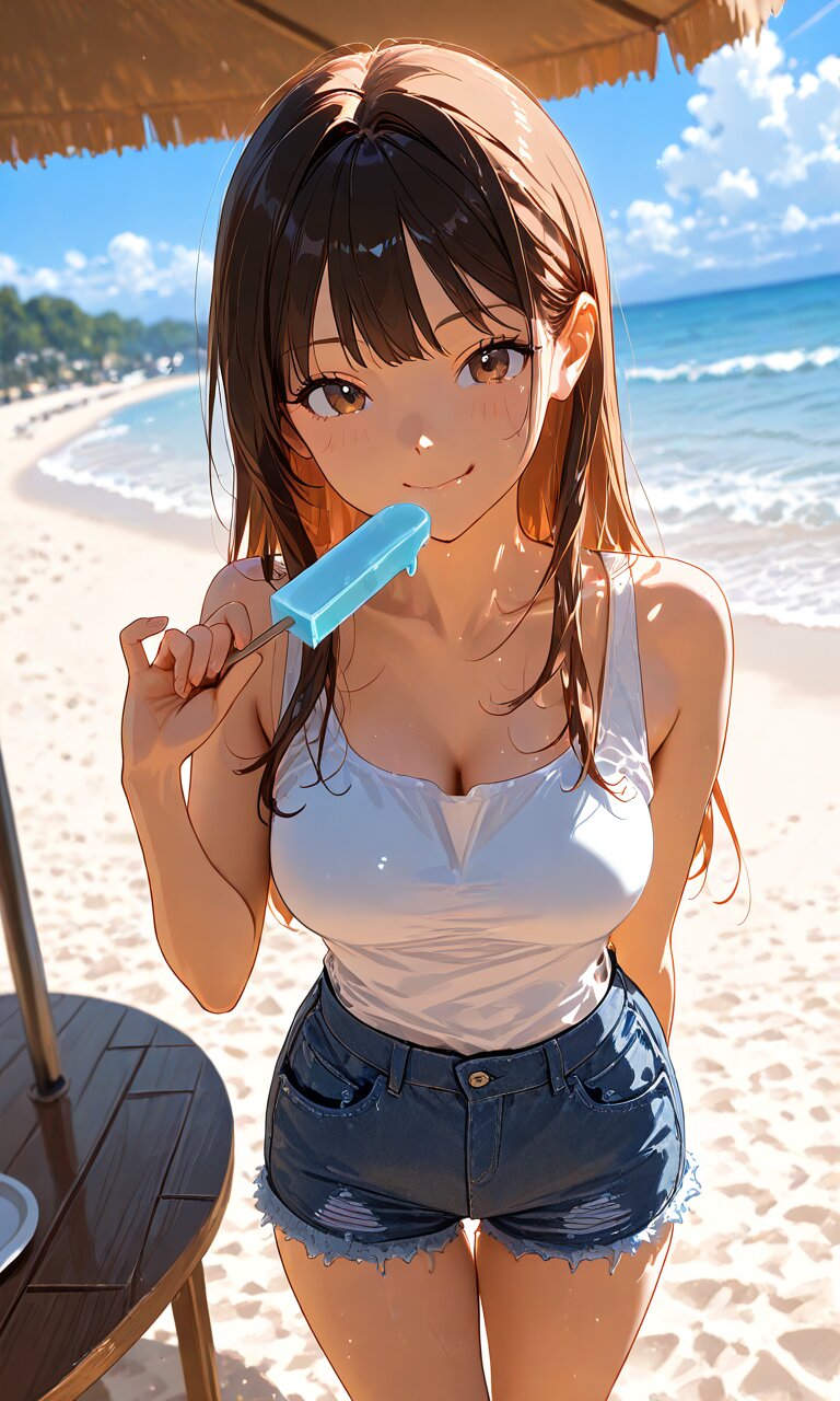 1 lady, white tank top, short denim, (eating ice cream), beach, smile