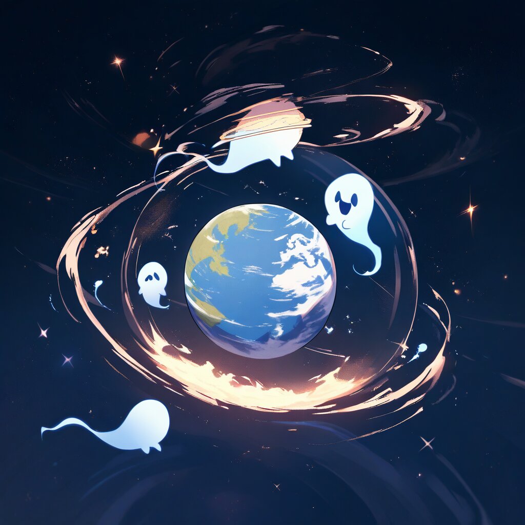 This illustration shows a ghost circling the globe., ghost, space, ster, earth, chibi, masterpiece, great score, high score, absurdre