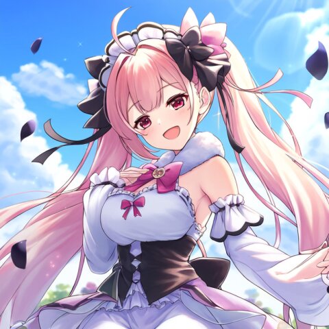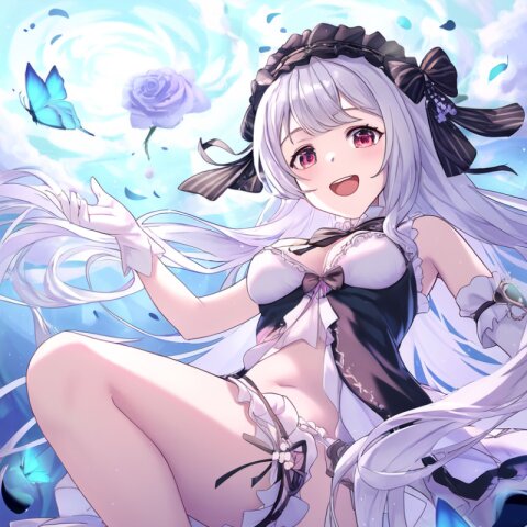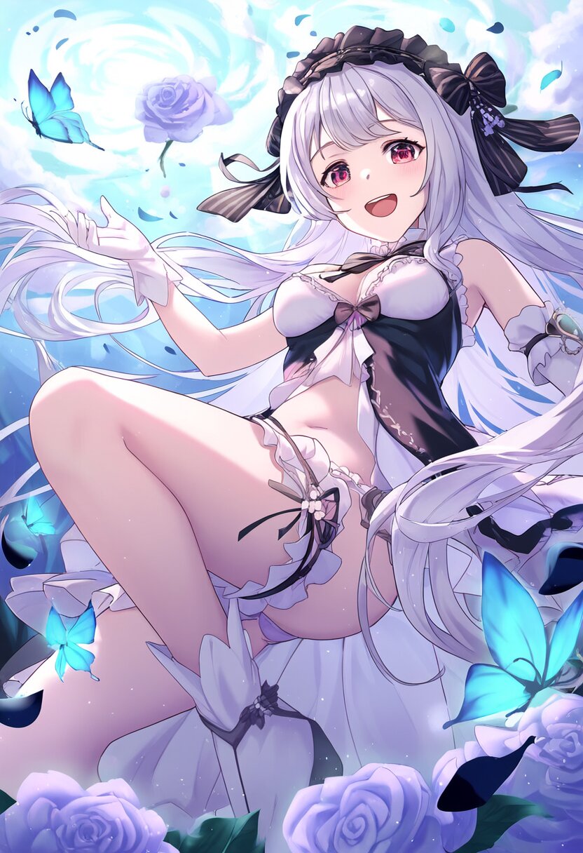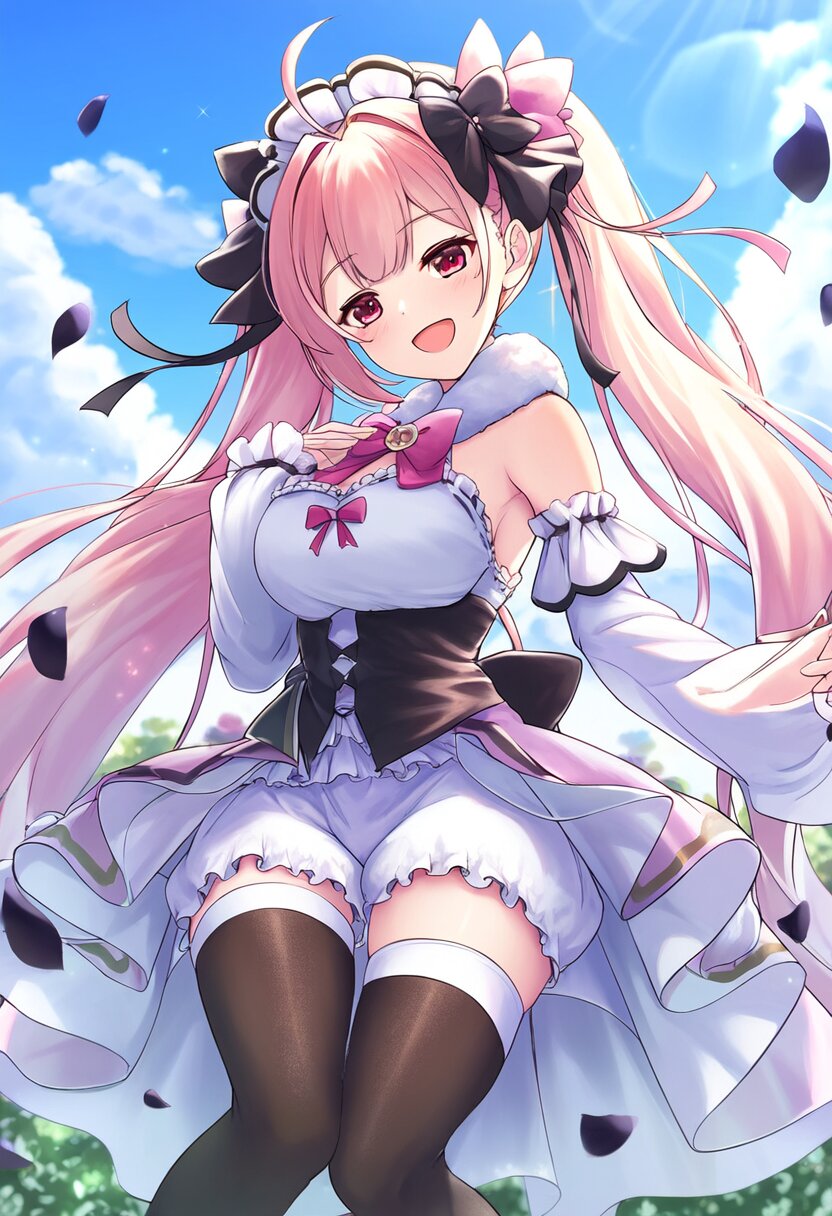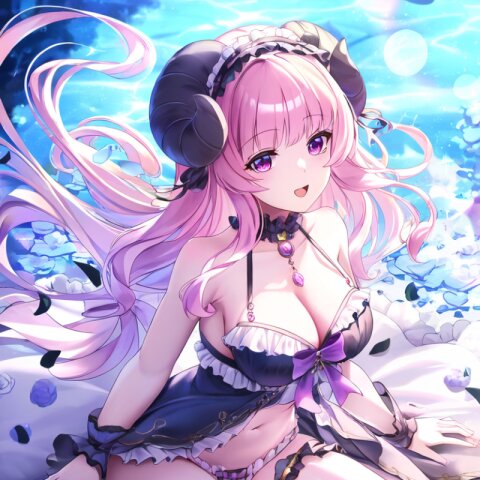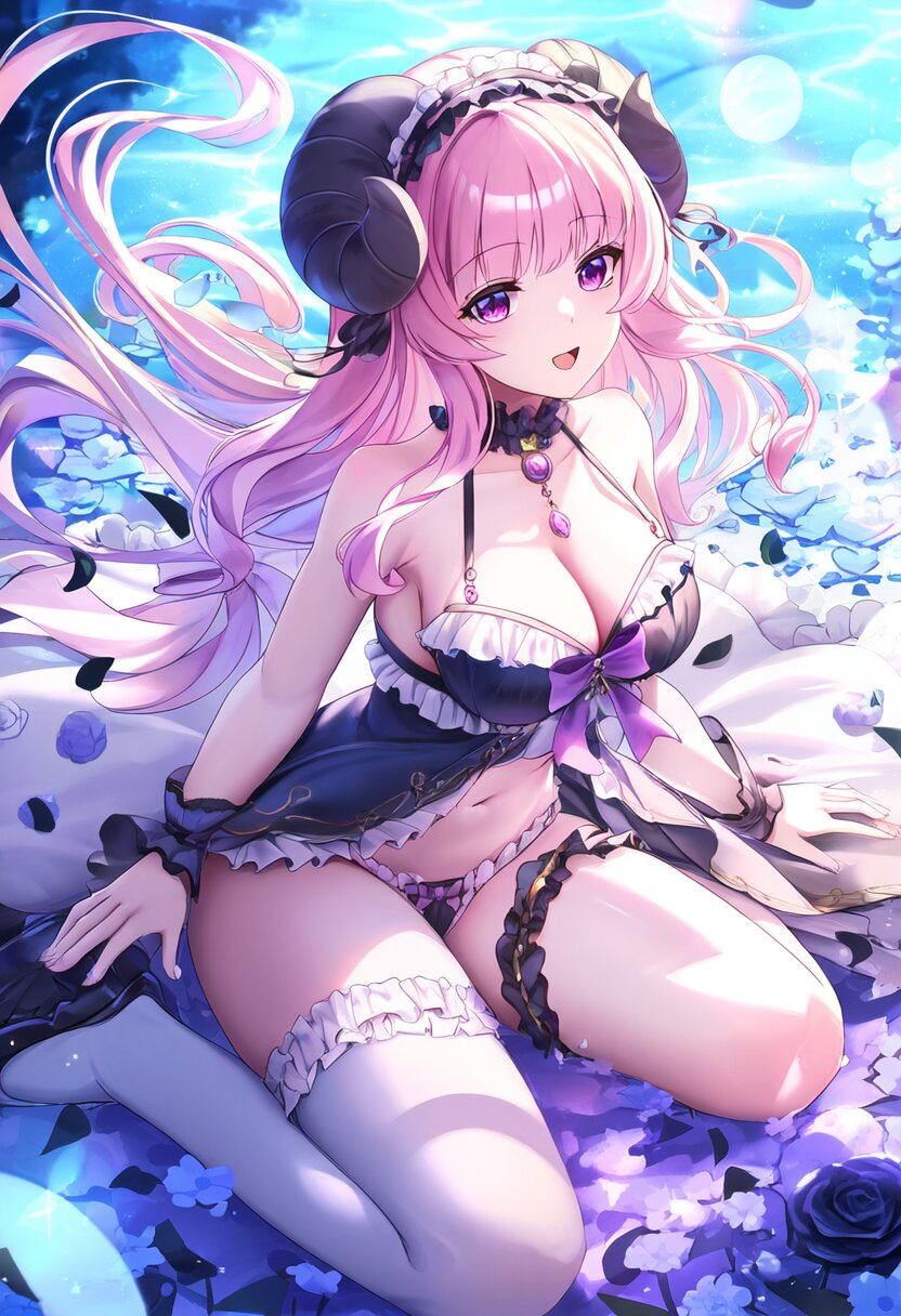 A girl in a whimsical garden cosplays as a sheep, wearing frilly magical underwear adorned with chiffon ribbons and shimmering beads. Black petals float in the background as magical particles create an enchanting atmosphere., best quality, amazing quality, very aesthetic, absurdres