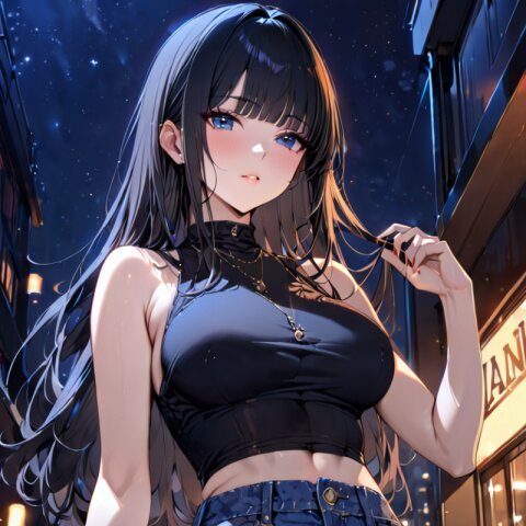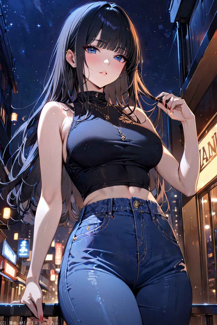 (best quality),(masterpiece),(ultra detailed),1 lady, long hair, black hair, blunt bangs, sleeveless shirt, black shirt, blue pants, , breasts, cool, cowboy shot, night,