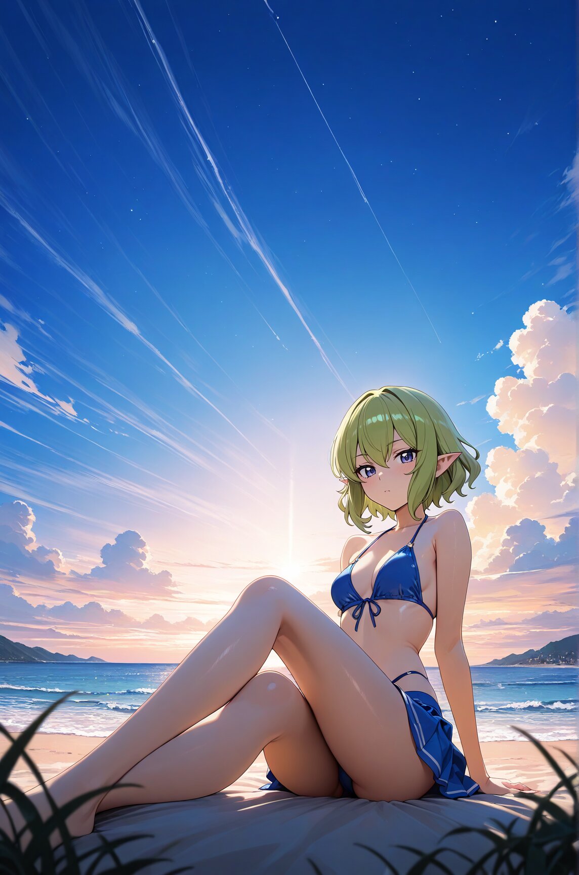 Is It Wrong to Try to Pick Up Girls in a Dungeon?, Ryu Lion, nickname is Hayate, bikini, swimsuit mini skirt, professional anime illustration, cute girl with a loli face. Ryu Lion has a young face and body, good balance between head and body, Ryu Lion is a petite and short girl, detailed illustration, be more creative, anime draft, vivid colors, Hikari, (EyesHD:1.2), masterpiece, one girl, solo, one girl, 4.5 head and body, attractive body line, nice proportions, waist curve, (details allow you to see the body line clearly.:1.2), 16K, best image quality, highly detailed image, ultra high quality, beauty, curvaceous, (highest quality), (high resolution 16K), (very stylish cute girl), HDR, high quality, high resolution, beautiful texture, exquisite details, Impasto, vivid colors, Hikari , (EyesHD:1.2), Masterpiece, Top Quality, Super Detailed, Very Aesthetic, Sharp Focus, Depth of Field, Ray Tracing, Best Lighting, Detailed Illustrations, Detailed Backgrounds, Like a Movie, Beautiful Face, Beautiful Eyes, The Circular City of Orario, The city is surrounded by sturdy and massive city walls, and the outer perimeter has more tall buildings, To the east of Orario, located at the westernmost tip of the continent, there is a grassland that spreads out, Outside the Circular City of Orario, Plateau, Ocean, Beachside, Sandy Beach, Ocean at Night, Beautiful Ocean, Beautiful Night Sky with Stars, Ryu Lion is sitting on the grass with his legs stretched out in a woman's sitting position, knees together, knees together, knees in a woman's sitting position, leaning back, back arched, background like a scene from a movie, Beautiful Hands, Beautiful Body, looking this way, masterpiece, best quality, newest, very awa