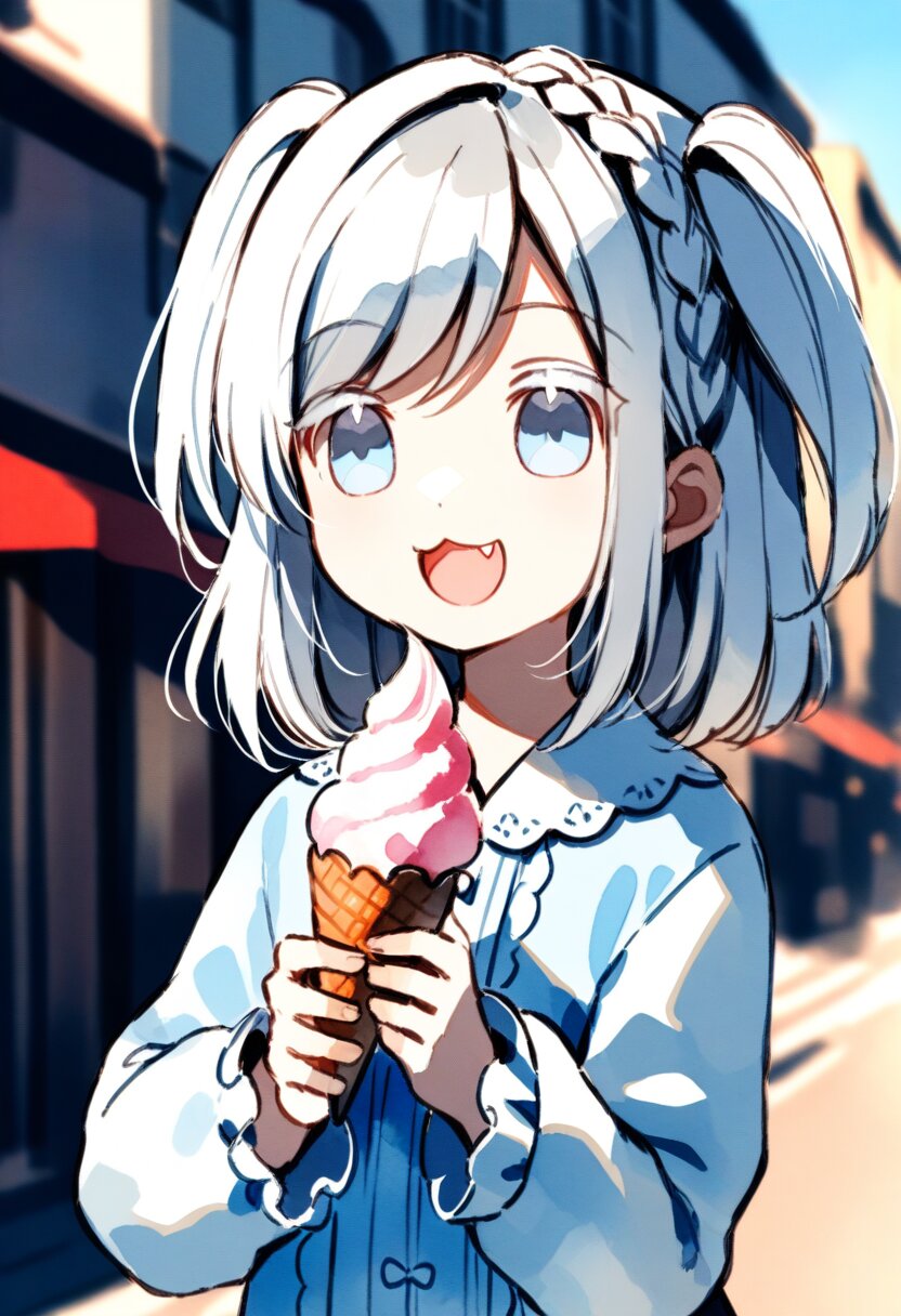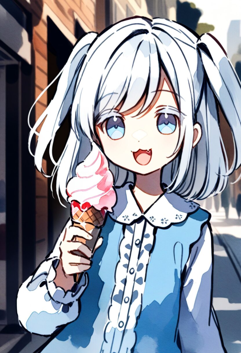 <lora:inmnstylexl:1>, best quality, masterpiece, very aesthetic, watercolor painting, general, 1girl, 10 years old, white hair, two side up, medium hair, braid bangs, swept bangs, pale blue eyes, white colored eyelashes, :3, fang, white frilly longsleeves dress, holding strawberry ice cream, smile, open mouth, upper body, street