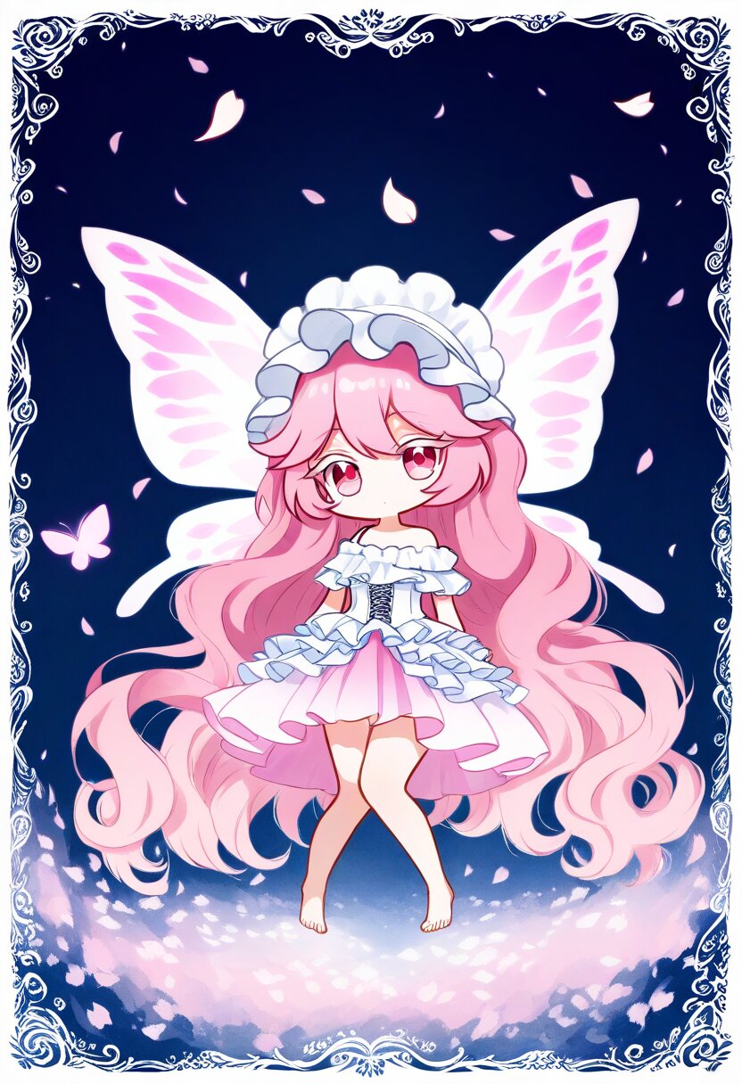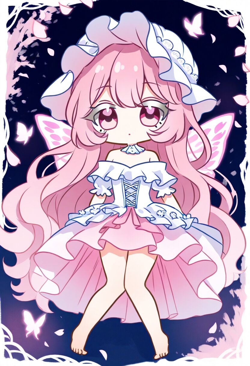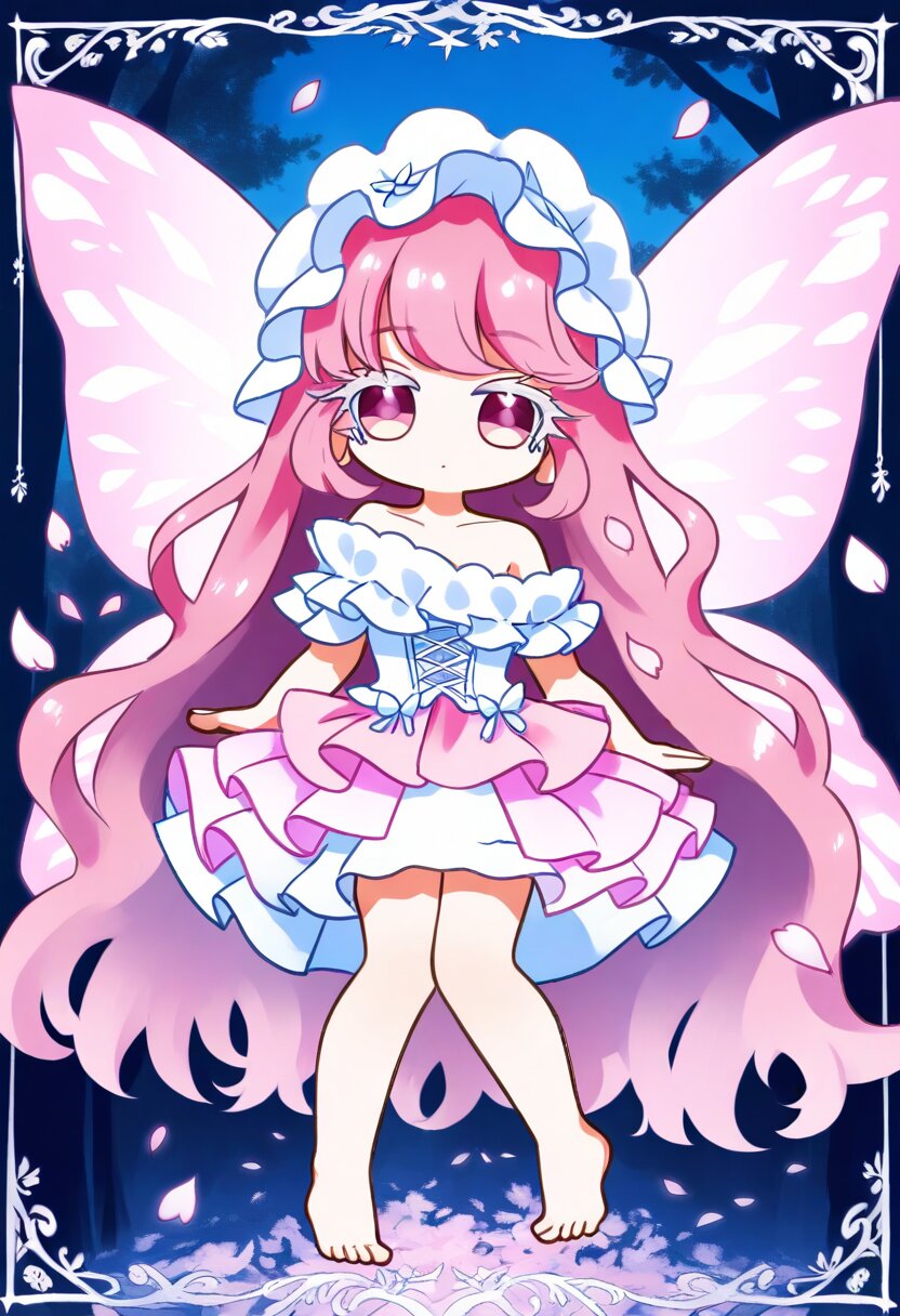 <lora:inmnsylexl4:1>best quality, masterpiece, very aesthetic, general, watercolor painting, chibi, 1girl, pink hair, very long hair, wavy hair, pink eyes, thick eyelashes, large eyes, lolita fashion, offshoulder pink to white gradient dress, white lace-up corset, pink to white gradient skirt, thigh, (skirt is voluminous with multiple layers of frills and ruffles, open at the front, revealing legs), barefoot, pink head frill, glowing pink butterfly wings, knees together feet apart, (flattering petals:1.2), (decorative border:1.4), night forest