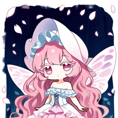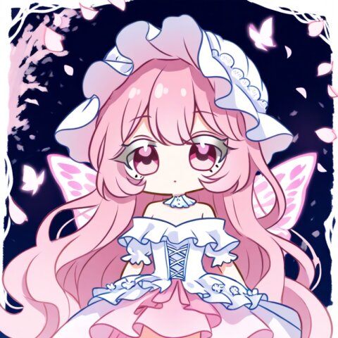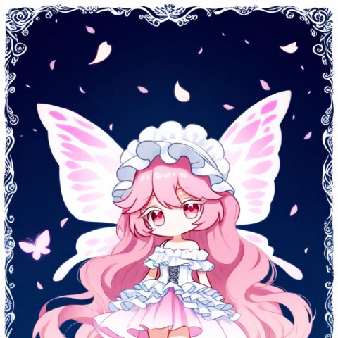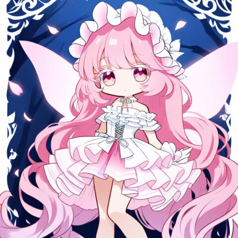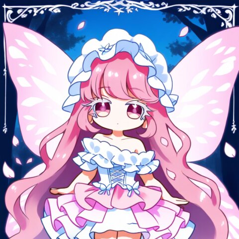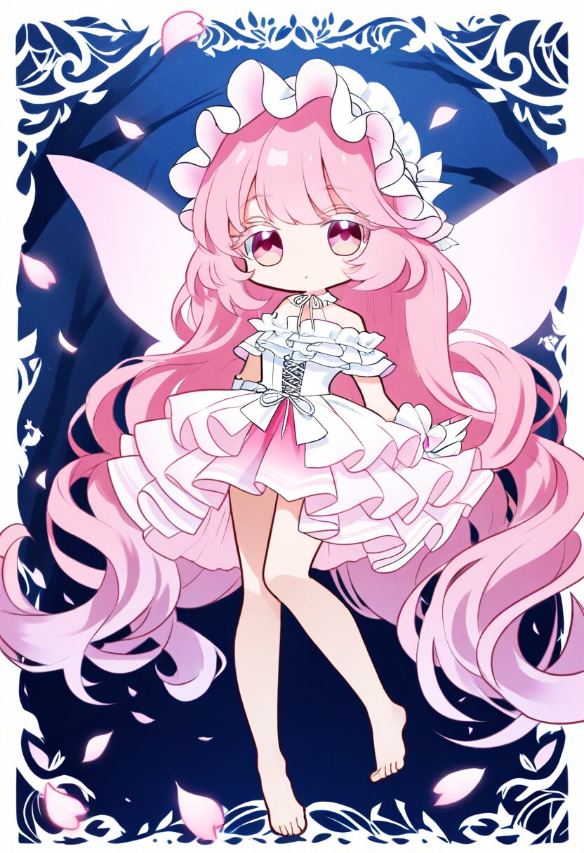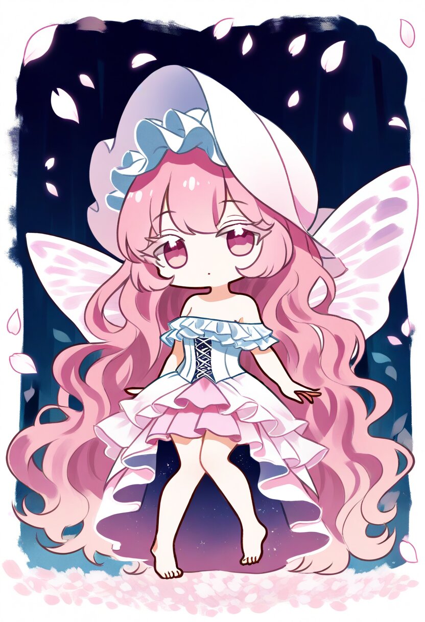 <lora:inmnsylexl4:1>best quality, masterpiece, very aesthetic, general, watercolor painting, chibi, 1girl, pink hair, very long hair, wavy hair, pink eyes, thick eyelashes, large eyes, lolita fashion, offshoulder pink to white gradient dress, white lace-up corset, pink to white gradient skirt, thigh, (skirt is voluminous with multiple layers of frills and ruffles, open at the front, revealing legs), barefoot, pink head frill, glowing pink butterfly wings, knees together feet apart, (flattering petals:1.2), (decorative border:1.4), night forest