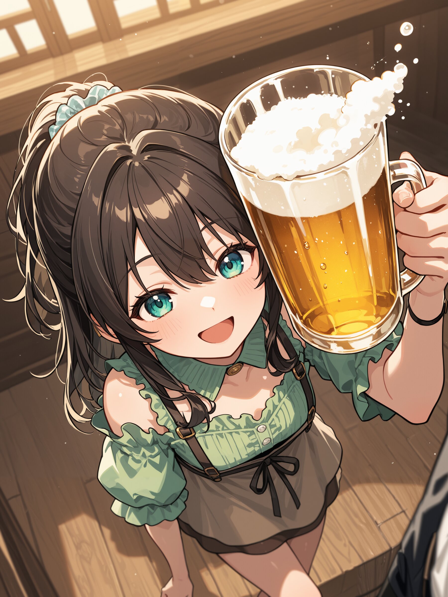 masterpiece,best quality,ultra detail,intricate detail,absolutely resolution,8k, newest,digital-cel,depth of field, rating safe, anime illustlation,cute, from above, holding beer mug, arm up, happy,
