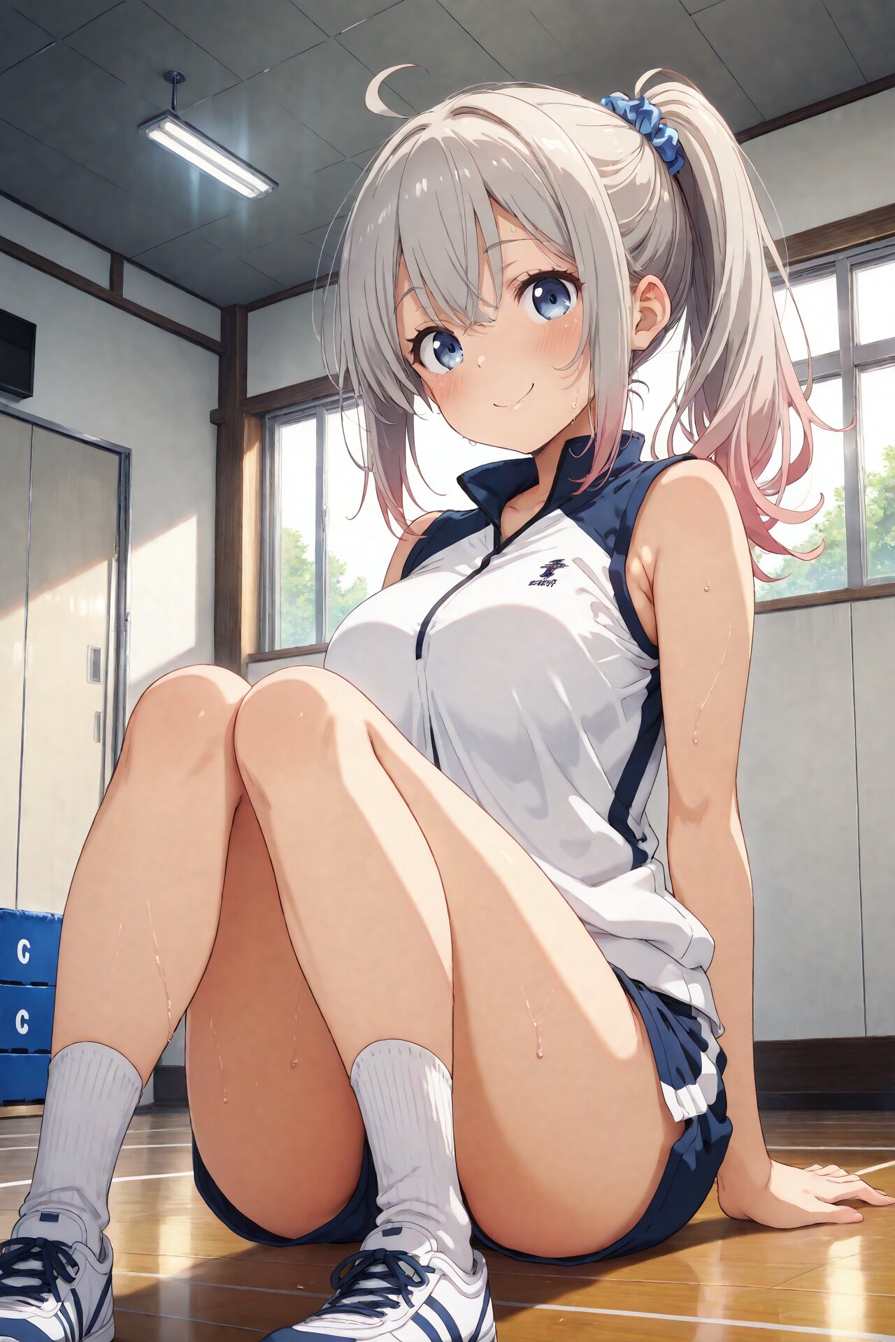masterpiece, best_quality, sportswear, indoors, smile, sweat,