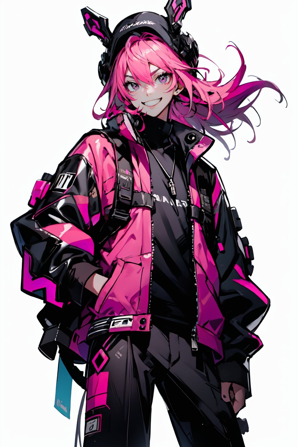 male focus,absurdres,detailed and intricate, (best quality), BREAK,perfect proportion,solo,(1boy),happy smile, BREAK,pink hair, BREAK,black eyes, BREAK,casual style, BREAK,(black,pink:1.5), (dynamic Angle,dynamic pose),