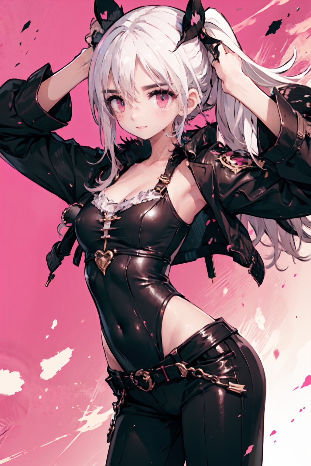 absurdres,detailed and intricate, (best quality), BREAK,perfect proportion,solo,(1girl),happy smile, BREAK,pink hair, BREAK,black eyes, BREAK,pink black techware,(black,pink:1.5), (dynamic Angle,dynamic pose),