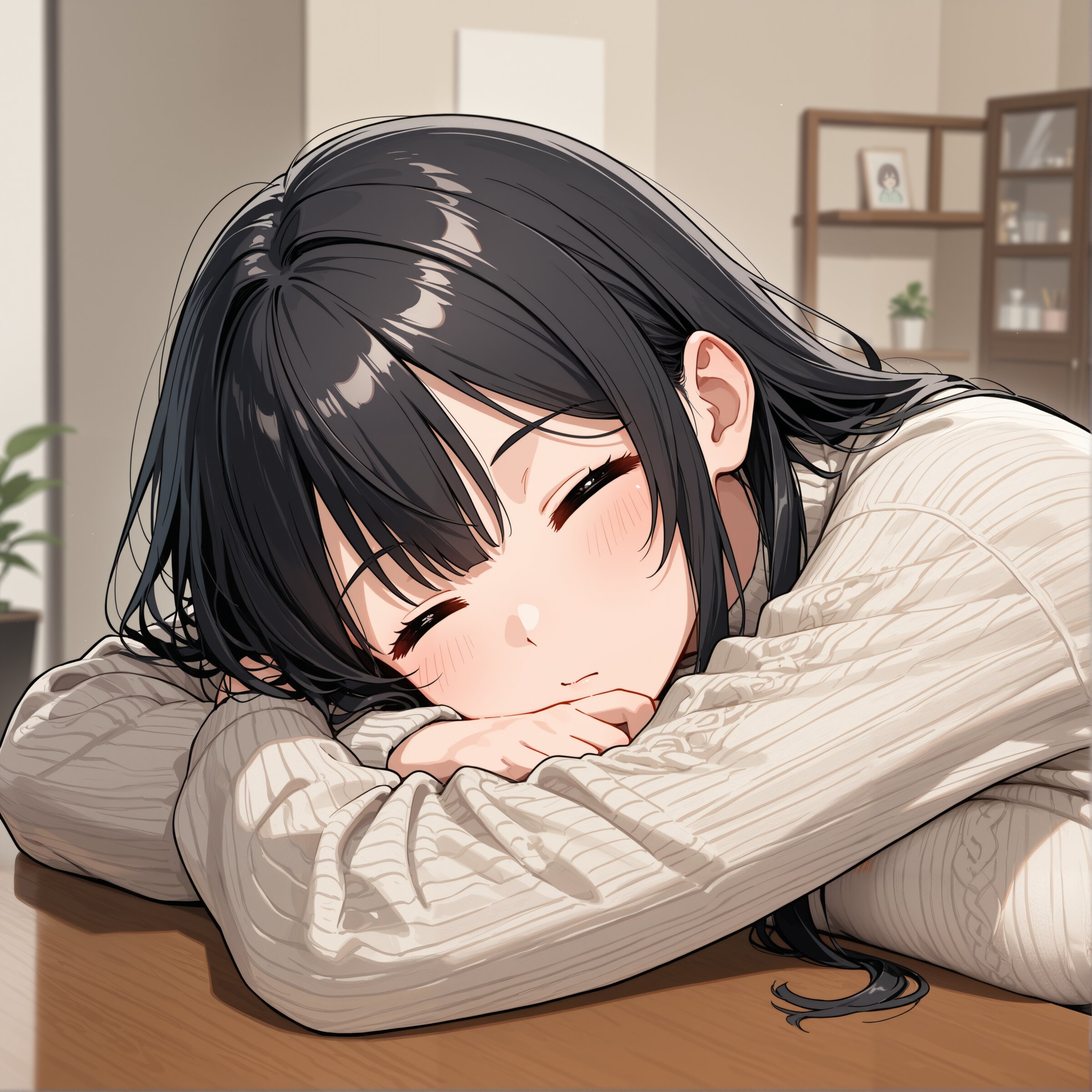 masterpiece,best quality,ultra detail,intricate detail,absolutely resolution,8k, newest,digital-cel,depth of field, rating explicit, anime illustlation,cute, sweater, head rest,head on table,= =,