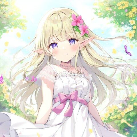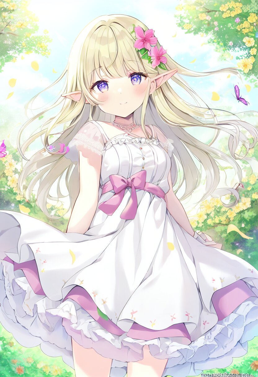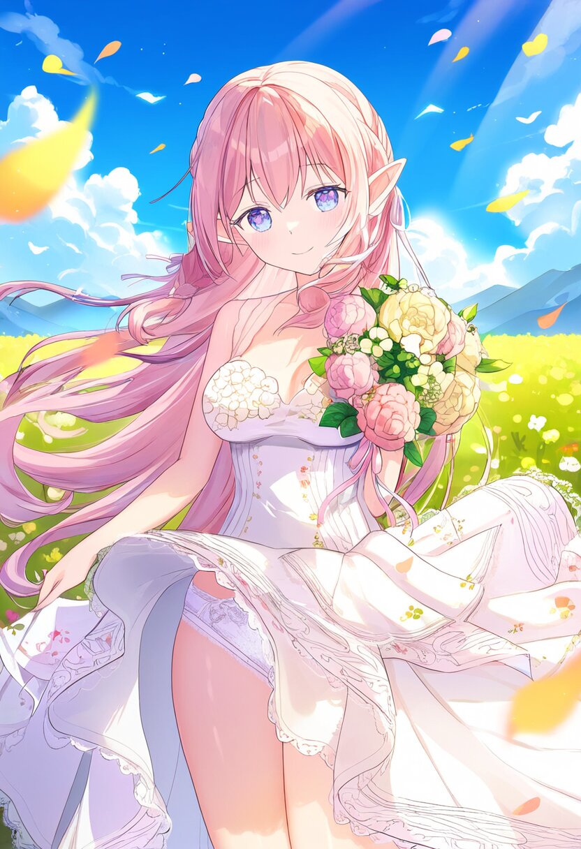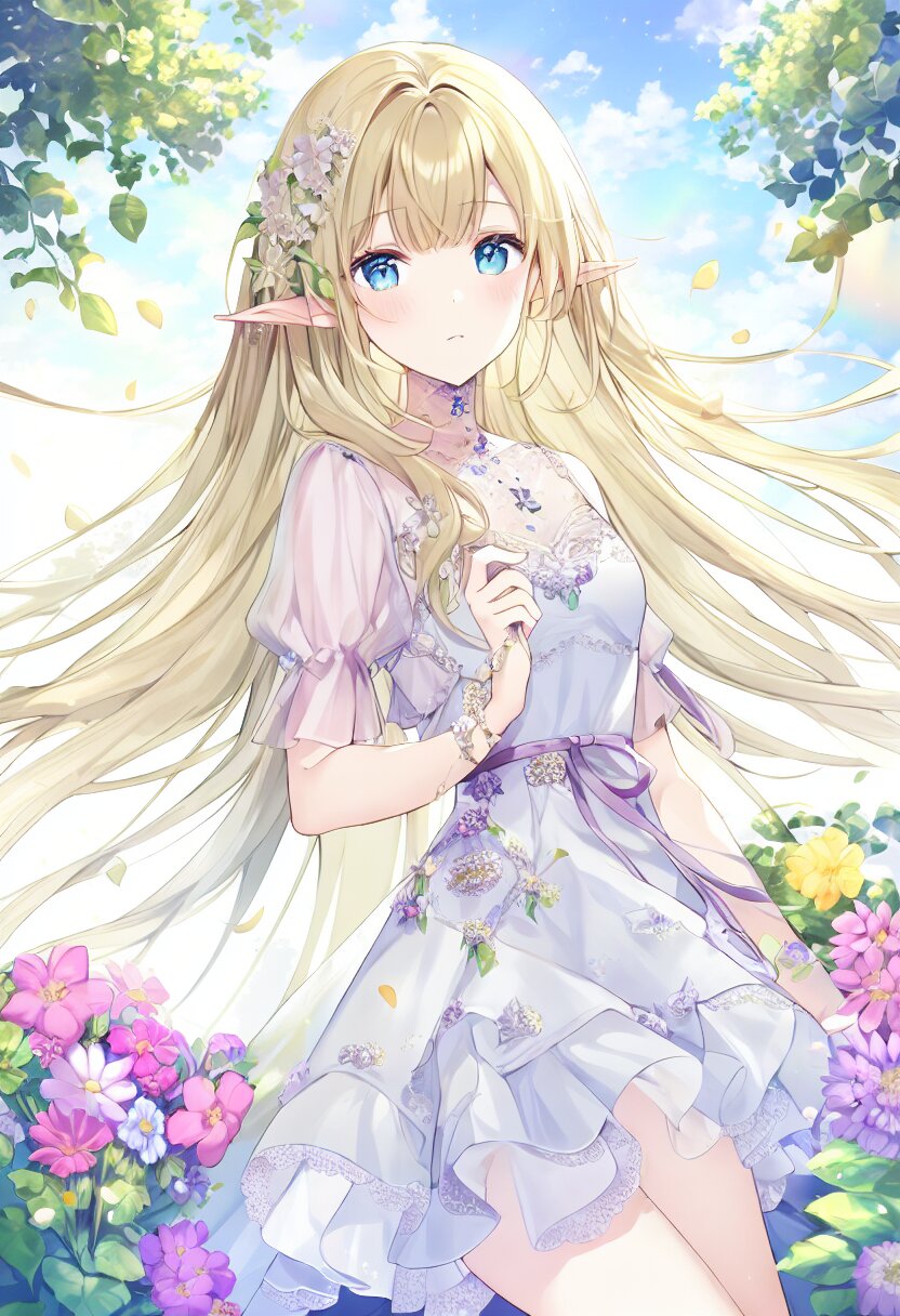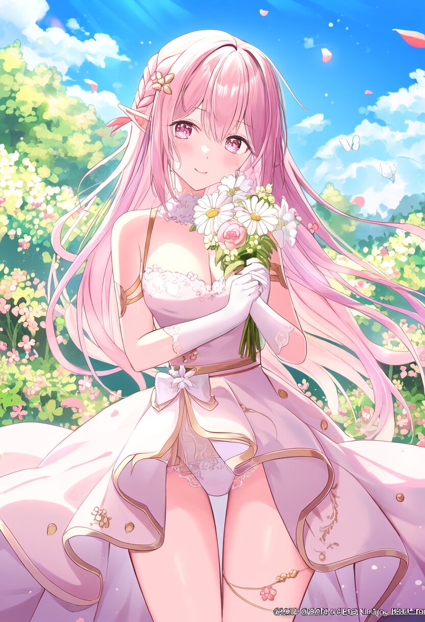 very aesthetic, best quality, absurdres, "One afternoon, I met a cute elf girl in the flower garden." She has long, soft hair that is adorned with a pale pink ribbon. Her outfit is made of light silk and lace in pale tones that sway in the breeze as she moves gracefully. She wears a flower-inspired dress with corolla and petal decorations. She sits in the middle of a flower garden, surrounded by flowers of various colors. All around her are flowers of bright pinks, soft purples and gentle yellows. In her hand is a small bouquet of brightly colored butterflies that appear to be clustered together. In the background, you can see the blue sky and white clouds, and lush trees in the distance. The fields of flowers around her seem to sway and dance in the wind.., with blush cheeks, official art, {{ultra-detailed}}, {{high resolution}}, dynamic fuzziness, colorful, cowboy shot, underwear, girl ,solo, 20 years old,