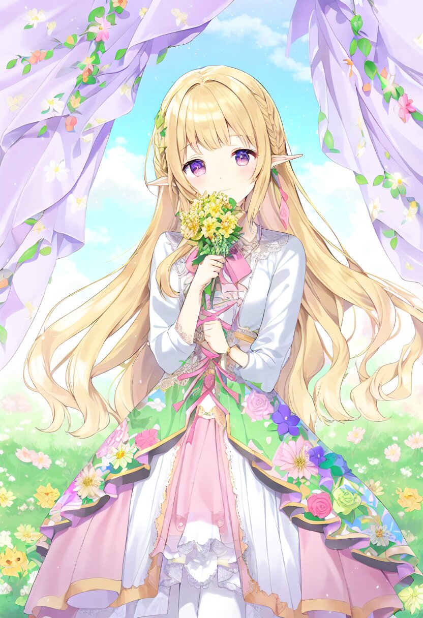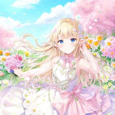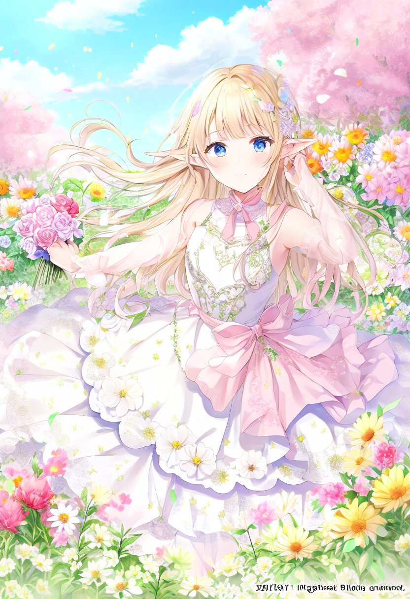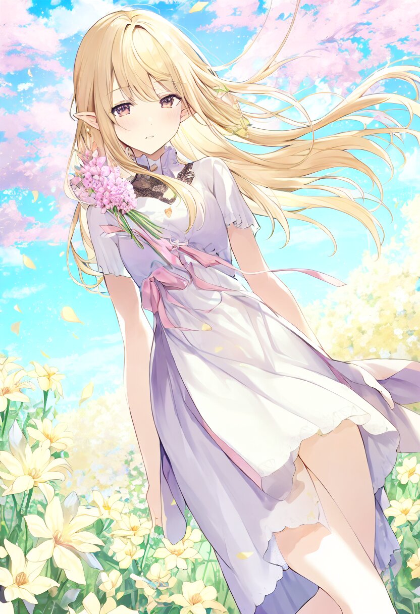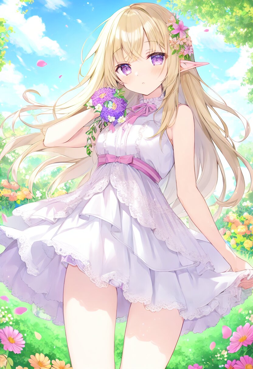 very aesthetic, best quality, absurdres, "One afternoon, I met a cute elf girl in the flower garden." She has long, soft hair that is adorned with a pale pink ribbon. Her outfit is made of light silk and lace in pale tones that sway in the breeze as she moves gracefully. She wears a flower-inspired dress with corolla and petal decorations. She sits in the middle of a flower garden, surrounded by flowers of various colors. All around her are flowers of bright pinks, soft purples and gentle yellows. In her hand is a small bouquet of brightly colored butterflies that appear to be clustered together. In the background, you can see the blue sky and white clouds, and lush trees in the distance. The fields of flowers around her seem to sway and dance in the wind.., with blush cheeks, official art, {{ultra-detailed}}, {{high resolution}}, dynamic fuzziness, colorful, cowboy shot, underwear, girl ,solo, 20 years old,