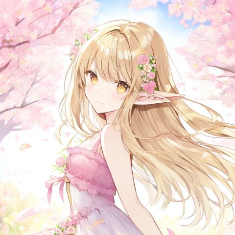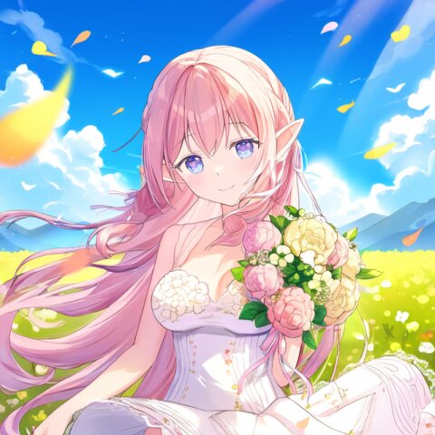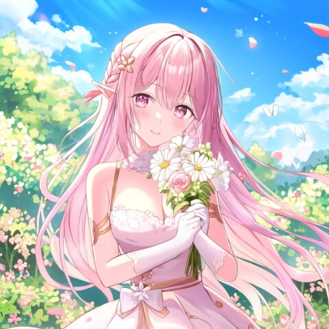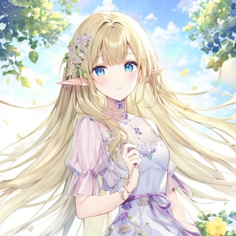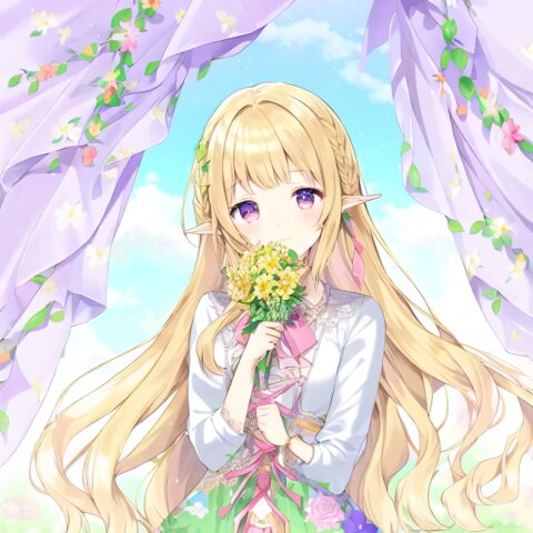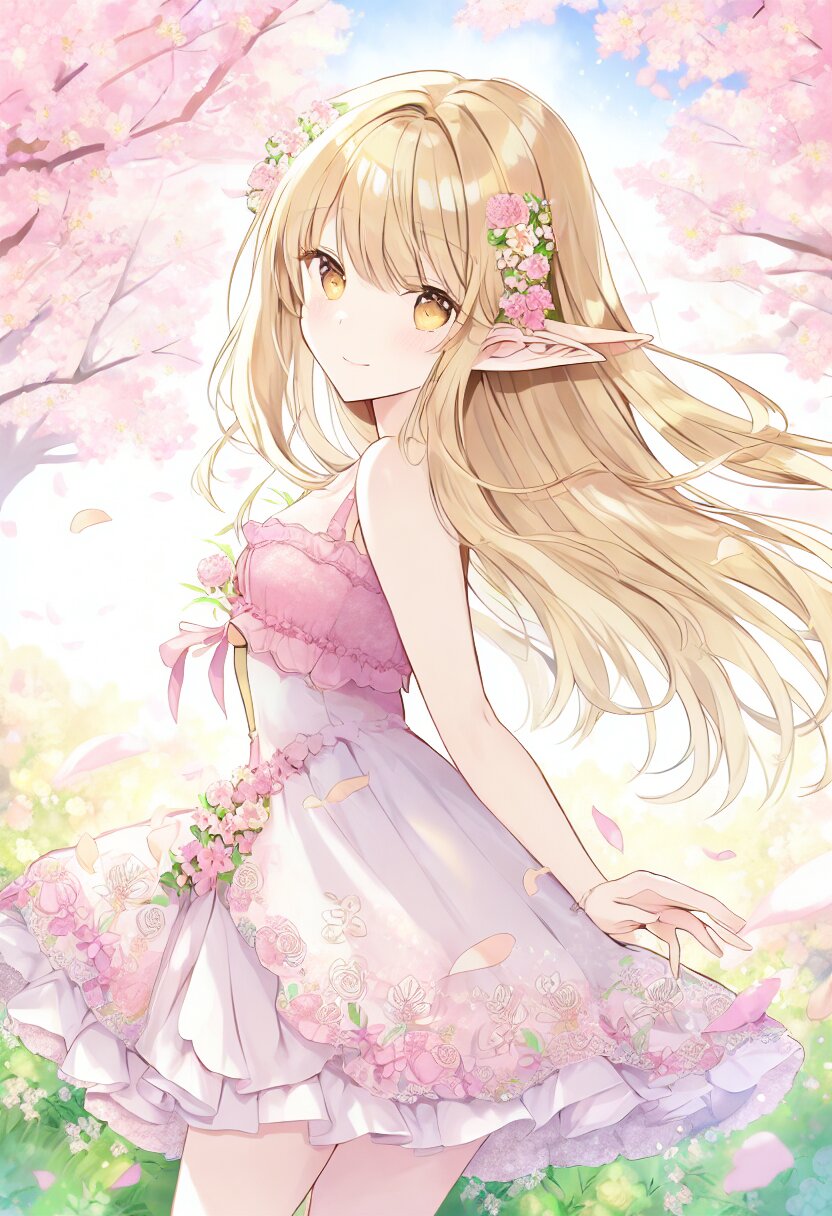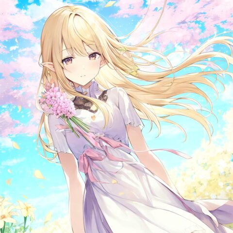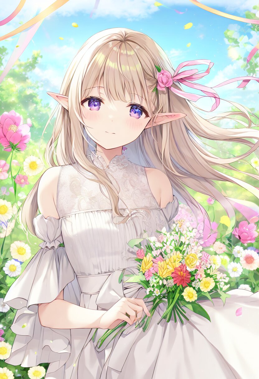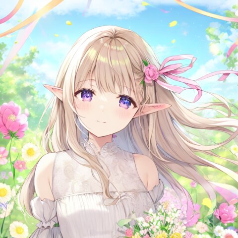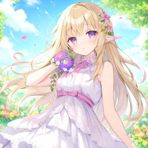very aesthetic, best quality, absurdres, "One afternoon, I met a cute elf girl in the flower garden." She has long, soft hair that is adorned with a pale pink ribbon. Her outfit is made of light silk and lace in pale tones that sway in the breeze as she moves gracefully. She wears a flower-inspired dress with corolla and petal decorations. She sits in the middle of a flower garden, surrounded by flowers of various colors. All around her are flowers of bright pinks, soft purples and gentle yellows. In her hand is a small bouquet of brightly colored butterflies that appear to be clustered together. In the background, you can see the blue sky and white clouds, and lush trees in the distance. The fields of flowers around her seem to sway and dance in the wind.., with blush cheeks, official art, {{ultra-detailed}}, {{high resolution}}, dynamic fuzziness, colorful, cowboy shot, underwear, girl ,solo, 20 years old,