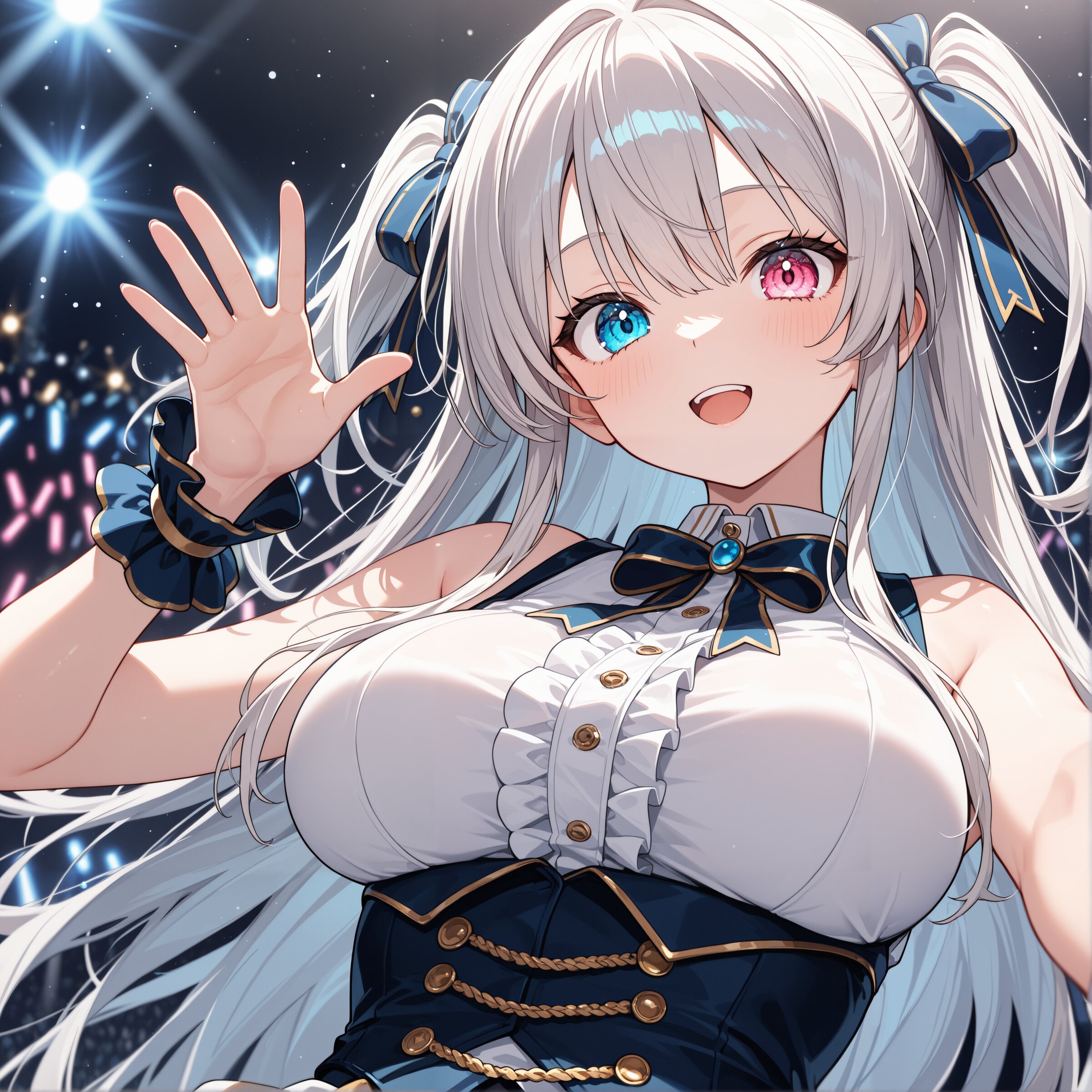 masterpiece,best quality,ultra detail,intricate detail,absolutely resolution,8k, newest,digital-cel,depth of field, rating safe, medium large breasts,silver hair,long hair,two side up,pink eyes,blue eyes,heterochromia,, anime illustlation,cute, idol clothes,