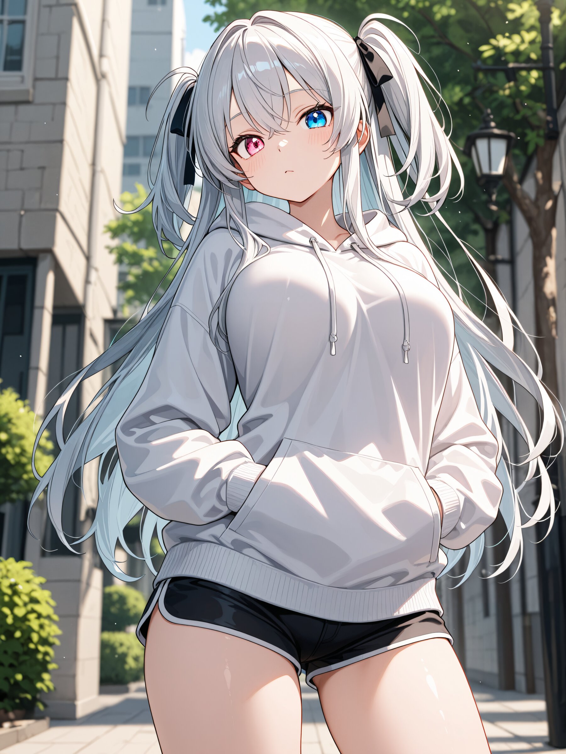 rating safe, medium large breasts,silver hair,long hair,two side up,pink eyes,blue eyes,heterochromia,, outdoors,leg focus, hoodie,short pants, anime illustration,cute,,masterpiece,best quality,ultra detail,intricate detail,absolutely resolution,8k, newest,digital-cel,depth of field,