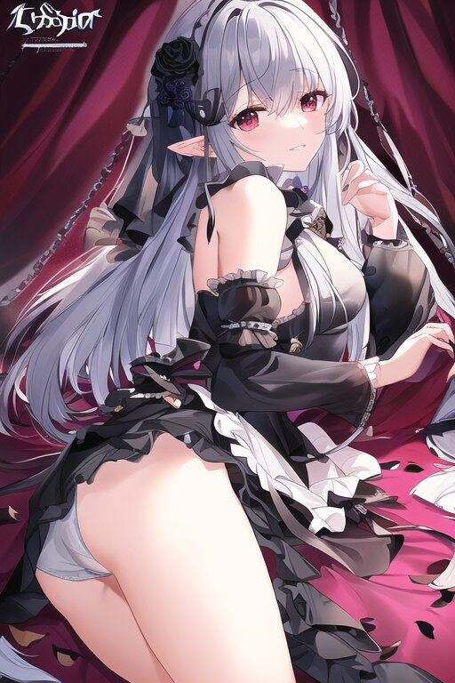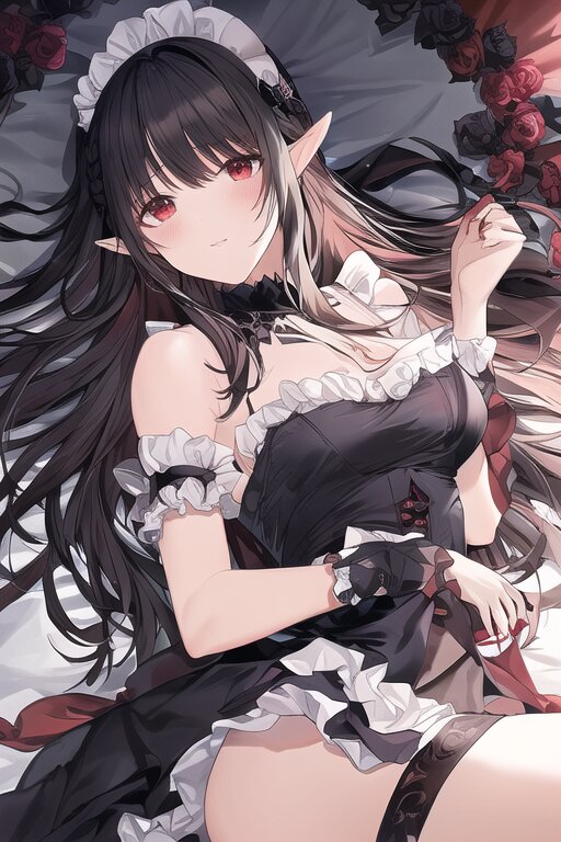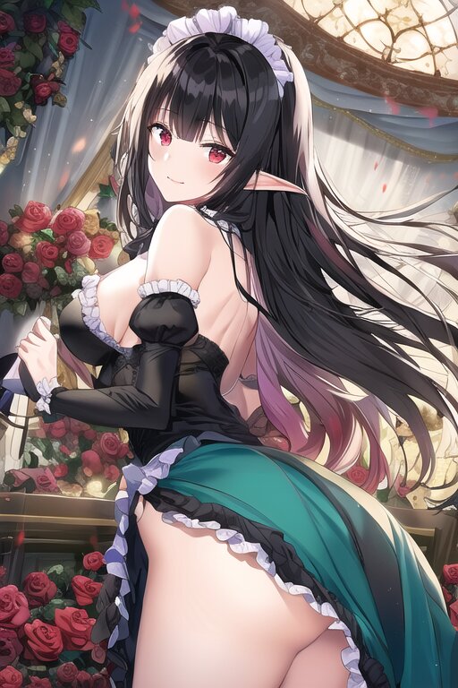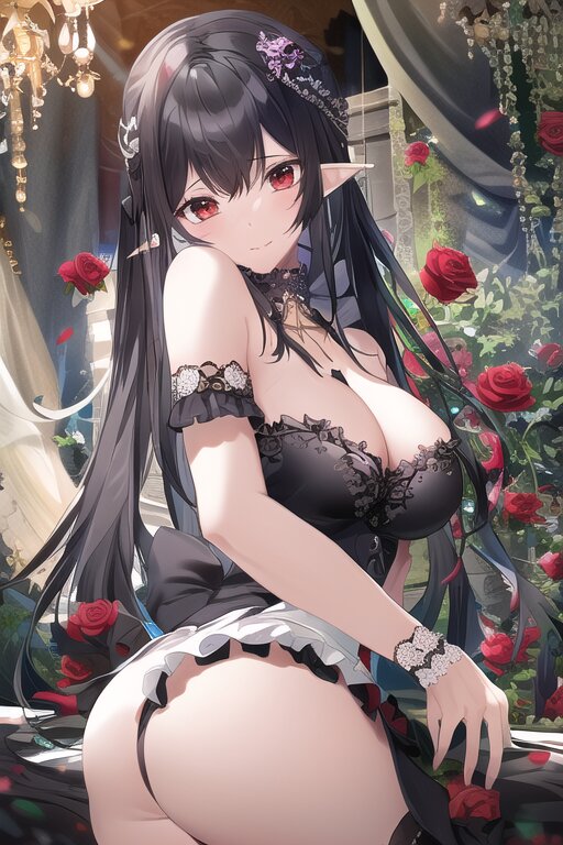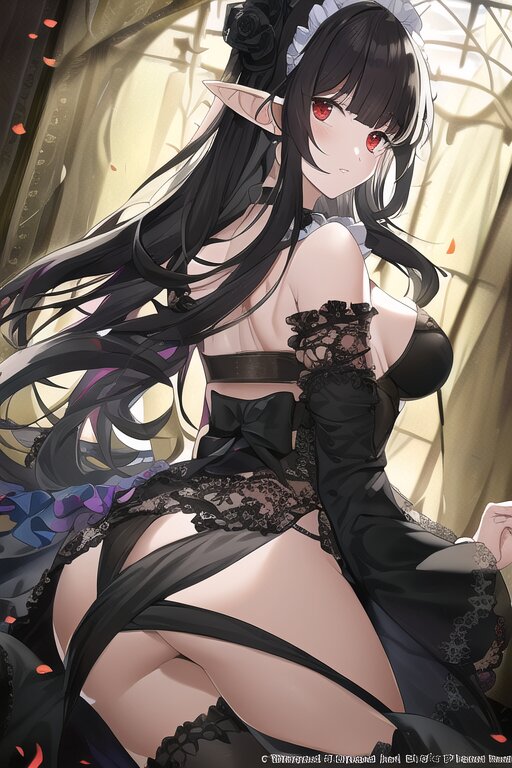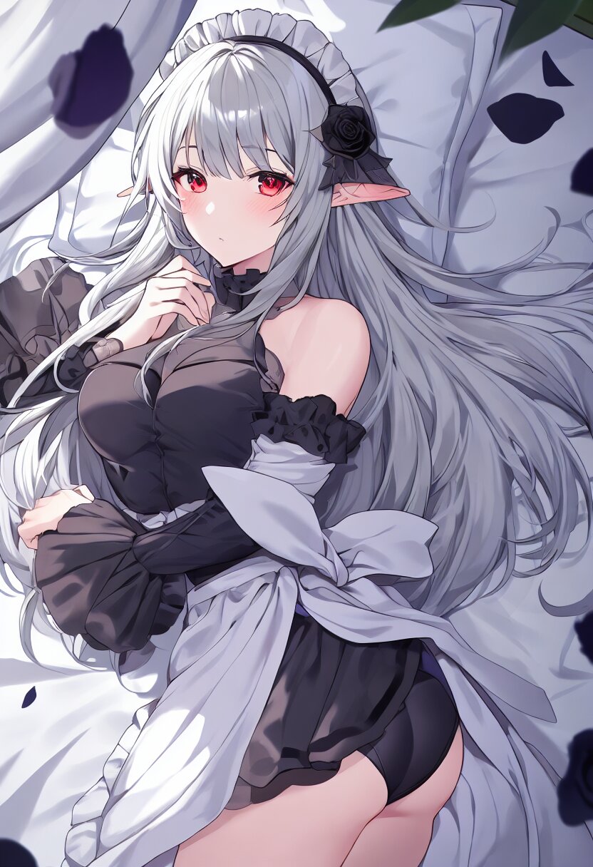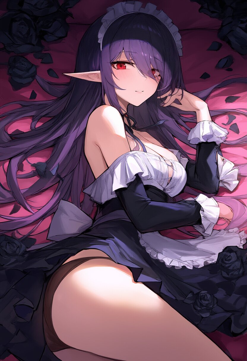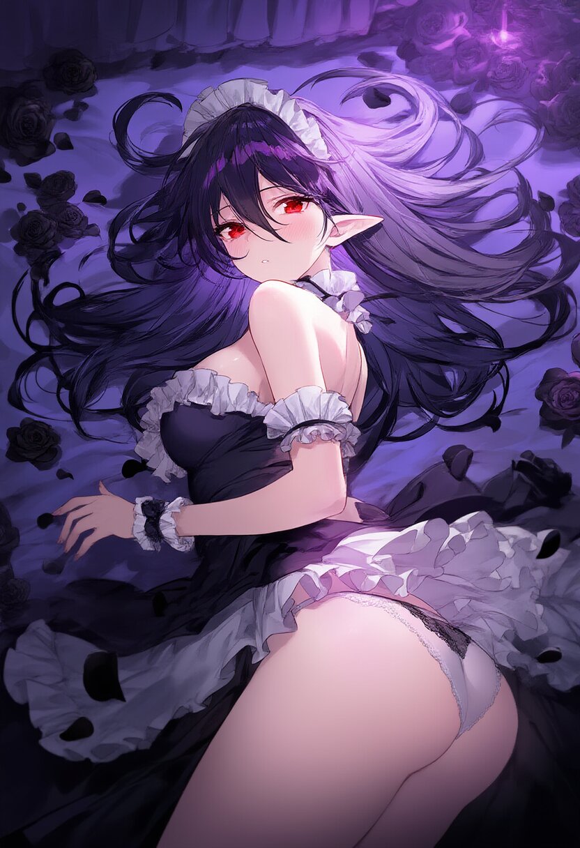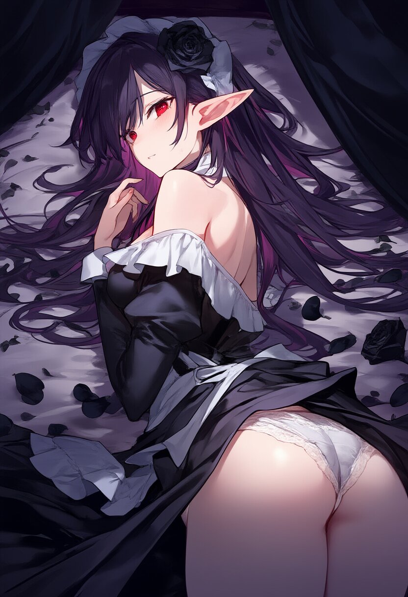 elf, solo, black rose, too many black petals dancing in the air, dark purple long hair, red eyes, maid, ass, bare shoulder, upper body, Ruffled trim and frill sleeves, black rose, lying on canopy bed , with blush cheeks, official art, {{ultra-detailed}}, {{high resolution}}, dynamic fuzziness, colorful, cowboy shot, underwear, girl ,solo, 20 years old, beautiful detailed hair, beautiful detailed eyes, , rating:general, best quality, very aesthetic, absurdres