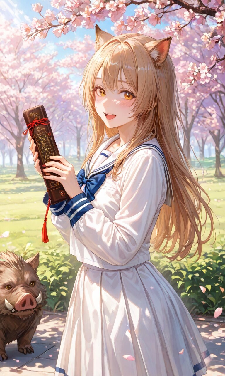 score_9, score_8_up, score_7_up, source_anime, 2d, semi-realistic, unity engine. masterpiece, high resolution, extremely detailed, detailed background, nice hands, perfect hands, perfect anatomy, perfect structure, sharp focus, high angle, from side. BREAK (The theme is graduation ceremony). she is holding a black paper tube containing his diploma. BREAK (on a early Morning, A passionate gaze. open mouth, happy smile face with gaze at me), outdoors, 1girl, she stays in Warm sunlight pours down, a gentle breeze blows, and petals flutter down the rows of cherry blossom trees. cowboy shot, ultra detailed lips, ultra detailed face and hair, kawaii, adorable, cute, blush, Estrus season, Moist eyes. (light brown hair, long hair, amber eyes, wild boar's ears, long sleeves school uniform). school Sailor uniform.