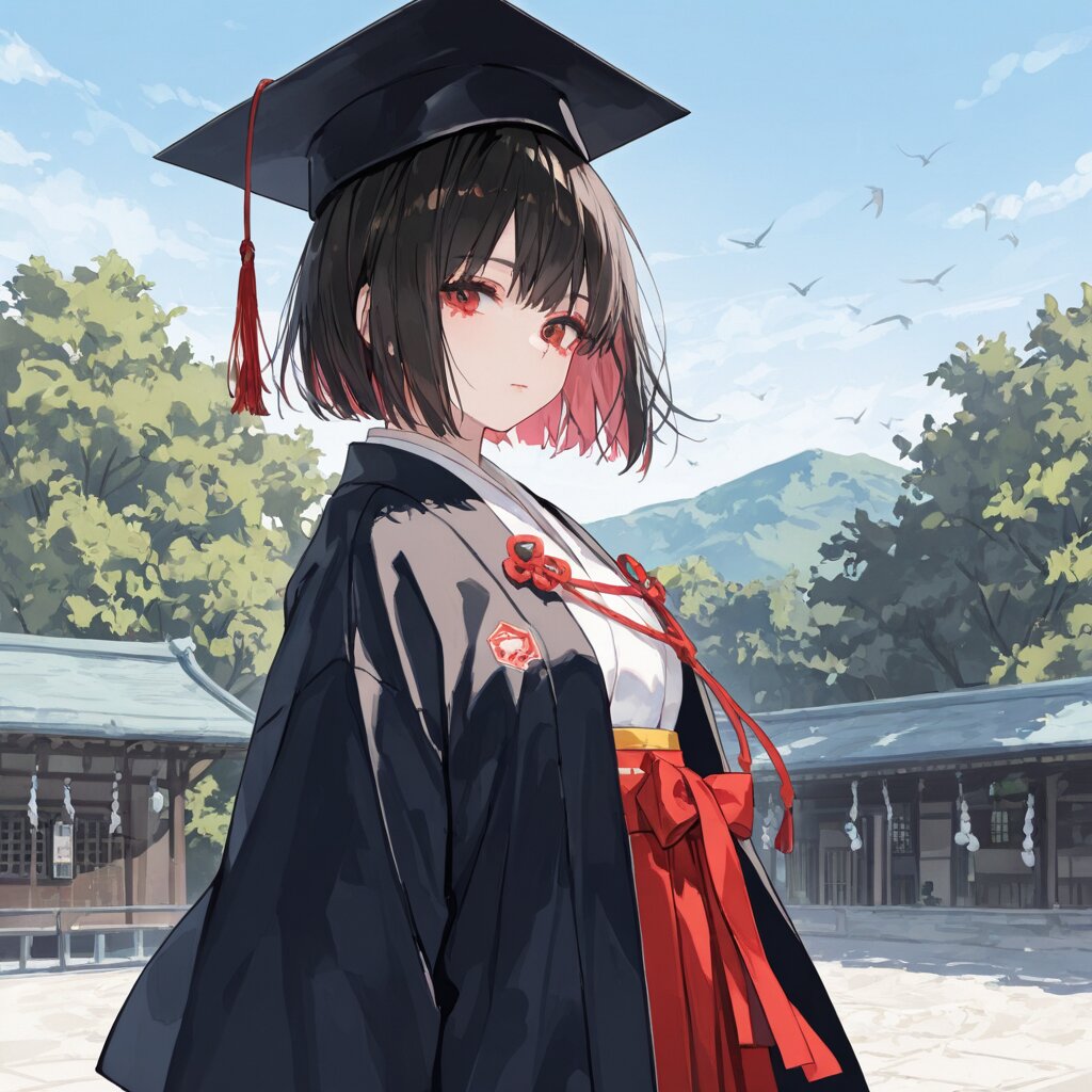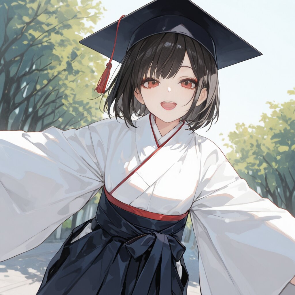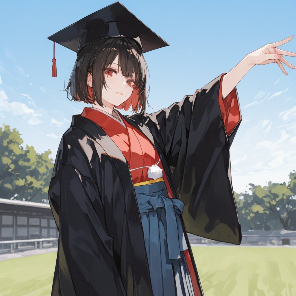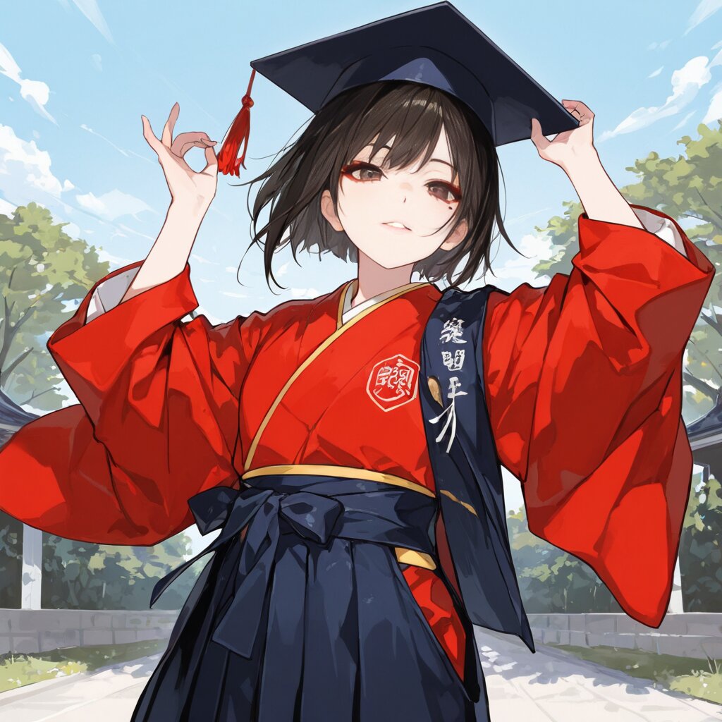 score_9, score_8_up, score_7_up, (best quality:1.2), hakama, mortarboard, natural makeup, traditional Japanese aesthetics, jump, outdoors background