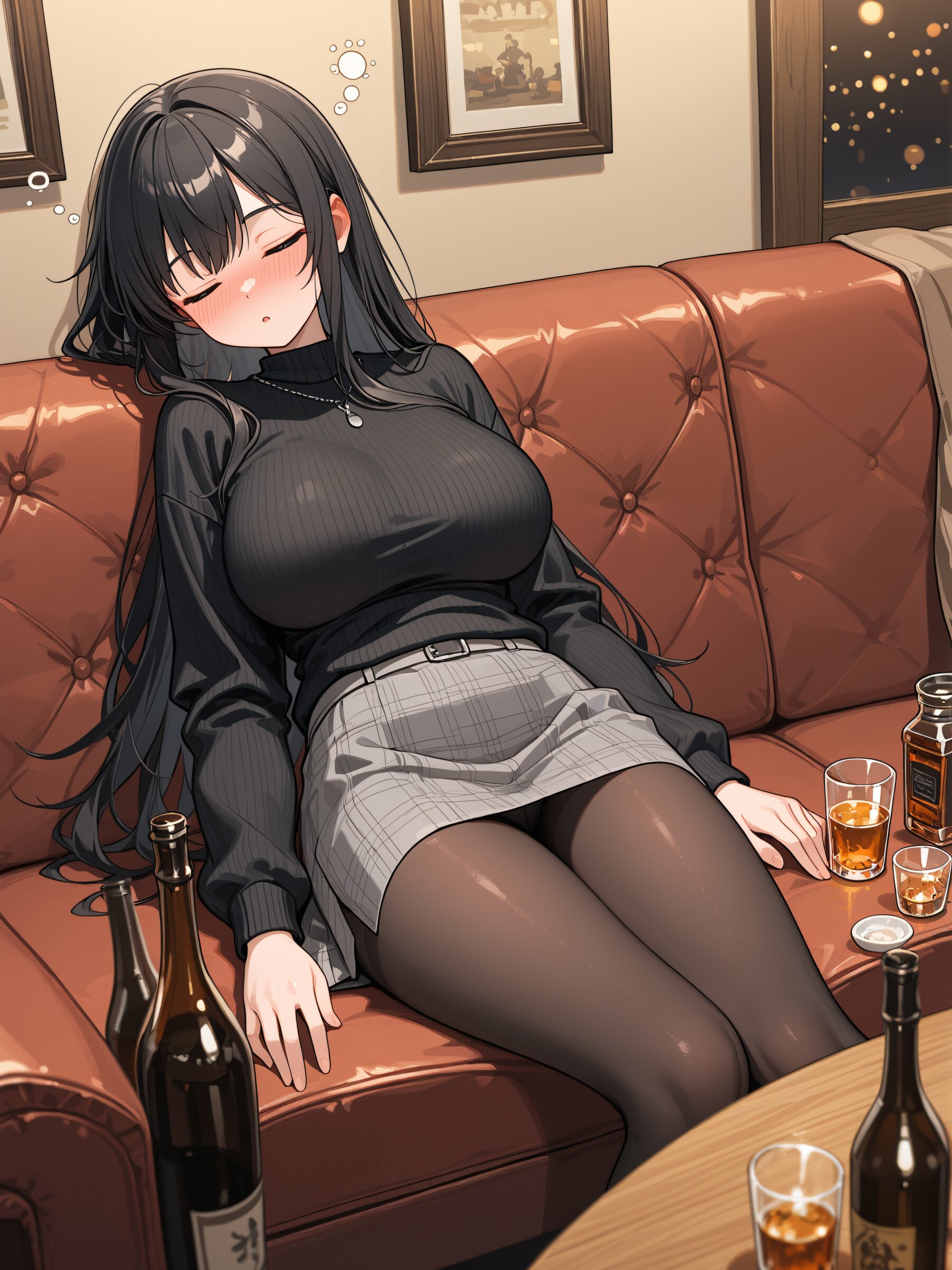 rating safe, large breasts,black hair,long sidelocks,, pub,table,couch,on couch, black sweater,gray skirt,pantyhose, drunk,sleep, anime illustration,cute,,masterpiece,best quality,ultra detail,intricate detail,absolutely resolution,8k, newest,digital-cel,depth of field,