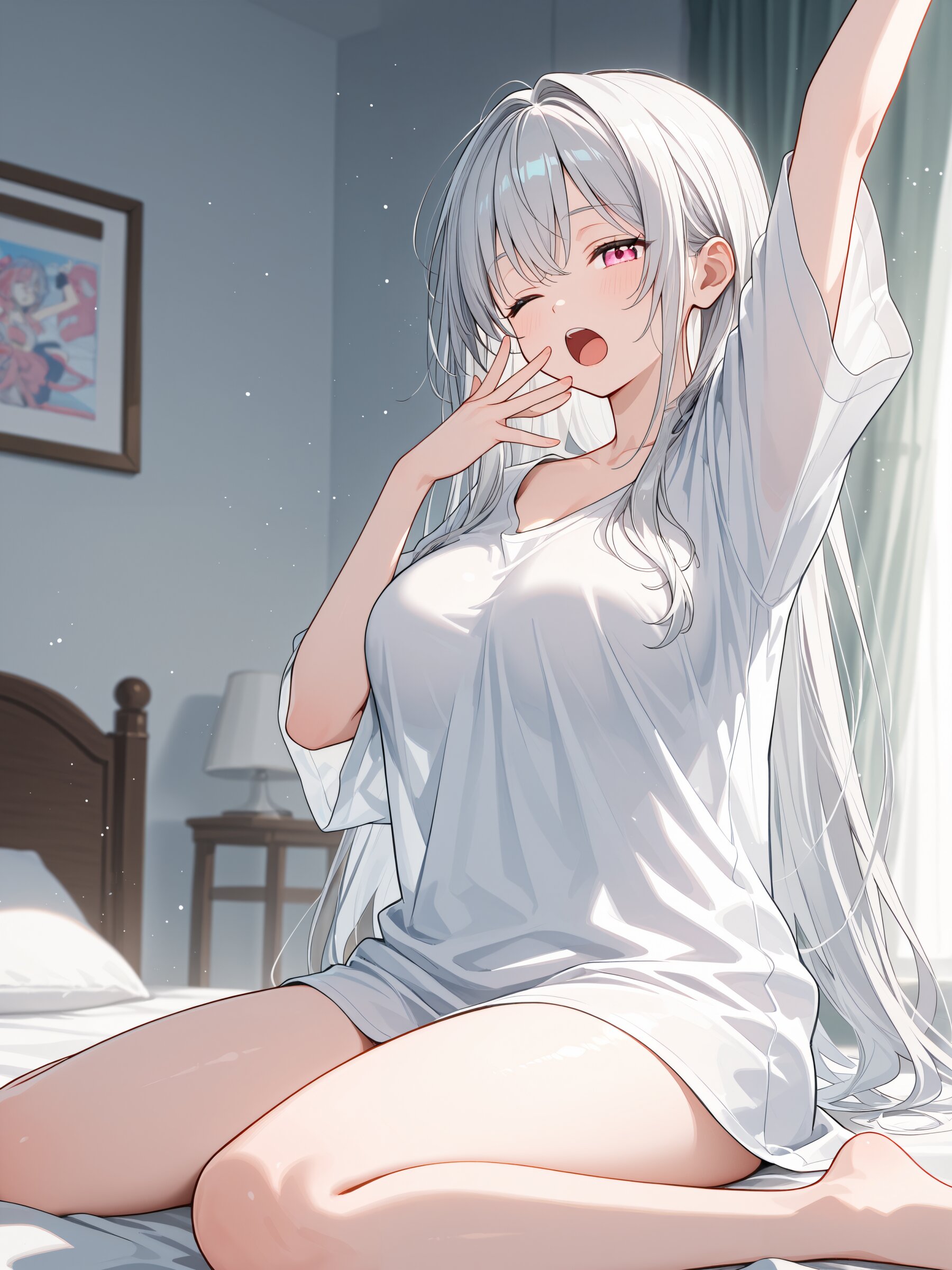 rating safe, medium large breasts,silver hair,long hair,pink eyes, on bed, wake up,wariza,arm up,hand,yawning, anime illustration,cute,,masterpiece,best quality,ultra detail,intricate detail,absolutely resolution,8k, newest,digital-cel,depth of field,