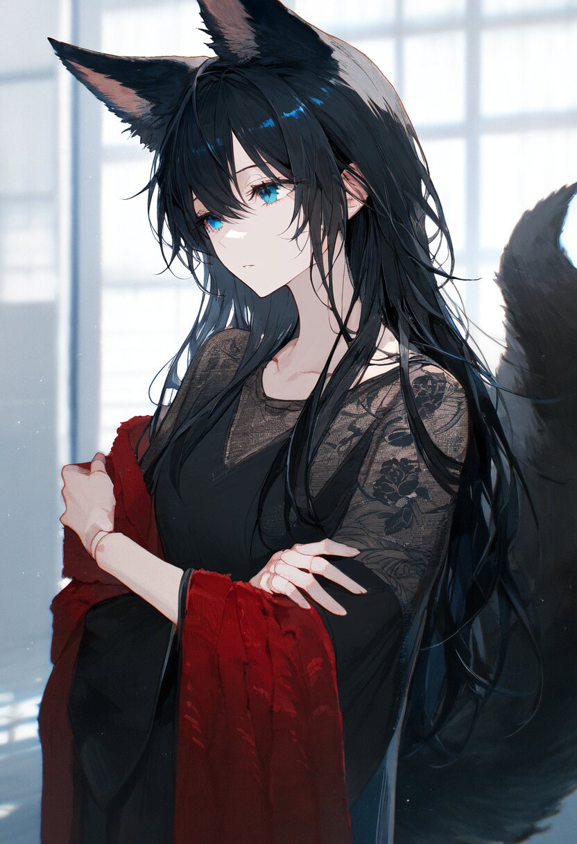{{{amazing quality}}}, {{{ultra detailed}}}, {{{very aesthetic geme cg}}}, {{{high resolution}}}, {{{detaild intricate}}}, {{{absurdres}}}, {{{high quality}}}, {{{very aesthetic clear blue metallic eyes}}}, beautiful detailed eyes, {{{very aesthetic face}}}, {{{very aesthetic woman}}}, {{{very aesthetic black hair}}}, {{{very aesthetic body}}}, from side, 1girl, sumi-e, adult, perfect anatomy, smooth and silky hair, straight hair, silky skin, lipgloss, cool, sharp, depth of field, fox girl, sharped black fox ears, fox tail, come hither, eyelashes, collarbone, ukiyo-e, slit pupils, pale skin, dutch angle, mechanical arms, doll joints,