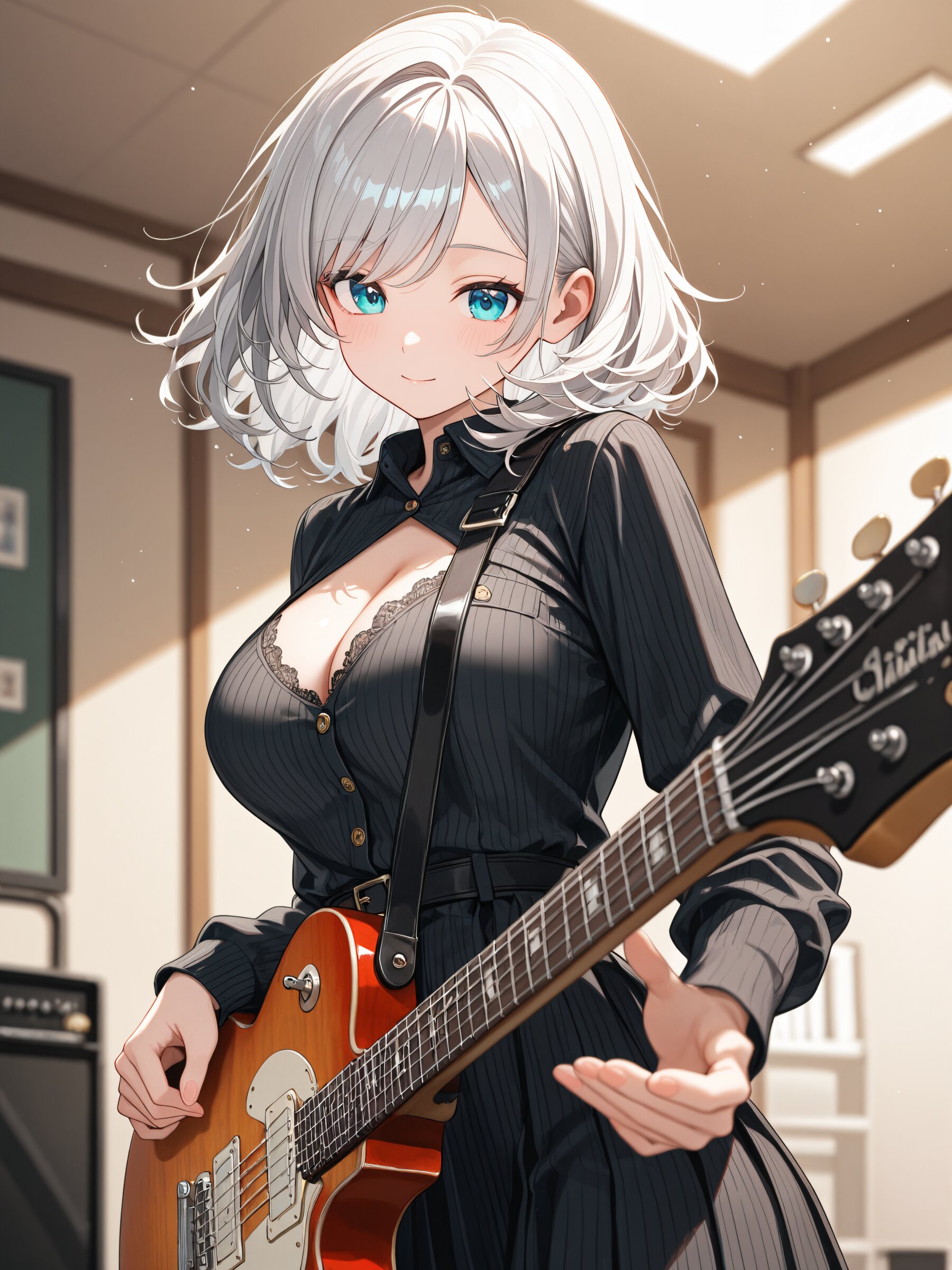 rating safe, silver hair, medium hair, swept bangs,fluffy hair,medium-large breasts,, guitar, gibson les paul, anime illustration,cute,detailed beautiful eyes,masterpiece,best quality,ultra detail,intricate detail,absolutely resolution,8k, newest,digital-cel,depth of field,