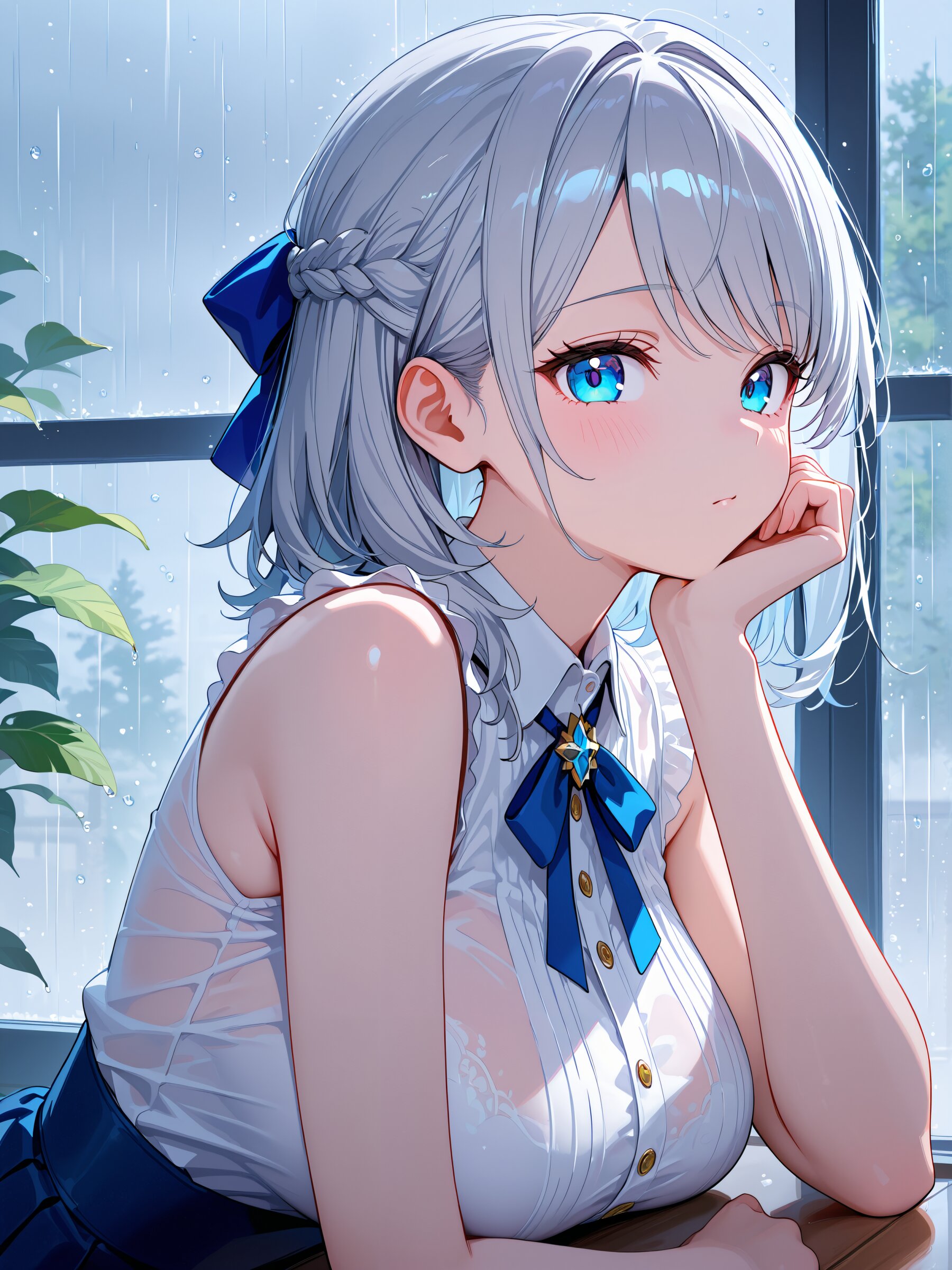 rating safe, silver hair, medium hair, swept bangs,half updo,side braid, blue eyes,medium-large breasts,, indoors, window,rain,looking at window, head rest, hand on own chin, cute face,,masterpiece,best quality,ultra detail,intricate detail,absolutely resolution,8k, newest,digital-cel,